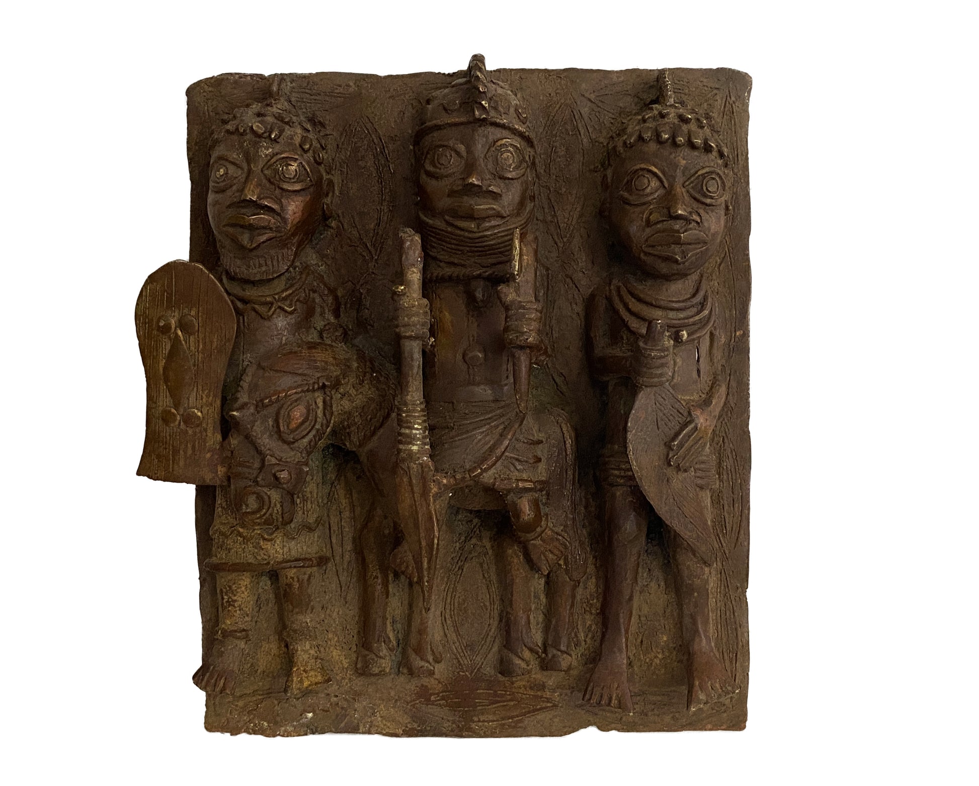 Superb Bronze plaque with the king warrior and soldiers , the ruler of Benin. Created by the lost wax method, Each piece is an original since the mold is broken after each one has been cast..11.5"w x 12.5" H by 3 " D .