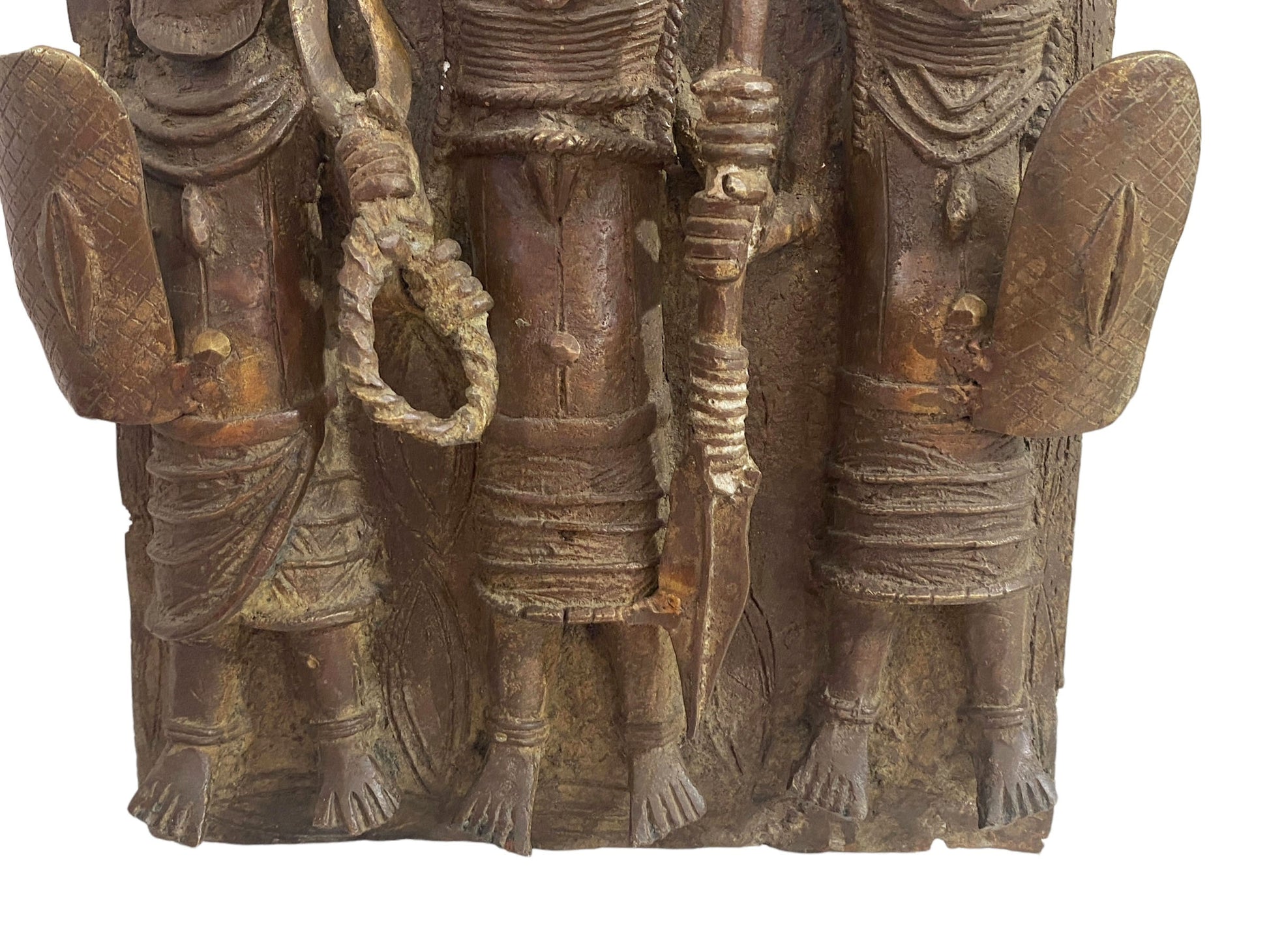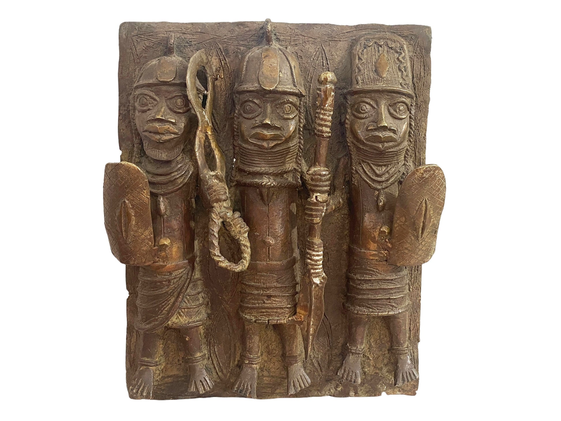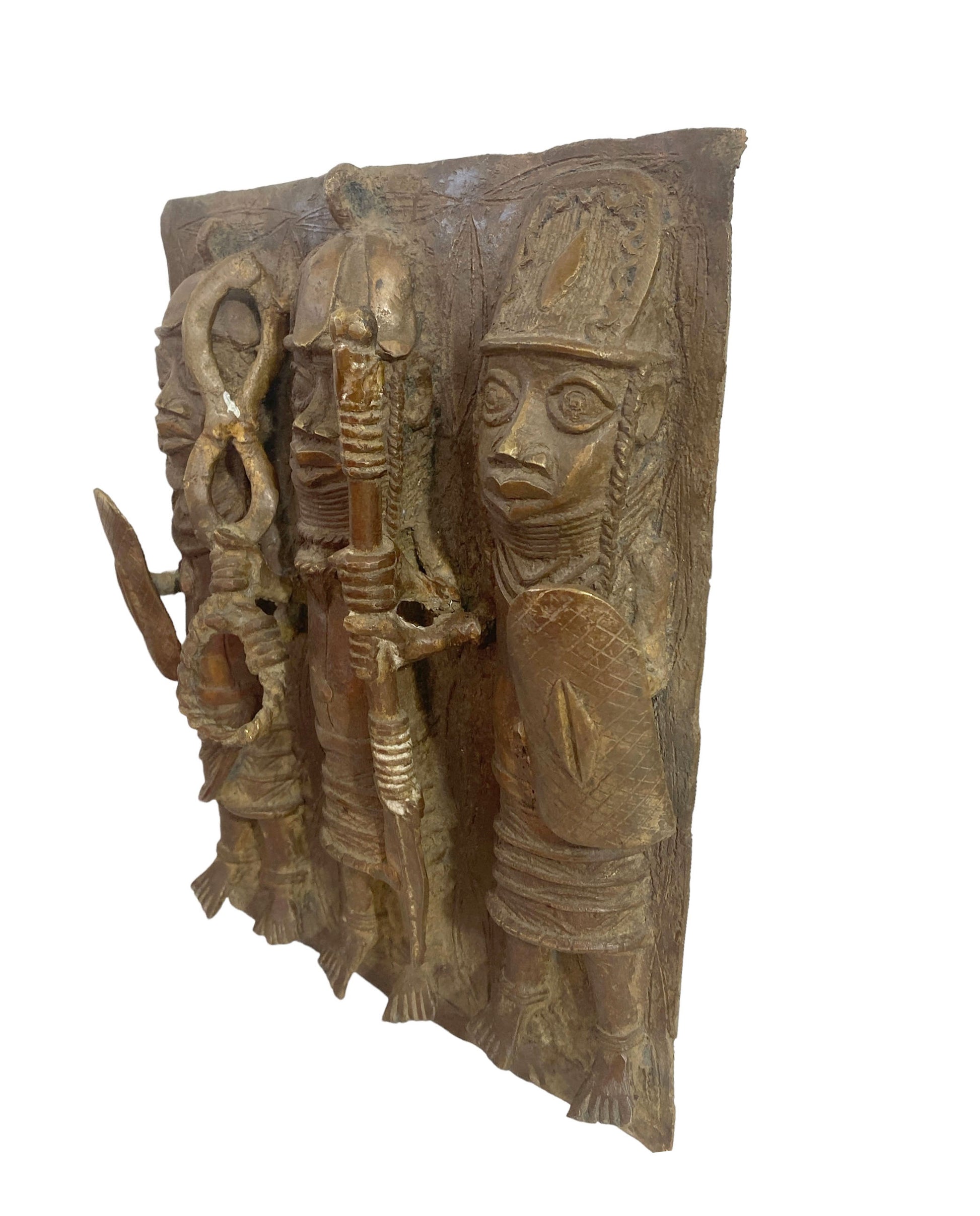 #3929 Vintage African Benin Bronze Plaque W/ Warriors 13.5" H