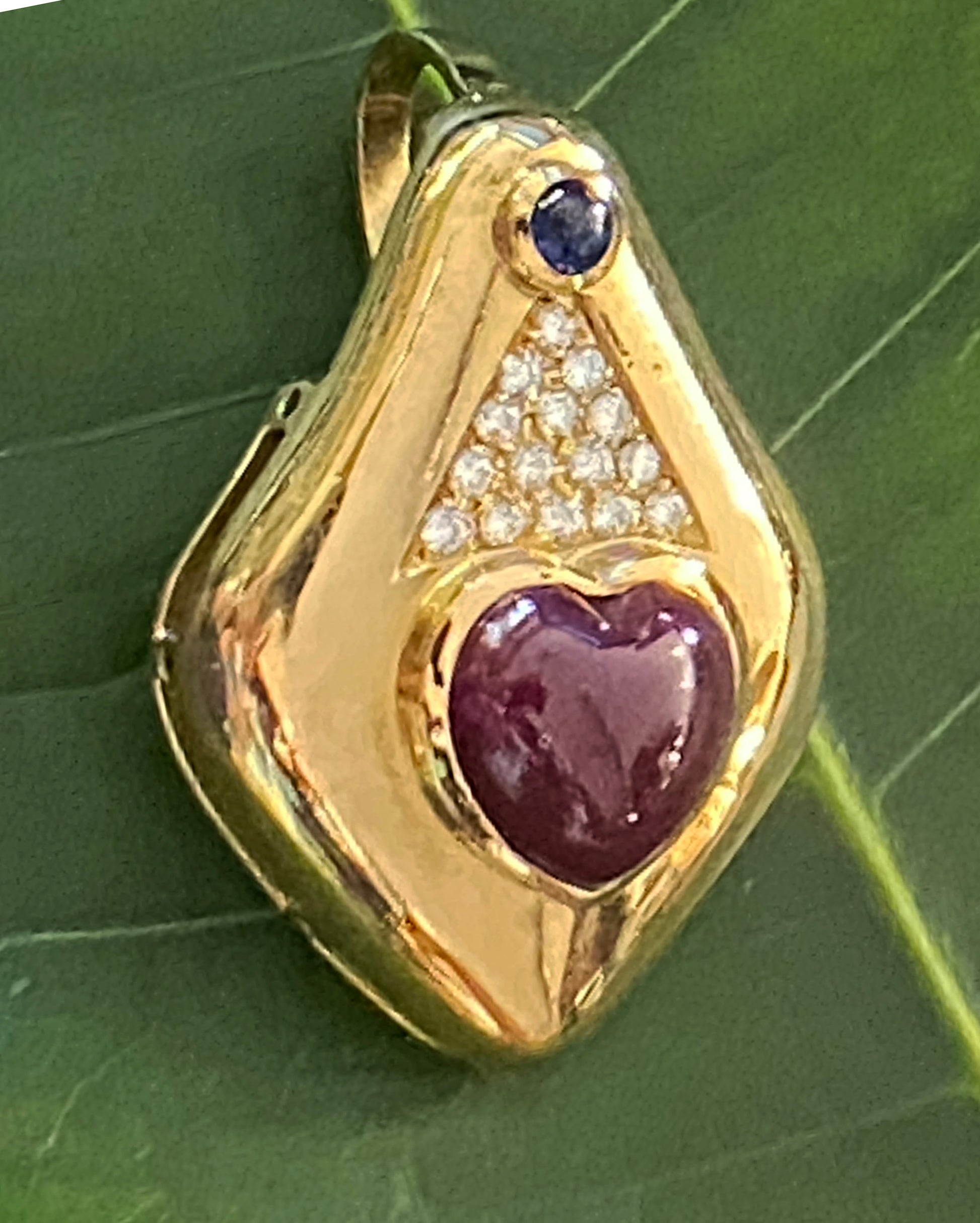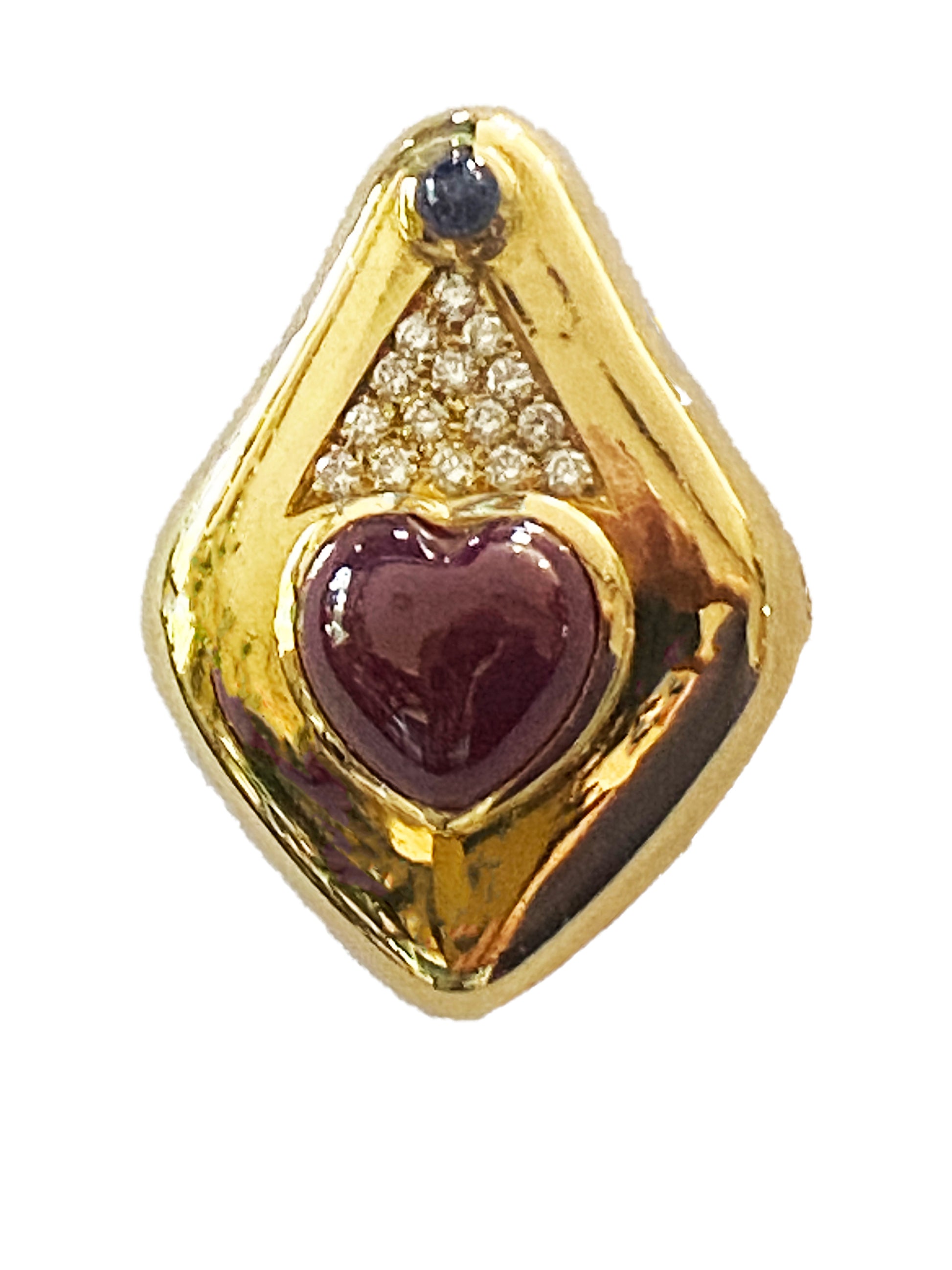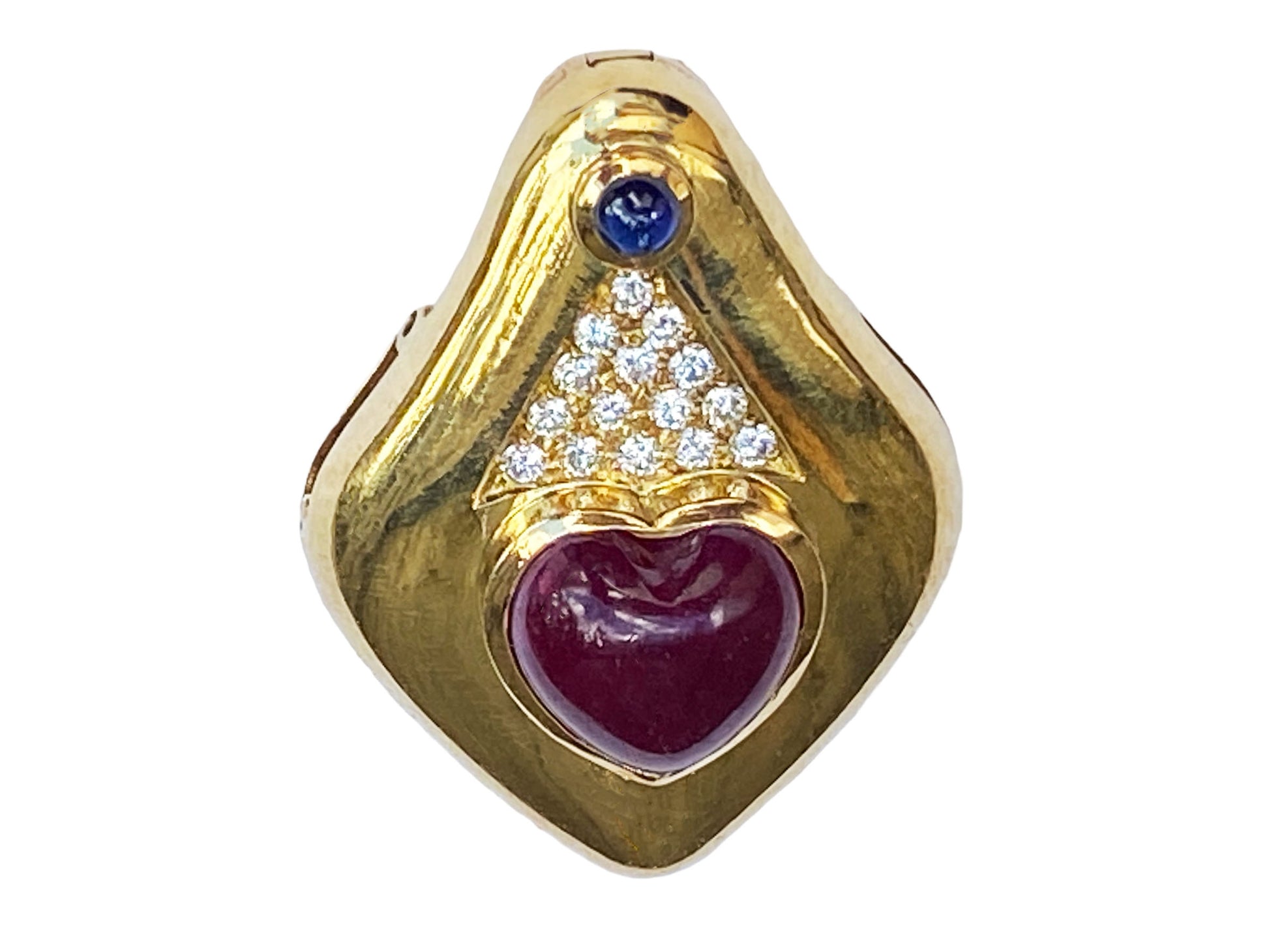 This exemplary 18k yellow gold dome pendant is 38mm by 28mm in size. It is beautifully adorned with a fair-grade 12mm heart cut cabochon ruby, accented by 15 bead-set 1.7mm full-cut diamonds, with H color and VS clarity. Additionally, a 3mm medium-f/fine round cabochon cut sapphire is bezel-set, with a gold weight of 9.4dw/14.61 grams.