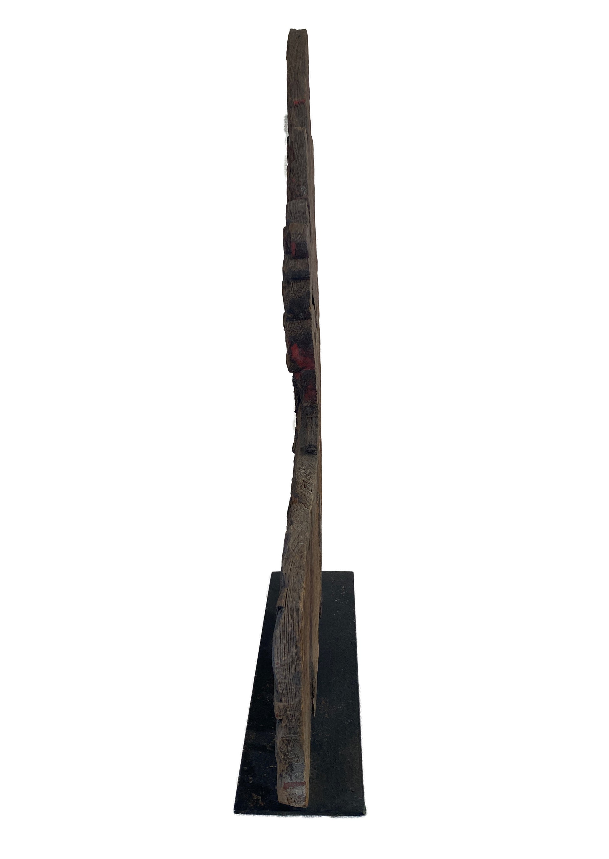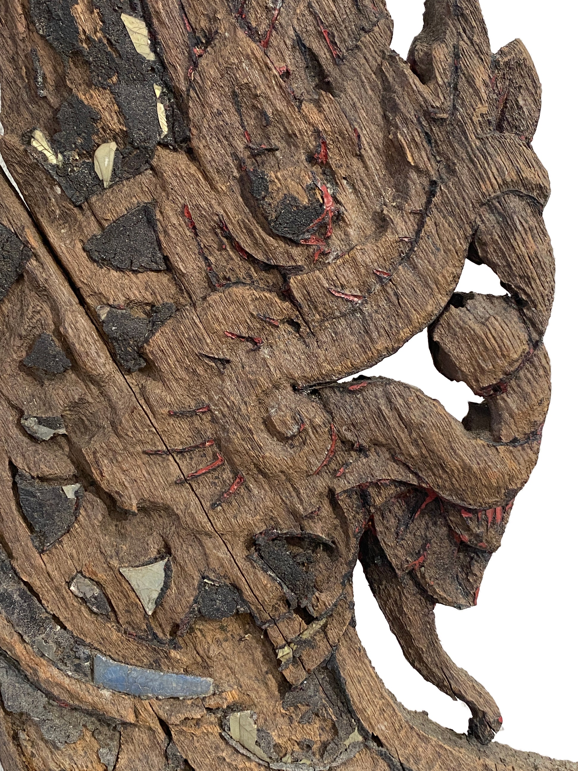 Southeast Asia, Naga is known as the king snake, the ruler of the underworld waterways (the Chinese equivalent is Dragon). In many Northern Thai temple stairway, naga was frequently used to decorate the roof finials, handrails of important buildings as an auspicious ornament. To make the naga, a large, heavy piece of teak wood was carved in its curving shape, Visible wear and natural distress from age 31.5" H by 12" w by 1" D