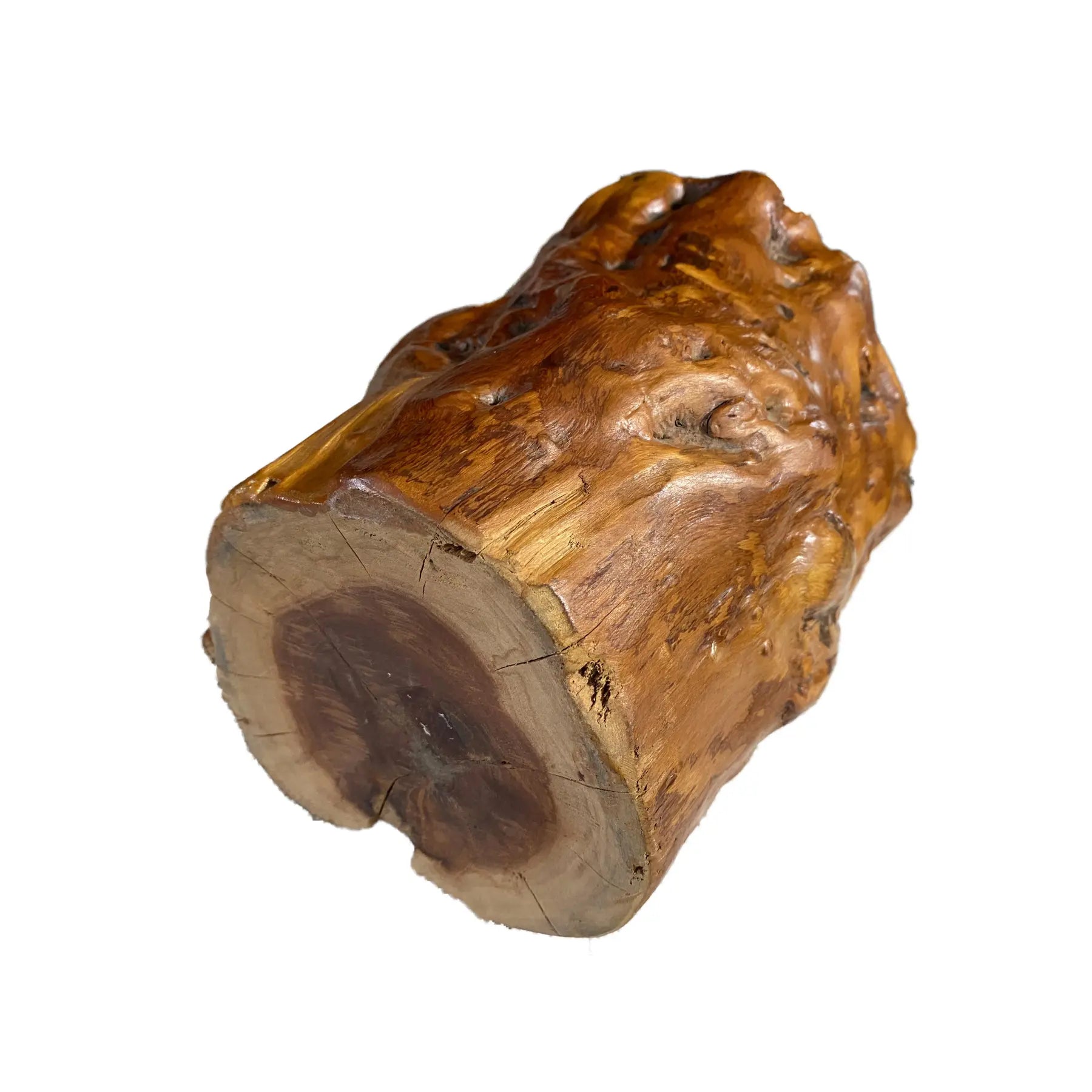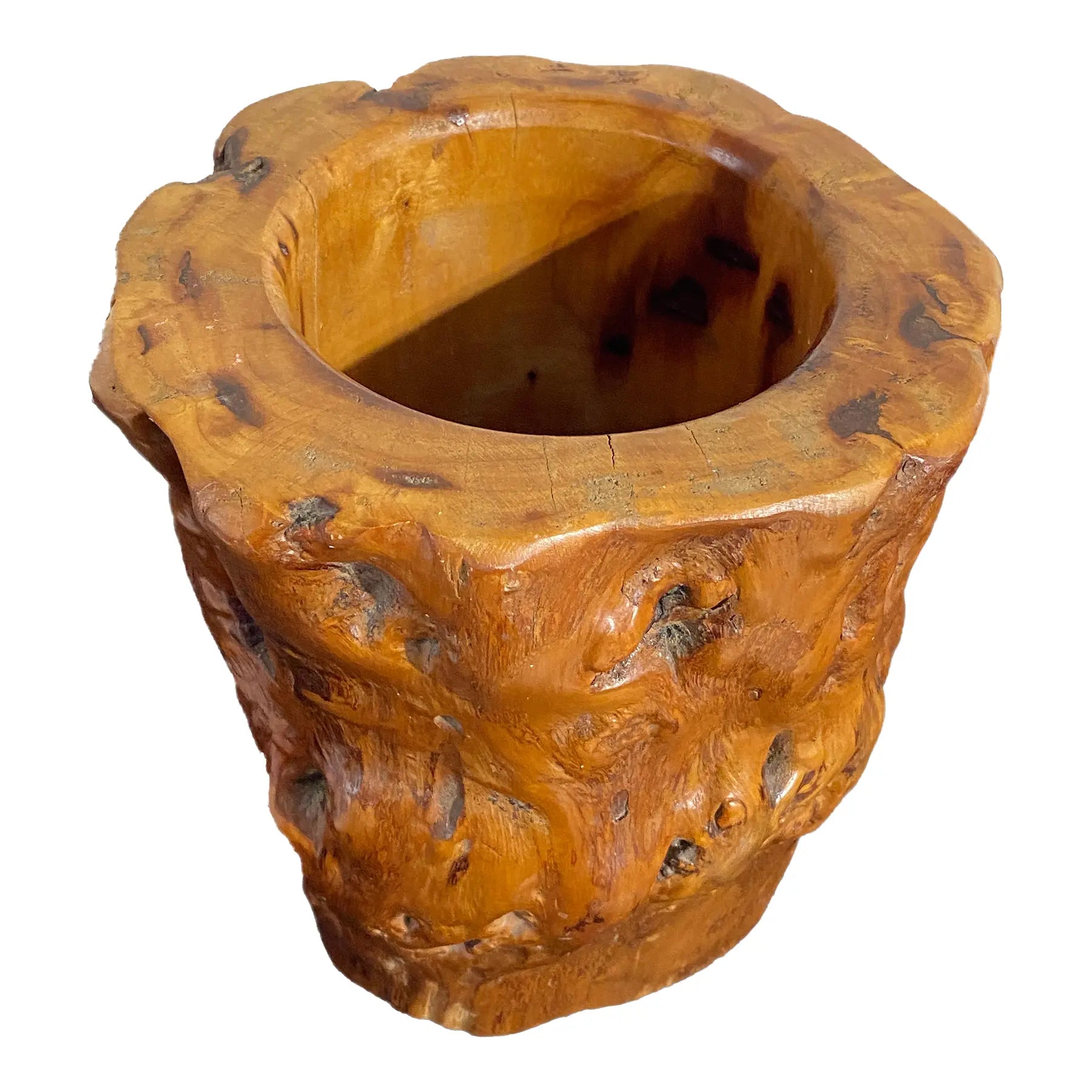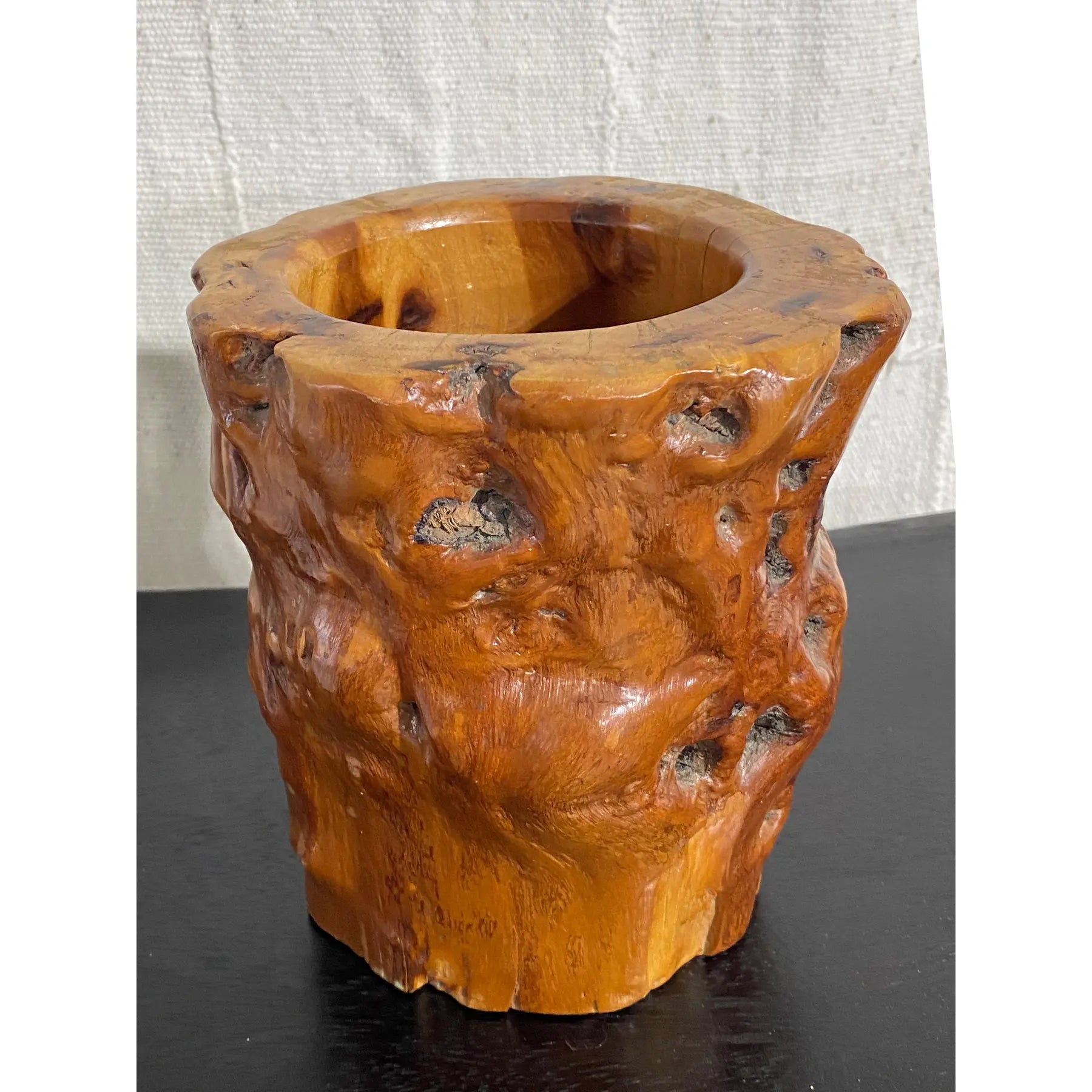 This exceptional Chinoiserie scholar's brush and pen holder in solid natural wood Measuring 6.75"diameter and standing 7.5" tall, the cylindrical form showcases warm brown tones . A minor wood opening is present and visible in the photographs, consistent . The piece remains in overall good condition, making it a distinguished addition to any collection of Asian decorative arts or scholar's desk accessories.
