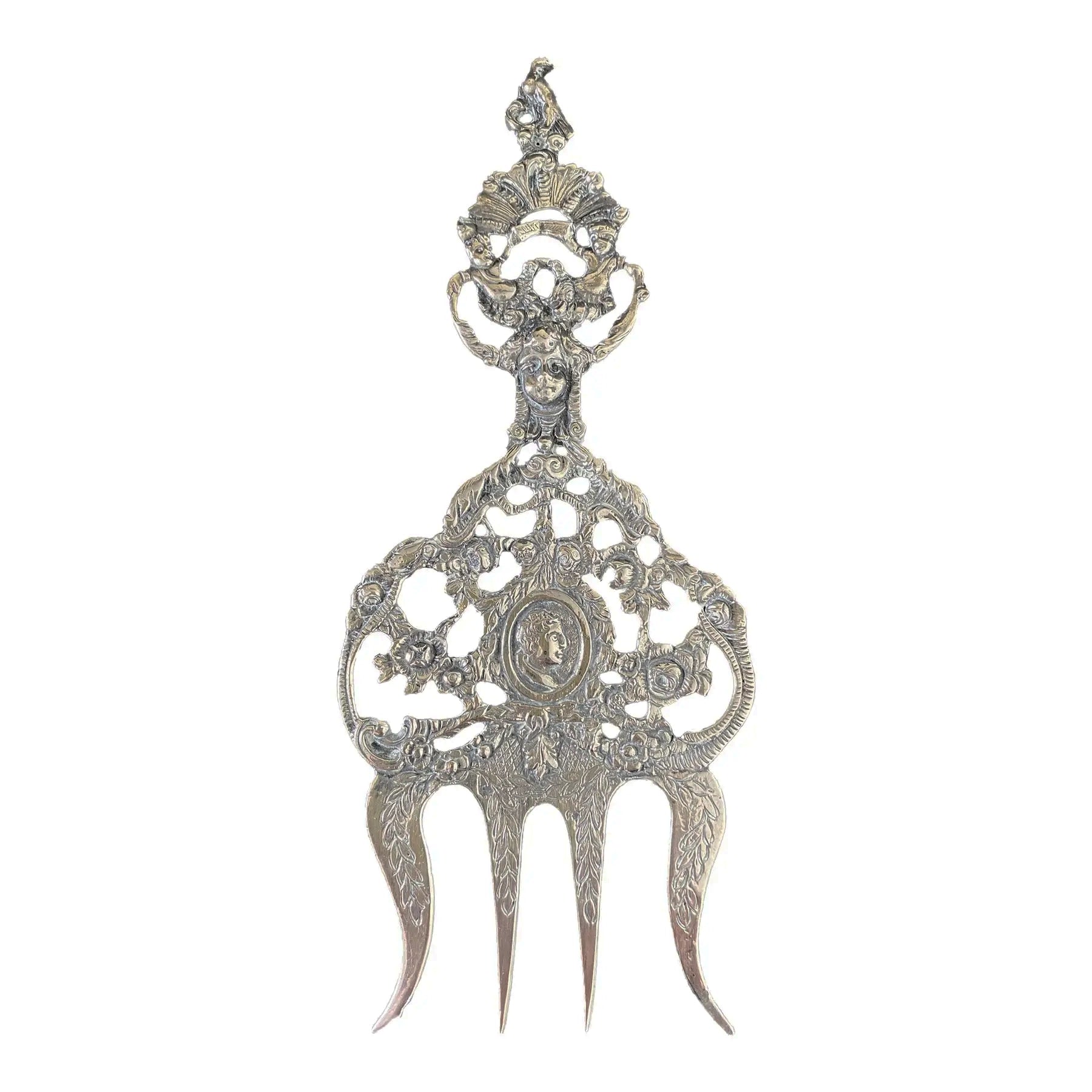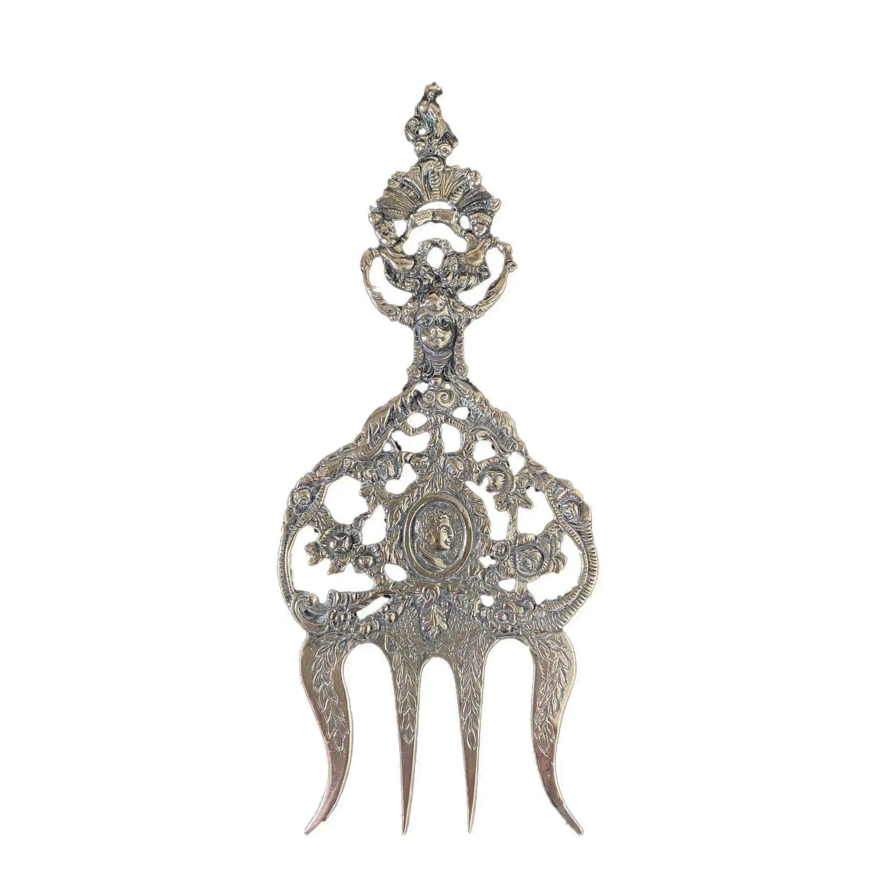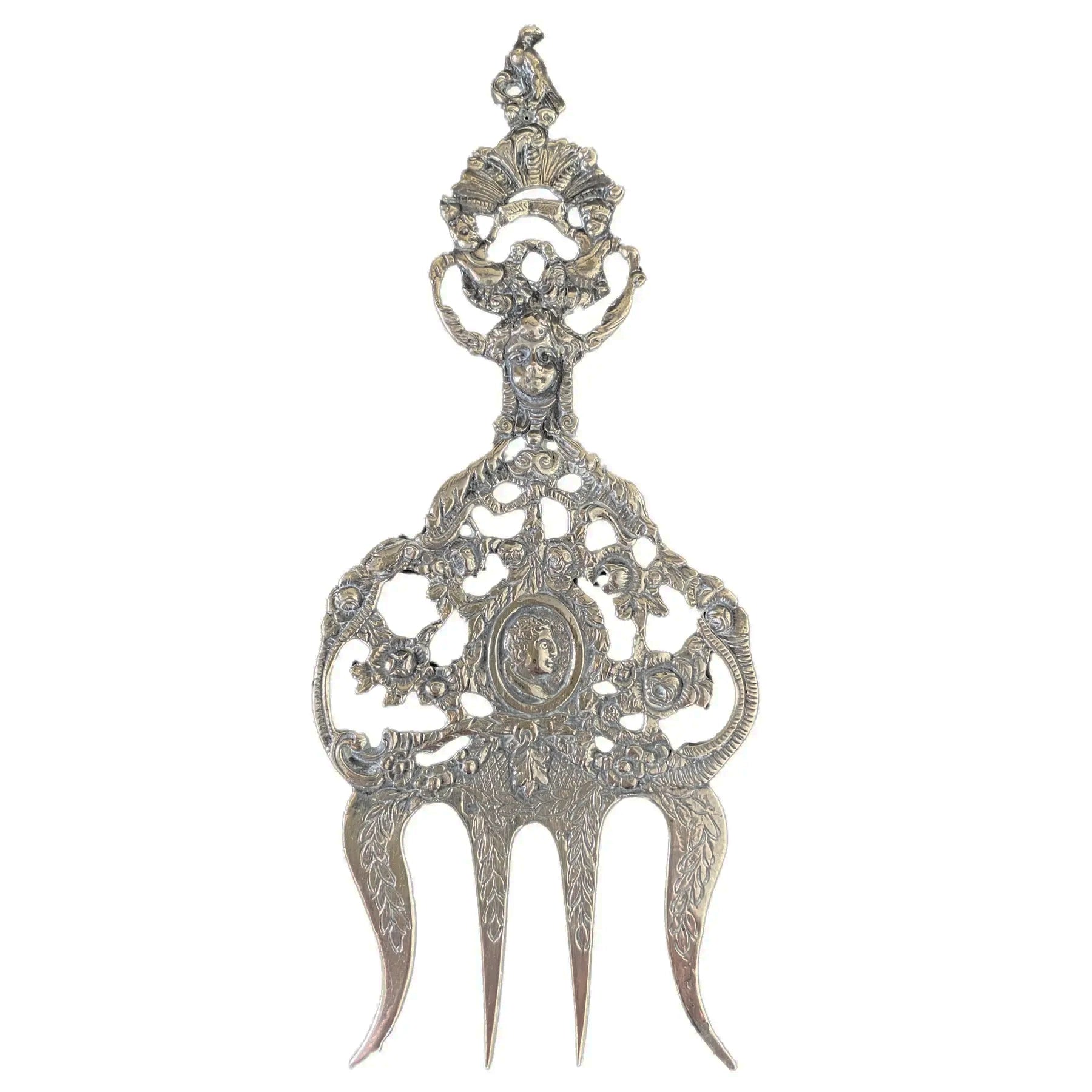 This exceptional silver comb from Finland, dating to circa 1865, features finely detailed high relief artwork. At the top, an angel’s head is beautifully rendered, while the central motif showcases a regal head framed by roses. Measuring 7" high by 2.75" wide and 0.1" thick, this marked piece is a distinguished example of period craftsmanship. For authentication, refer to Tardy, page 116, for the hallmark. A remarkable acquisition for serious collectors.