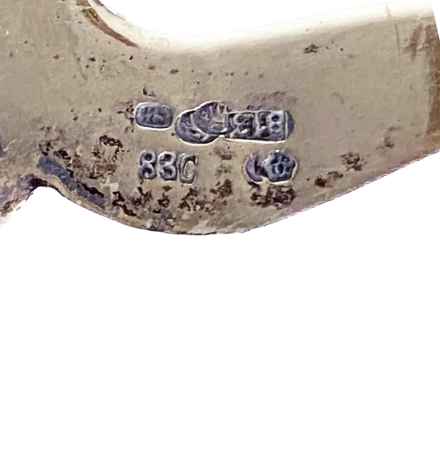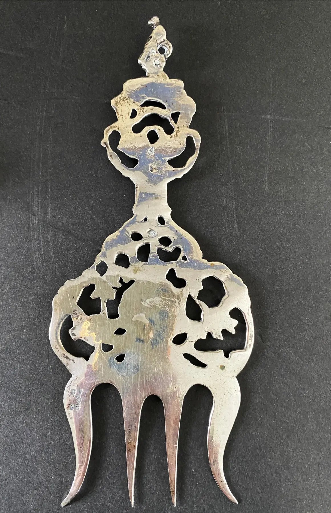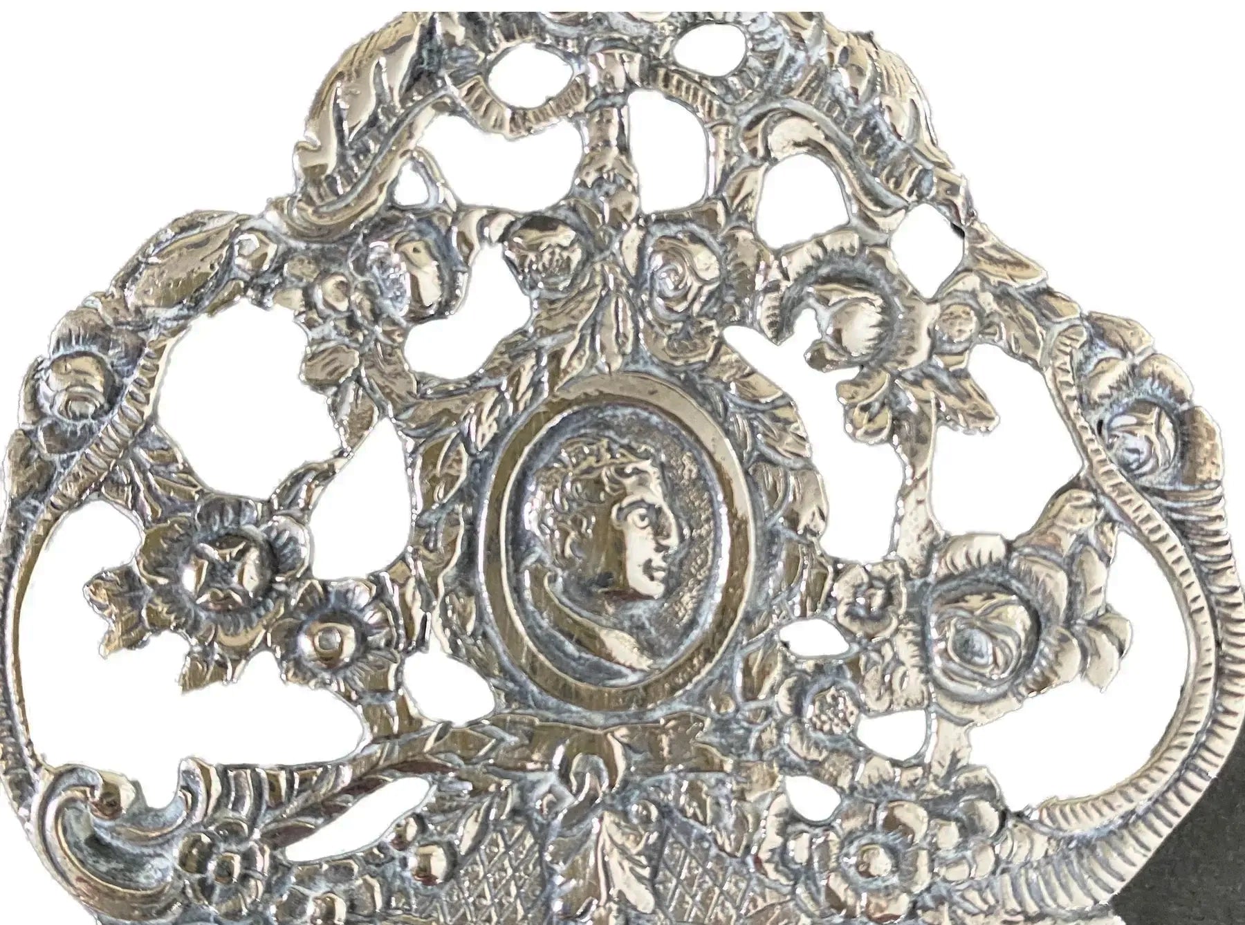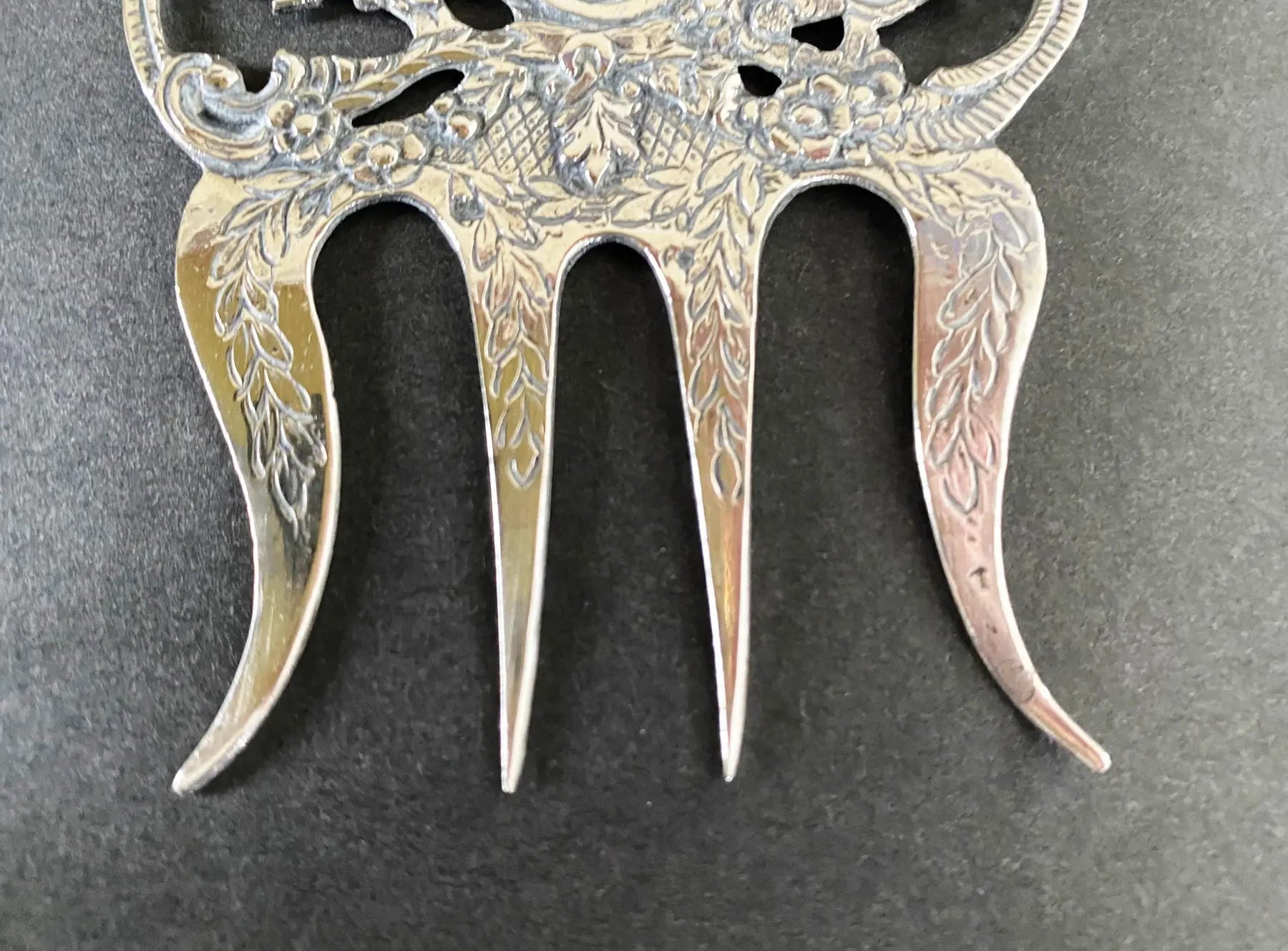 This exceptional silver comb from Finland, dating to circa 1865, features finely detailed high relief artwork. At the top, an angel’s head is beautifully rendered, while the central motif showcases a regal head framed by roses. Measuring 7" high by 2.75" wide and 0.1" thick, this marked piece is a distinguished example of period craftsmanship. For authentication, refer to Tardy, page 116, for the hallmark. A remarkable acquisition for serious collectors.