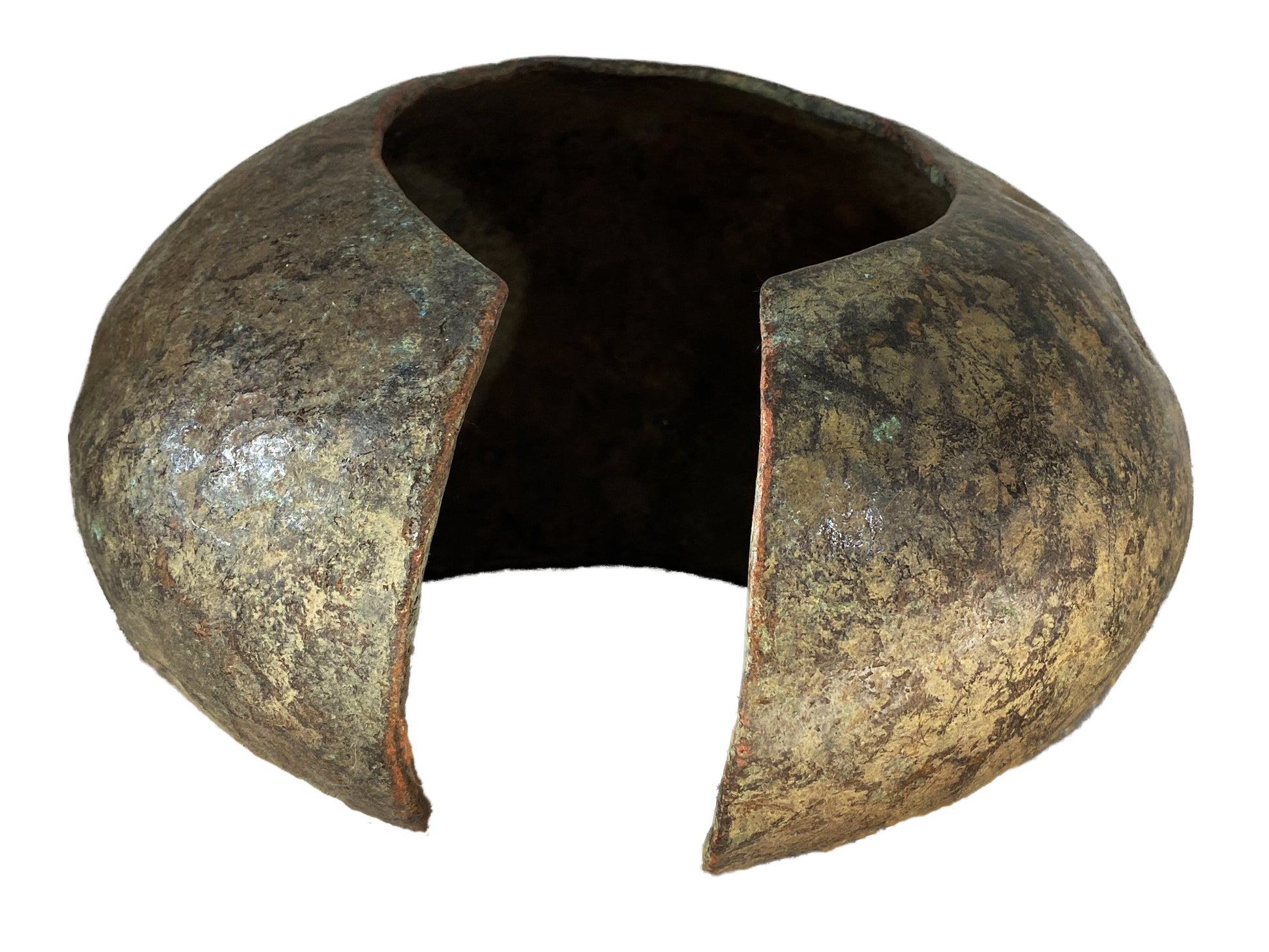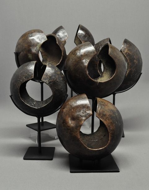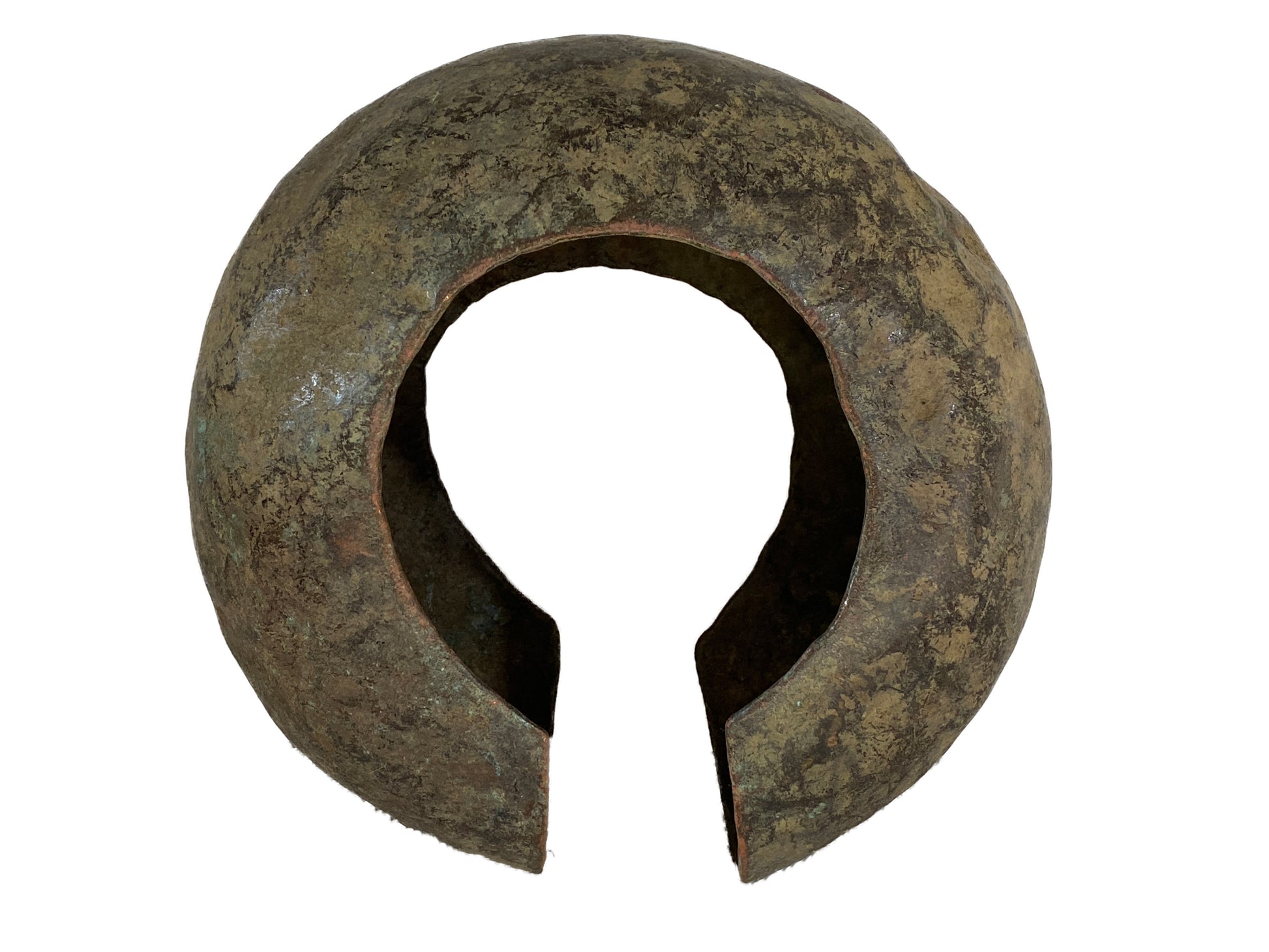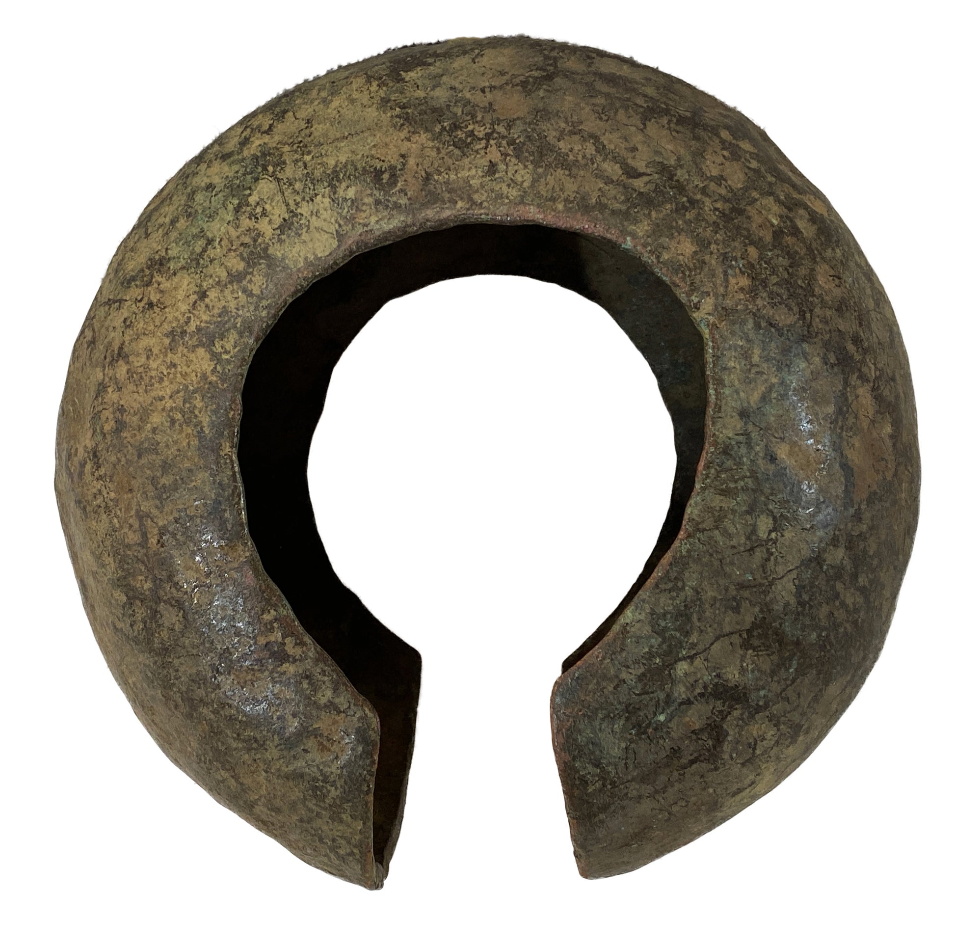 The Mbole people from the Southeastern Democratic Republic of the Congo traditionally made ankle currency bracelets such as this one to facilitate major trade transactions. Some of the largest jewelry forms known in sub-Saharan Africa are found among the Mbole people. Worn by both men and women, these large, rounded anklets were offered by the husband to his wife-to-be a part of the marriage contract. The anklets come in two sizes, the larger being known as "Ehuke" and the smaller "Diako." These anklets were forged and hammered from a single ingot. One side with cast opening.