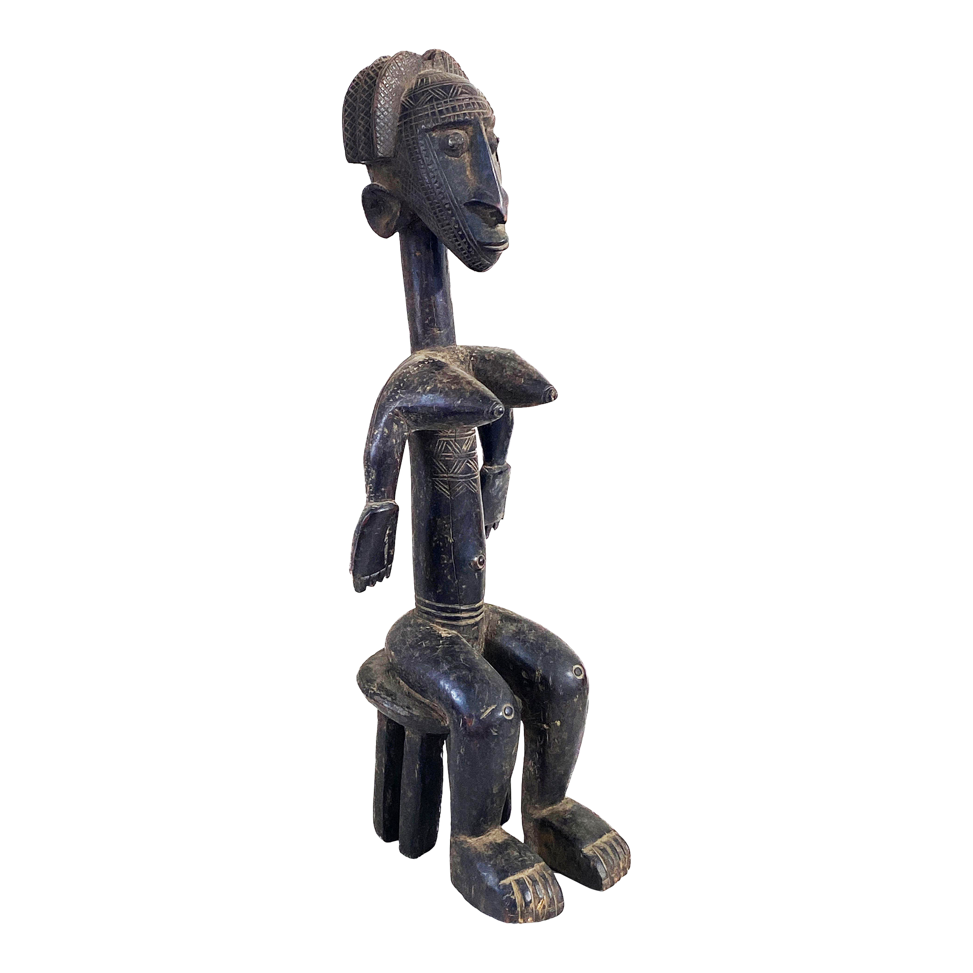Superb old and rare to find hand carved maternity Female Figure from the Bamana people , Mali . The statue features a female Bamana seated on a stool with open hands The sculpture is used to honor women and their maternal role in ceremonies and festivals ,minor cracking and imperfections. please inspect photos carefully or inquire for more detail. 8" L x 7" W x 24" H