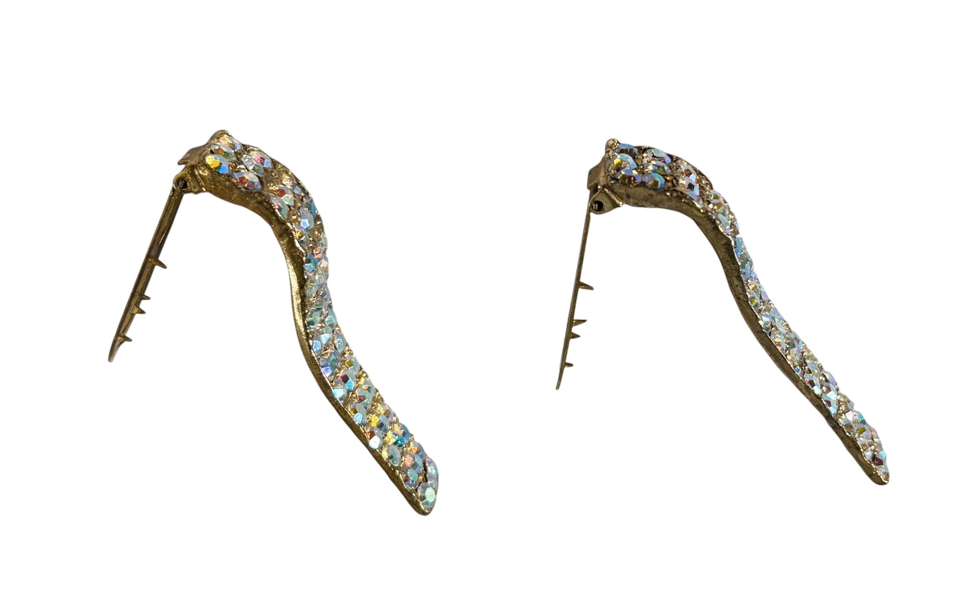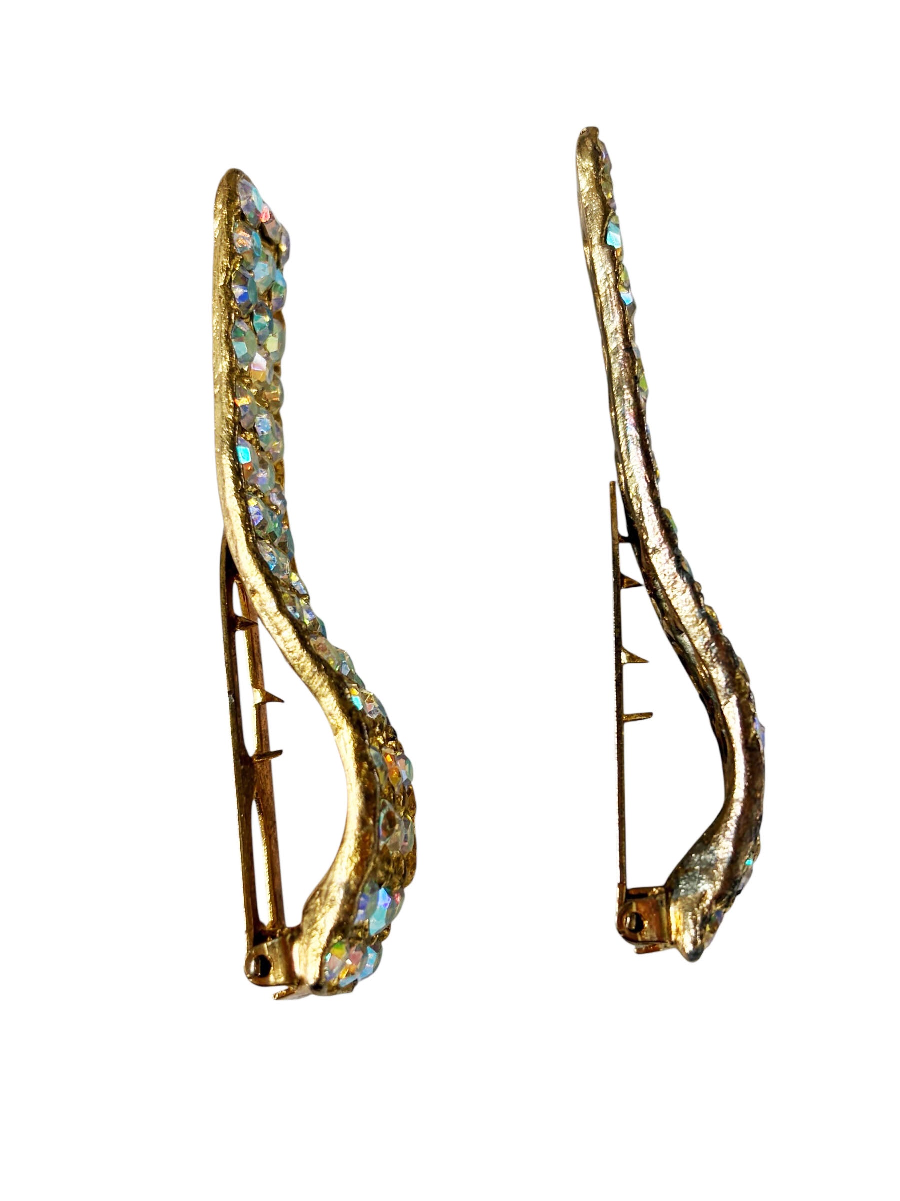 Vintage 1950s-1960s shoe clips featuring aurora borealis rhinestones set in polished gold-tone metal. The iridescent stones shimmer with shifting colors, perfect for adding glamour to pumps, flats, or handbags. Secure metal clips keep them firmly in place. Excellent condition with bright, fully functional stones and tight clips. Ideal for weddings and special occasions.