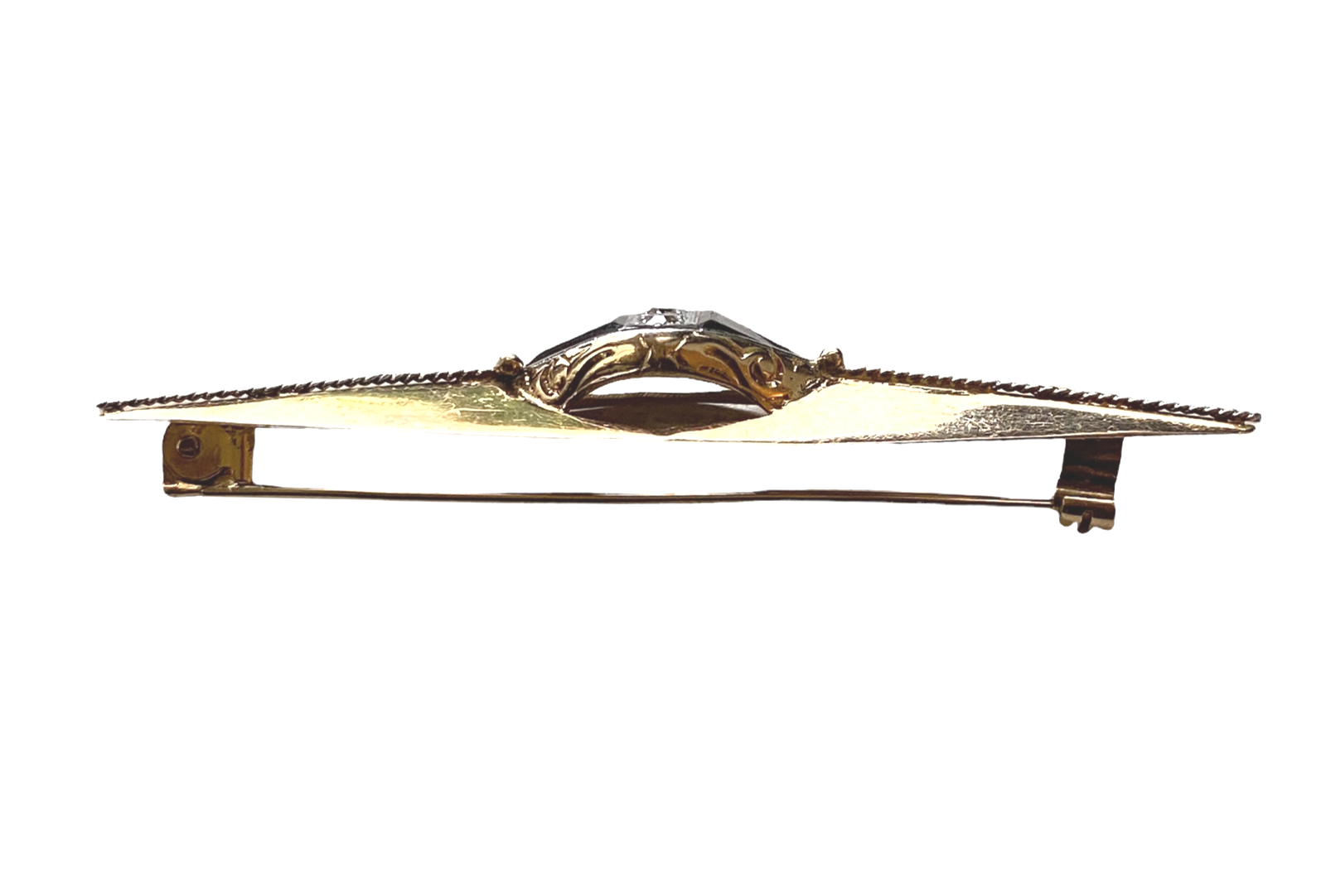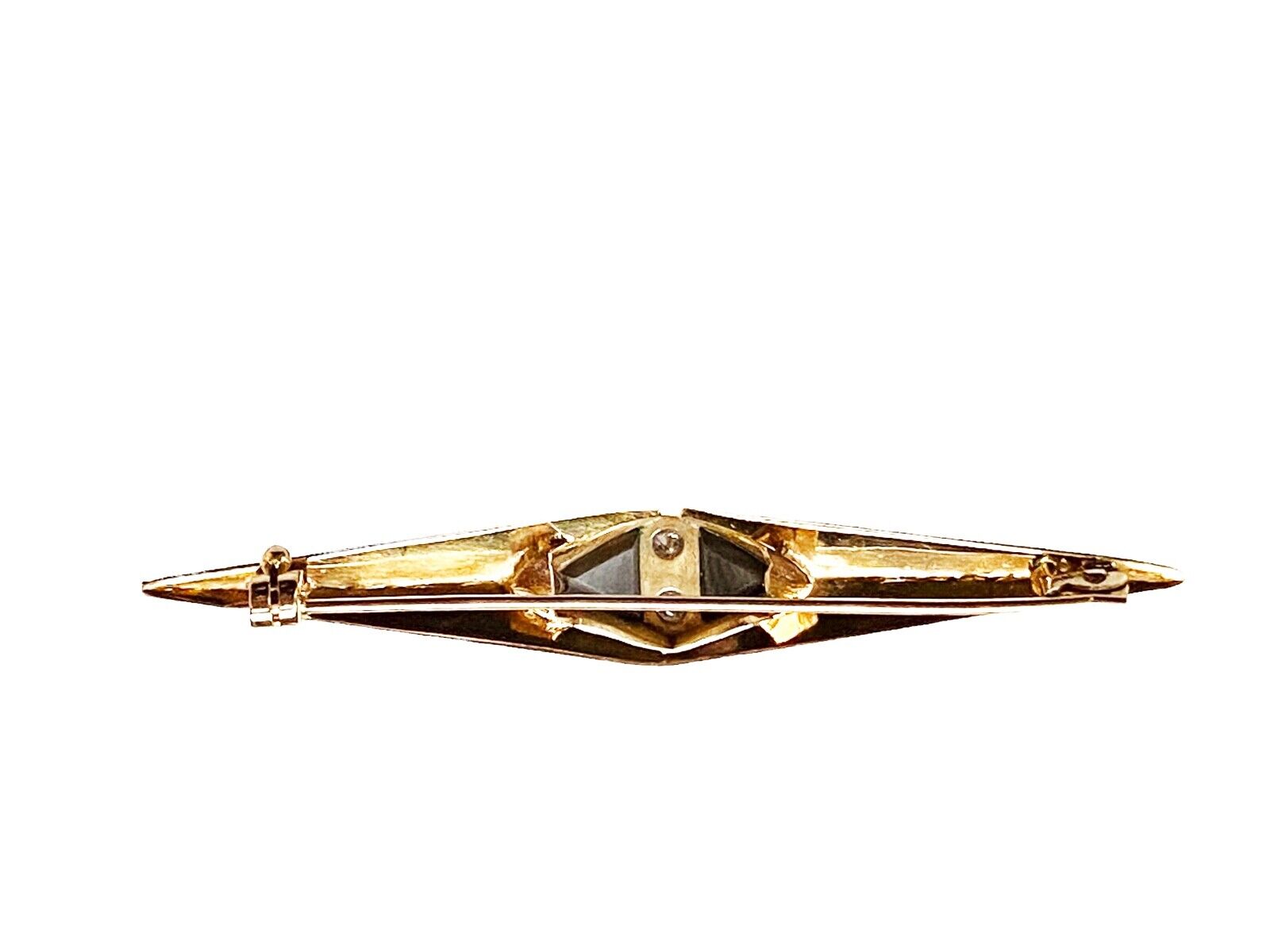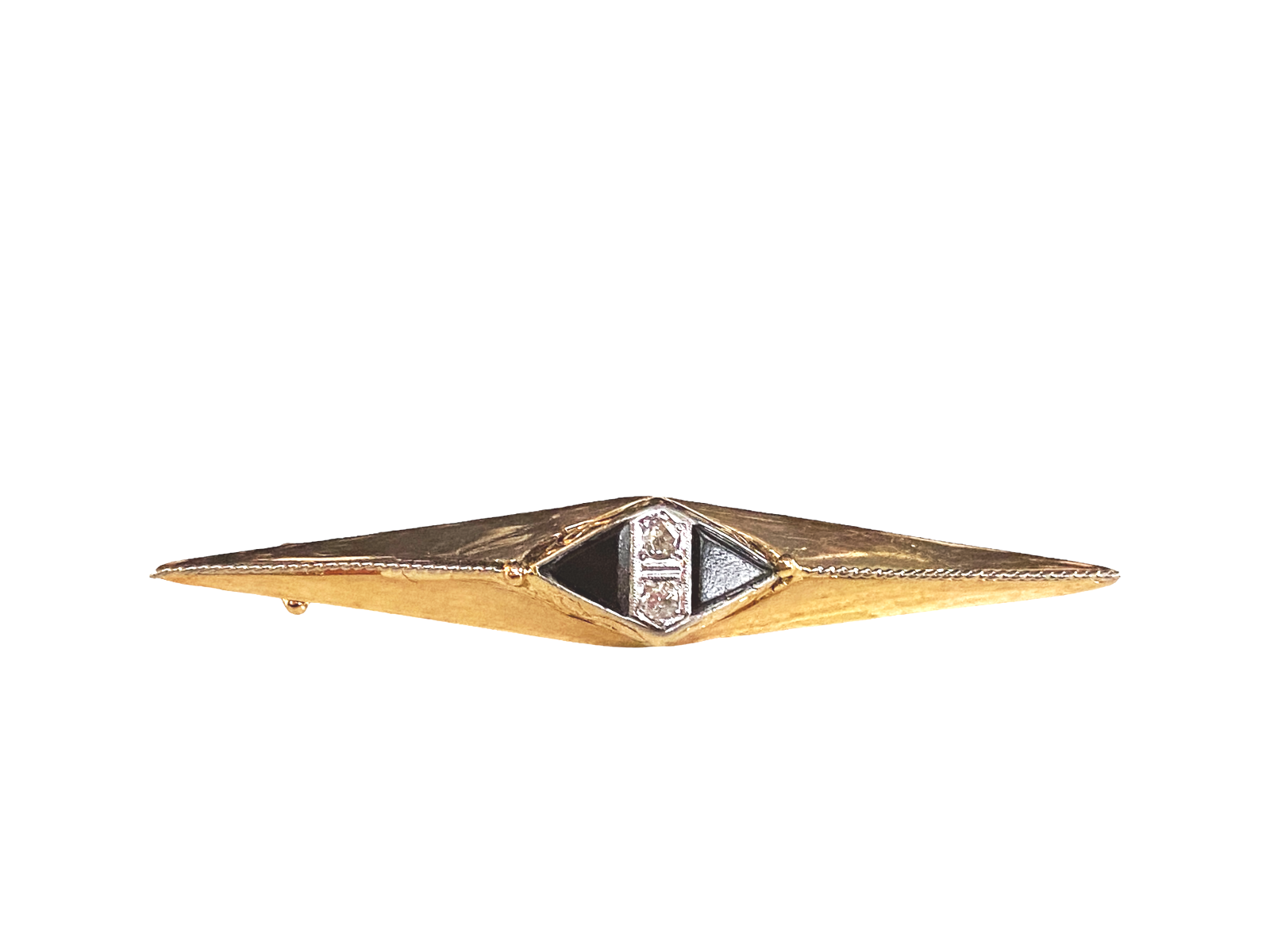 This circa 1920 Art Deco Pin is extremely rare, containing two round diamond stones and two triangular black stones on its side. Unmarked, it is thought to be made of 18 karat gold and weighs 5.4 grams. Its length is 2.5 inches.