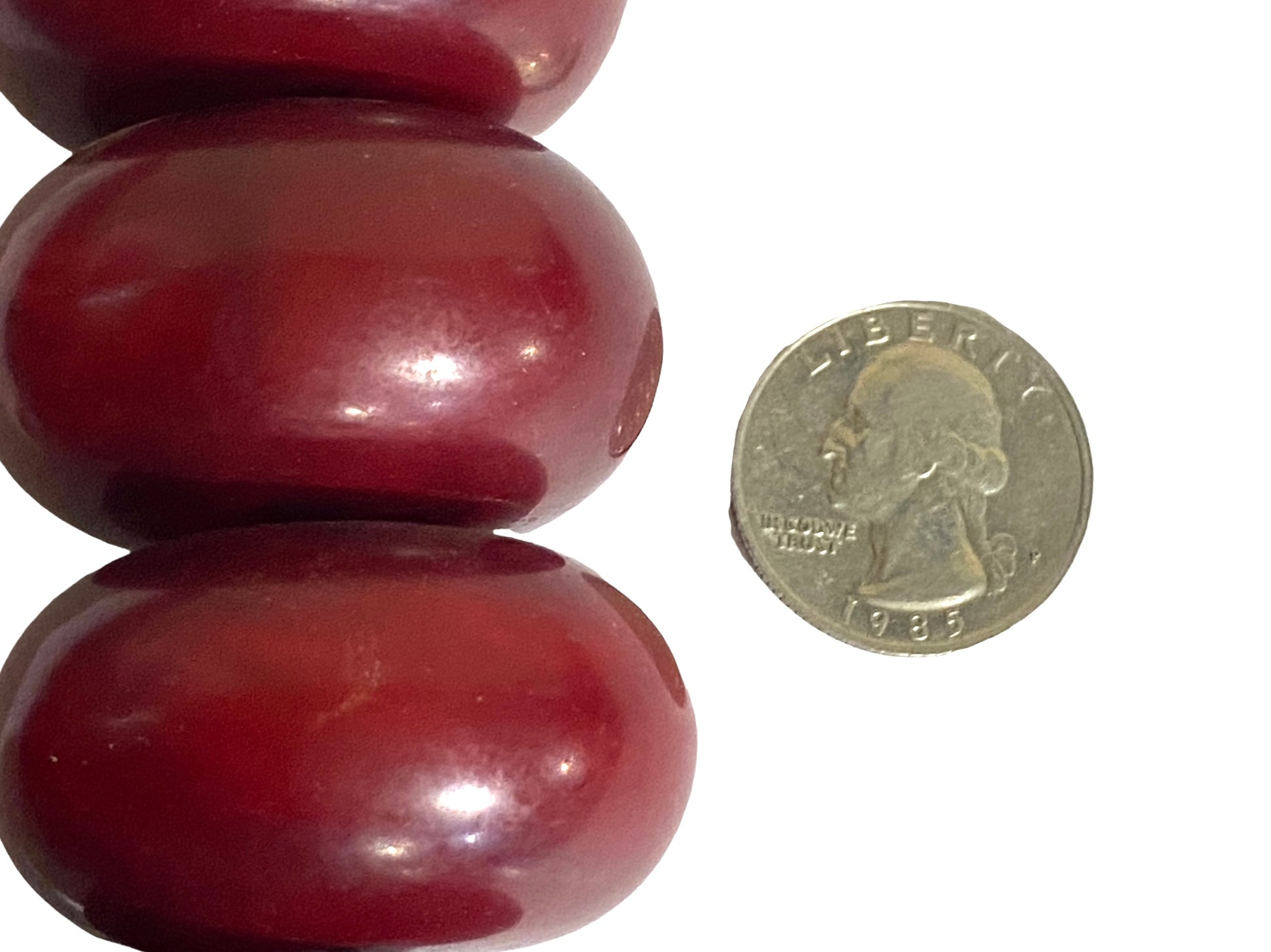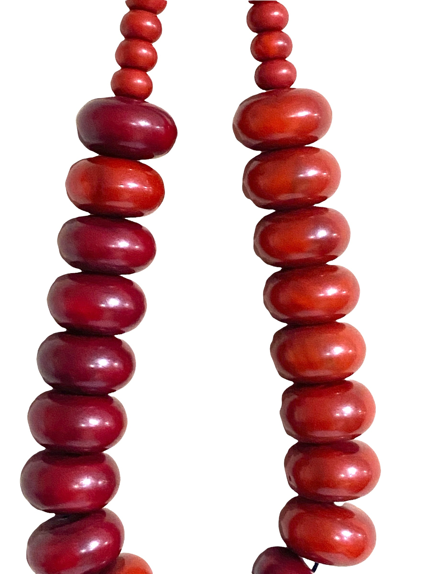 These are phenolic resin also known as "African Amber". It is a man made plastic similar to Bakelite in that it is an early plastic first made in the 30's. Europeans would trade these for ivory and gold.