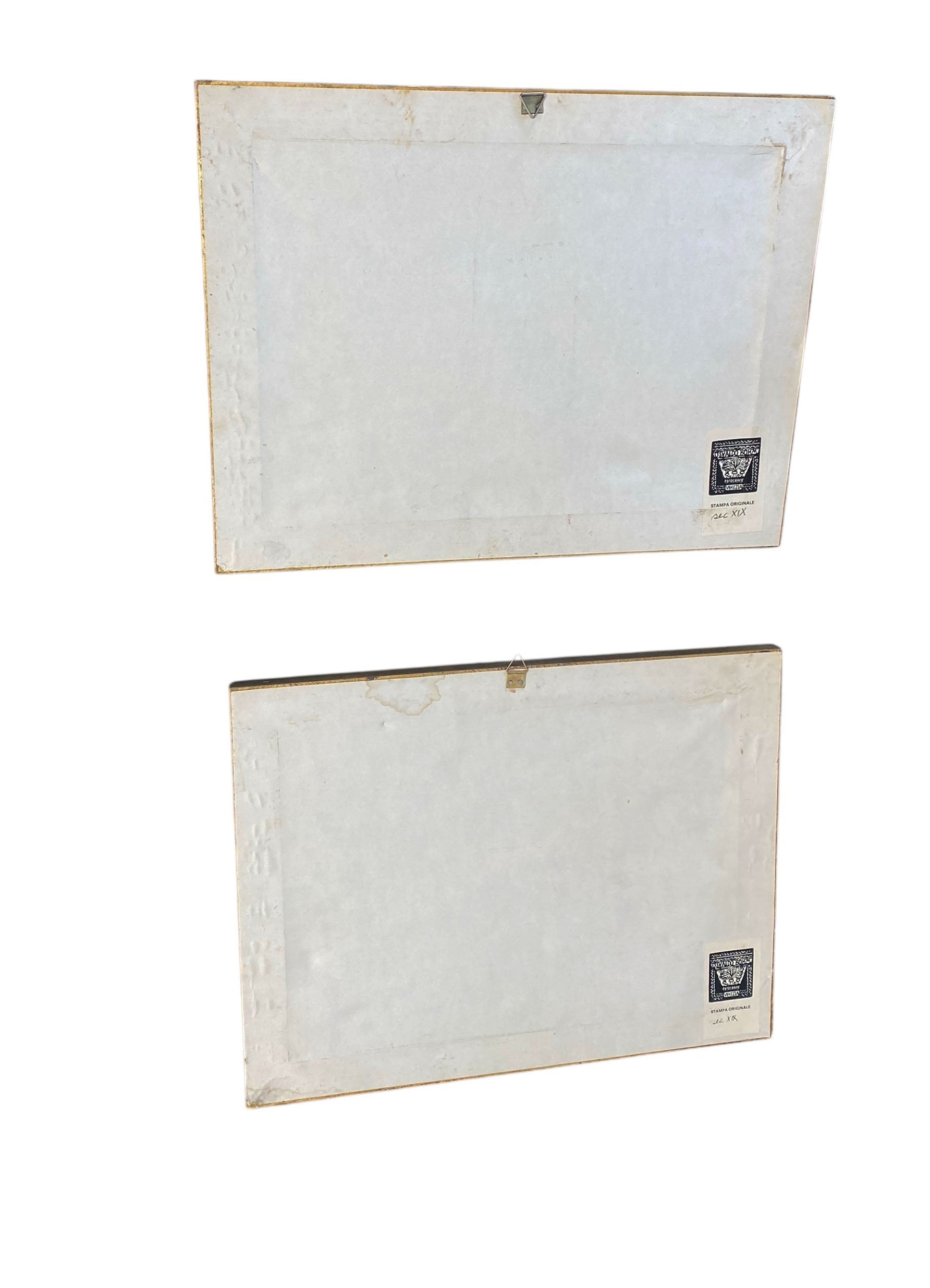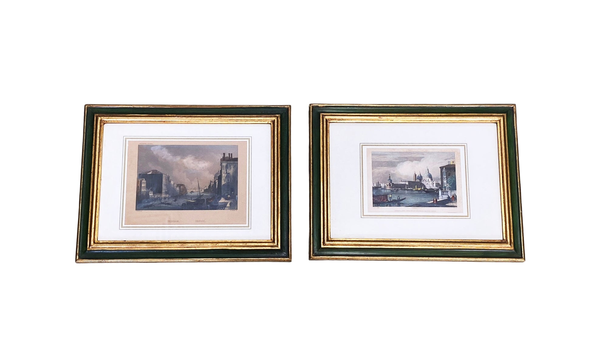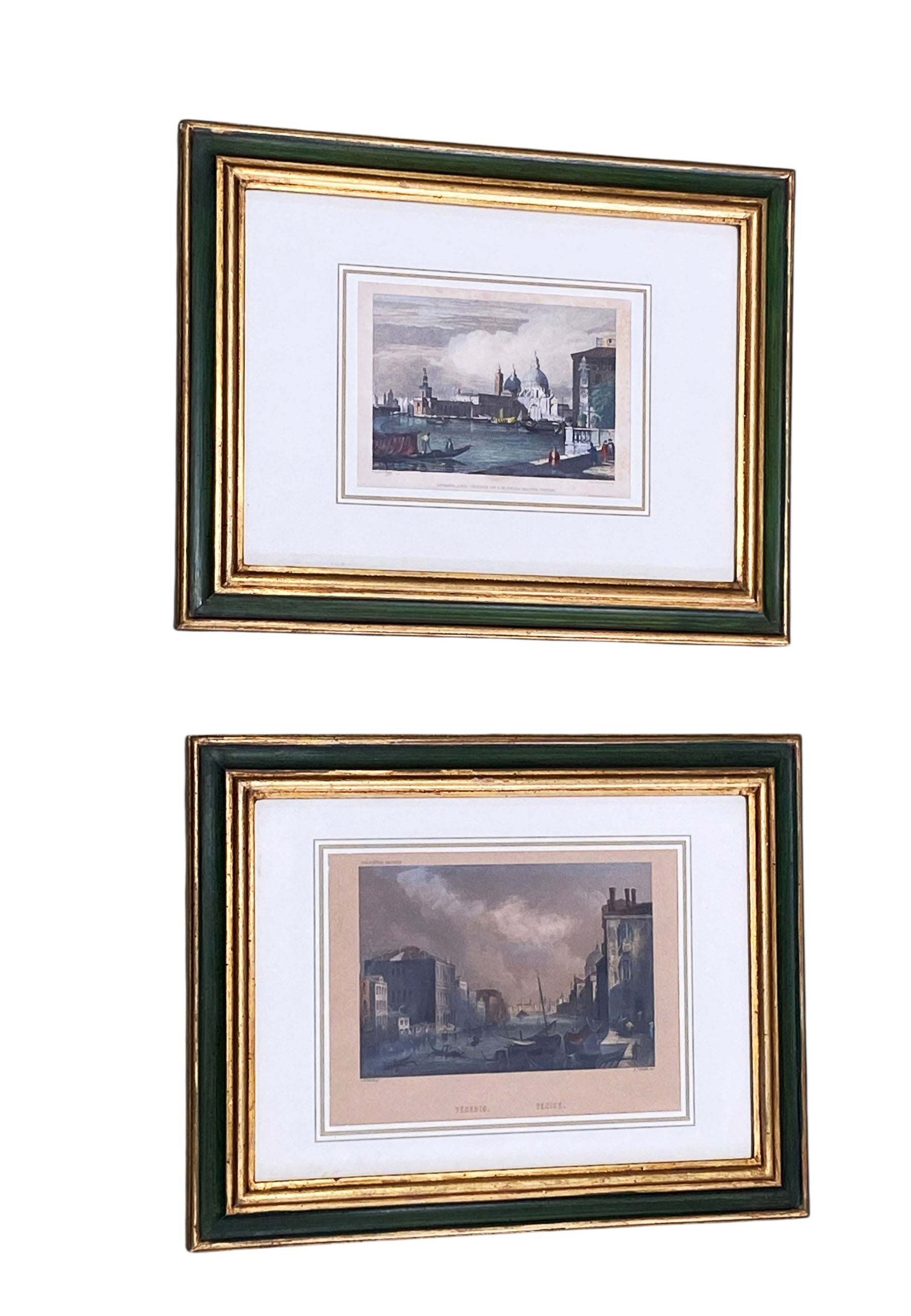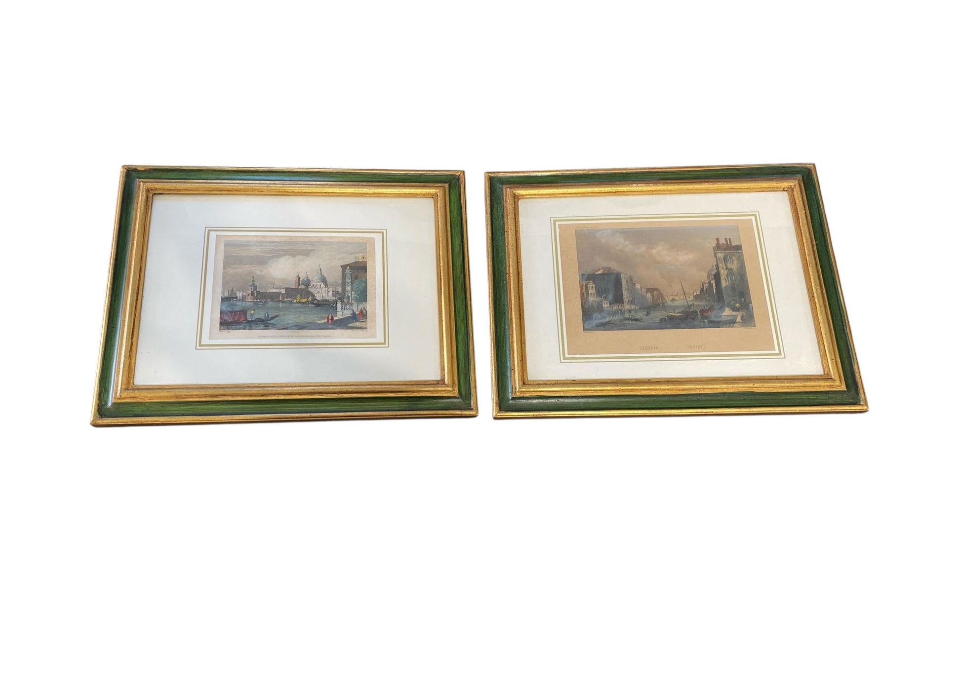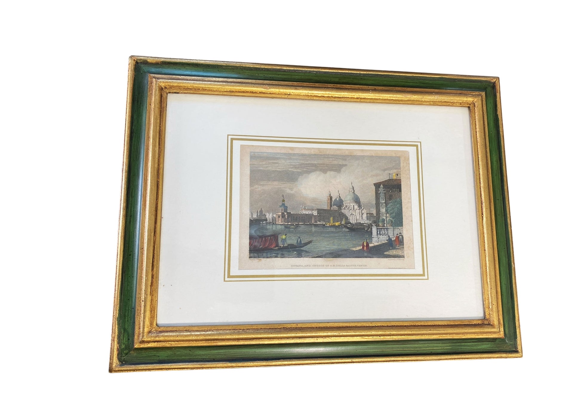 This pendant features two refined farmed prints of Venice: one showcasing a canal scene, the other illustrating the Dogana and the Church of Santa Maria della Salute. Its dimensions measure 14" wide, 10.75" high, and 1" deep.