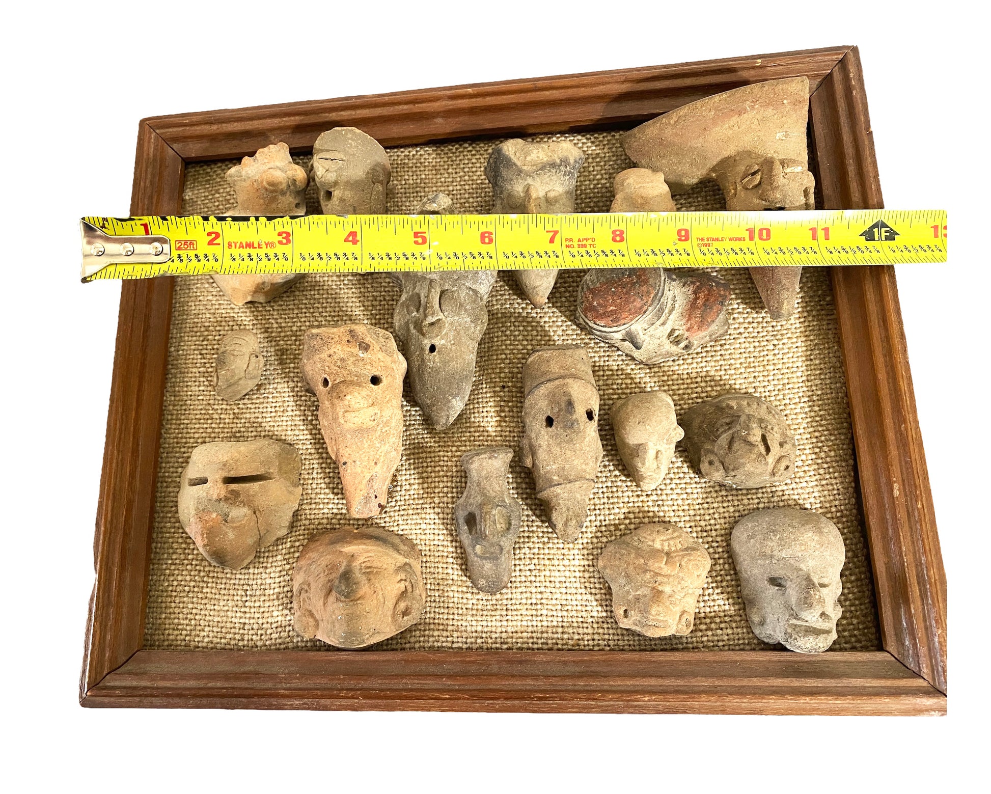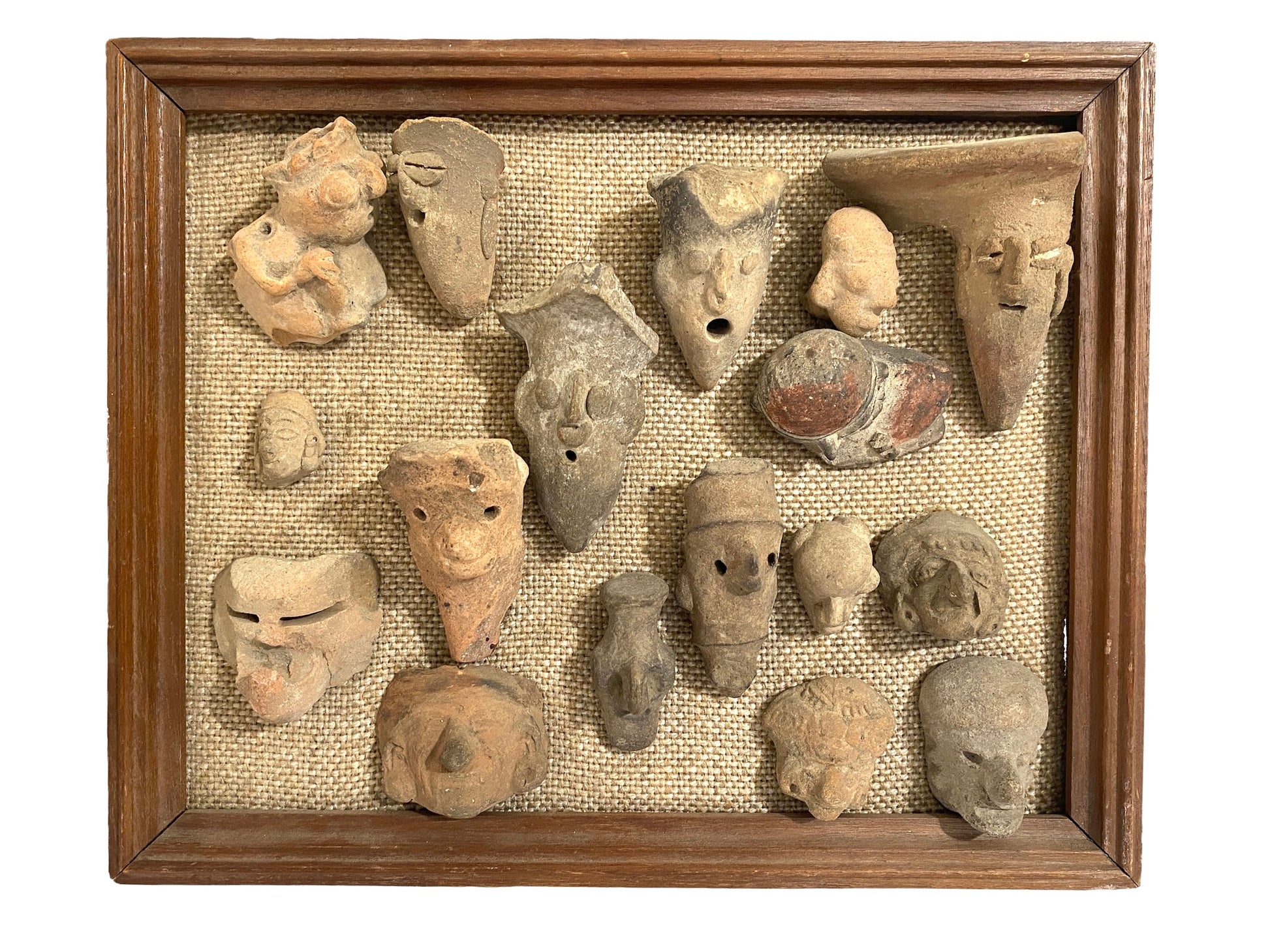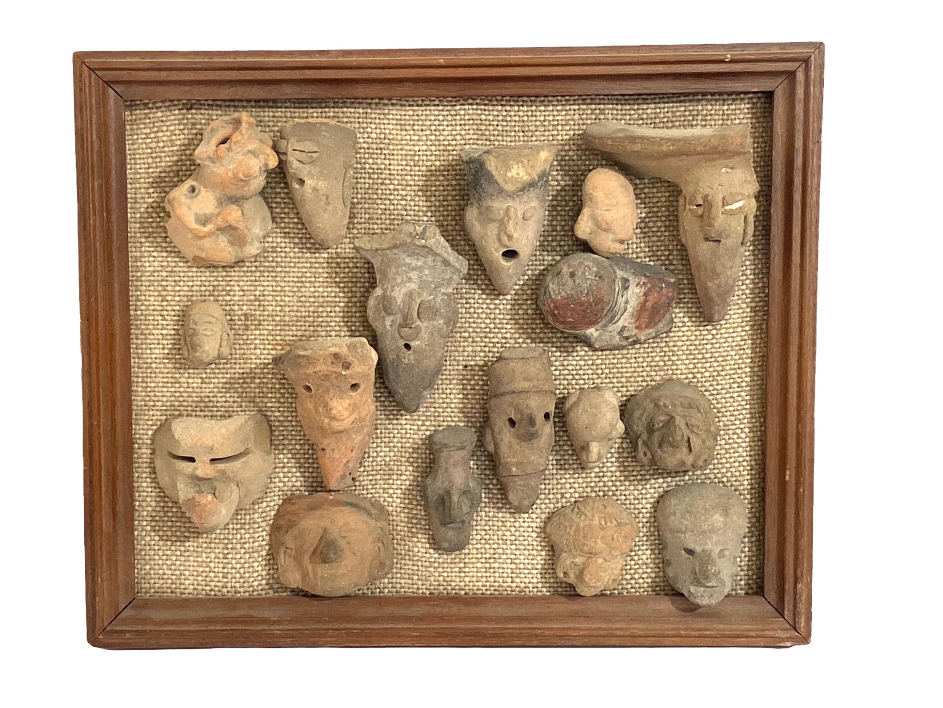 Superb Rare Pre-Columbian 17 pottery fragments heads figures mounted on a burlap fabric and in a wood frame display.