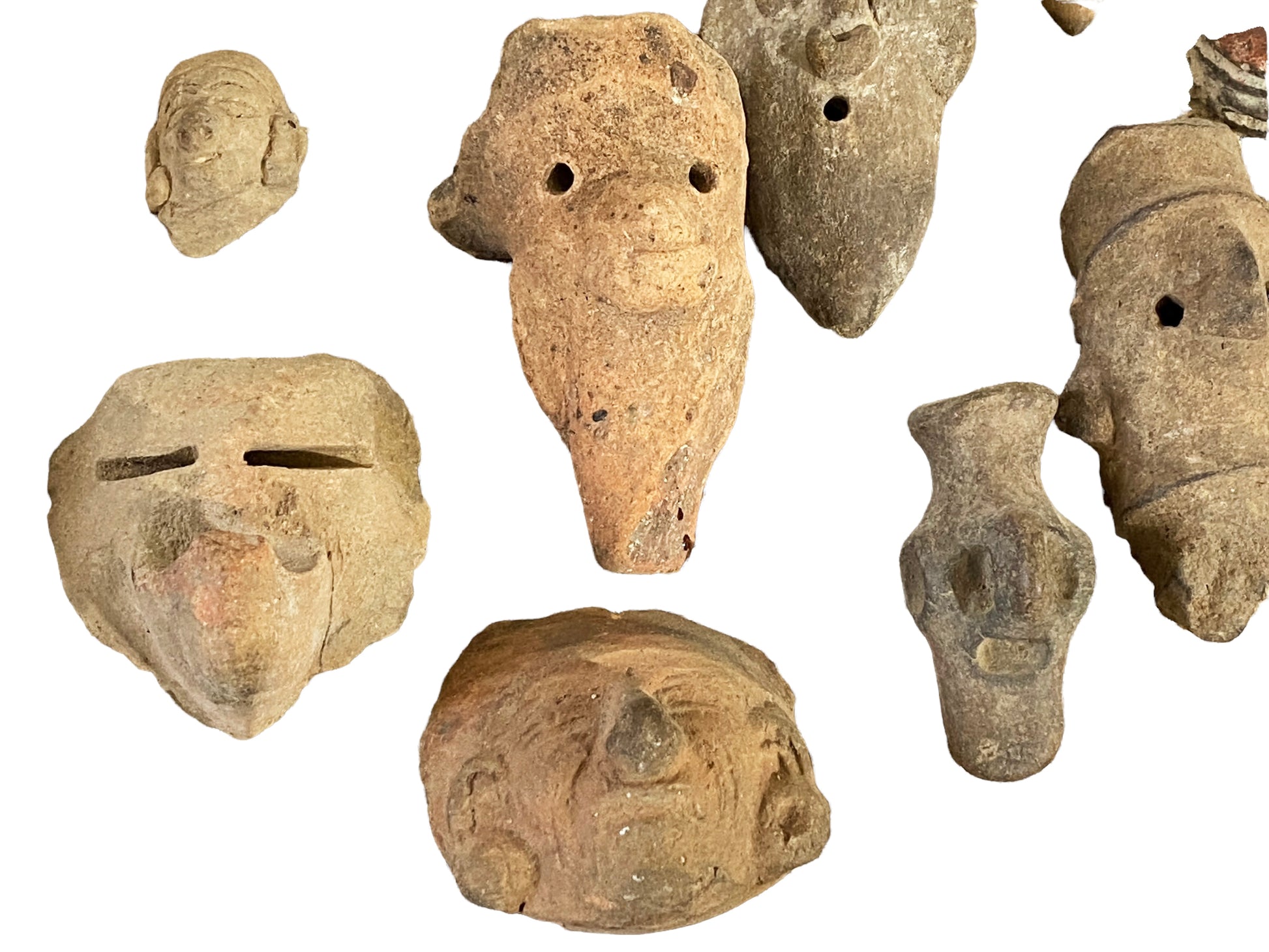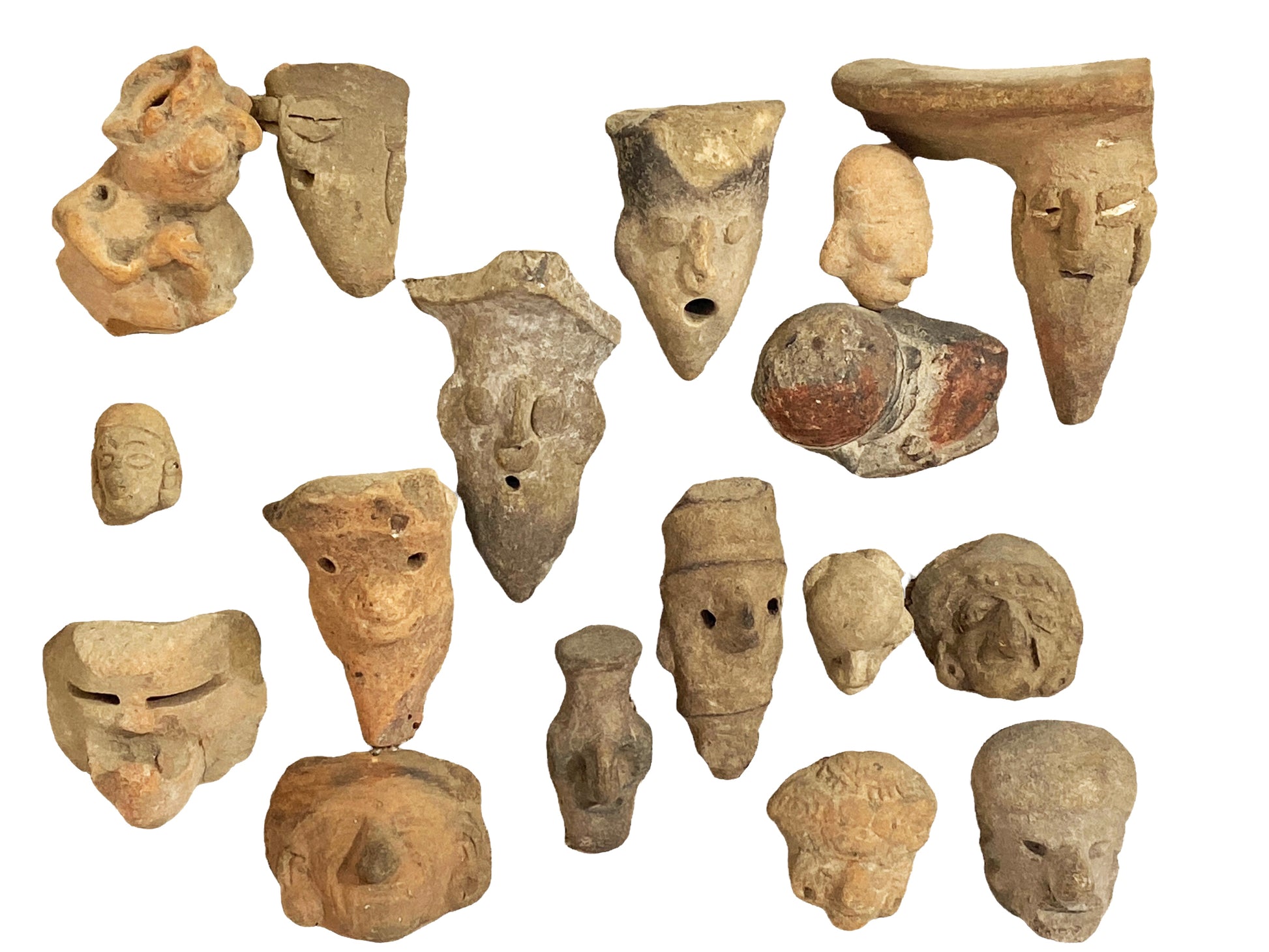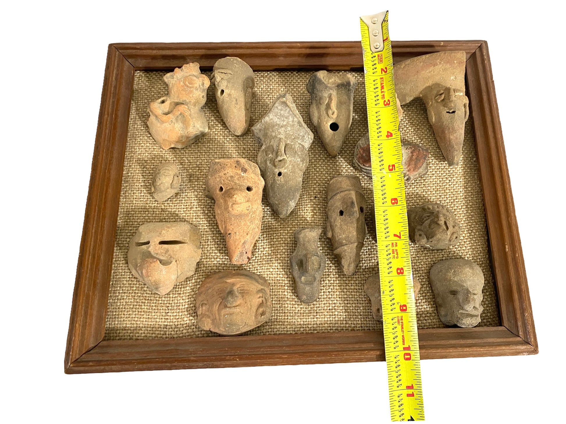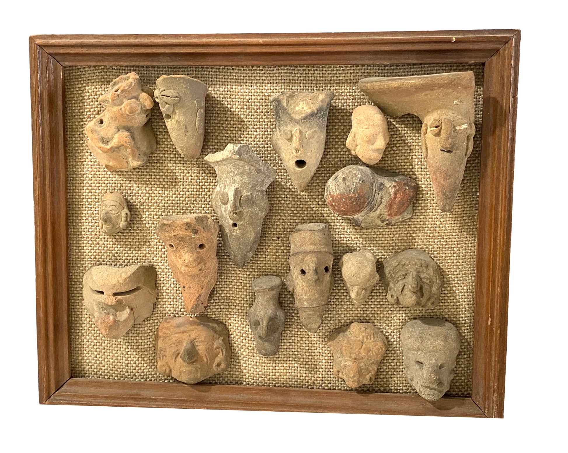 Superb Rare Pre-Columbian 17 pottery fragments heads figures mounted on a burlap fabric and in a wood frame display.