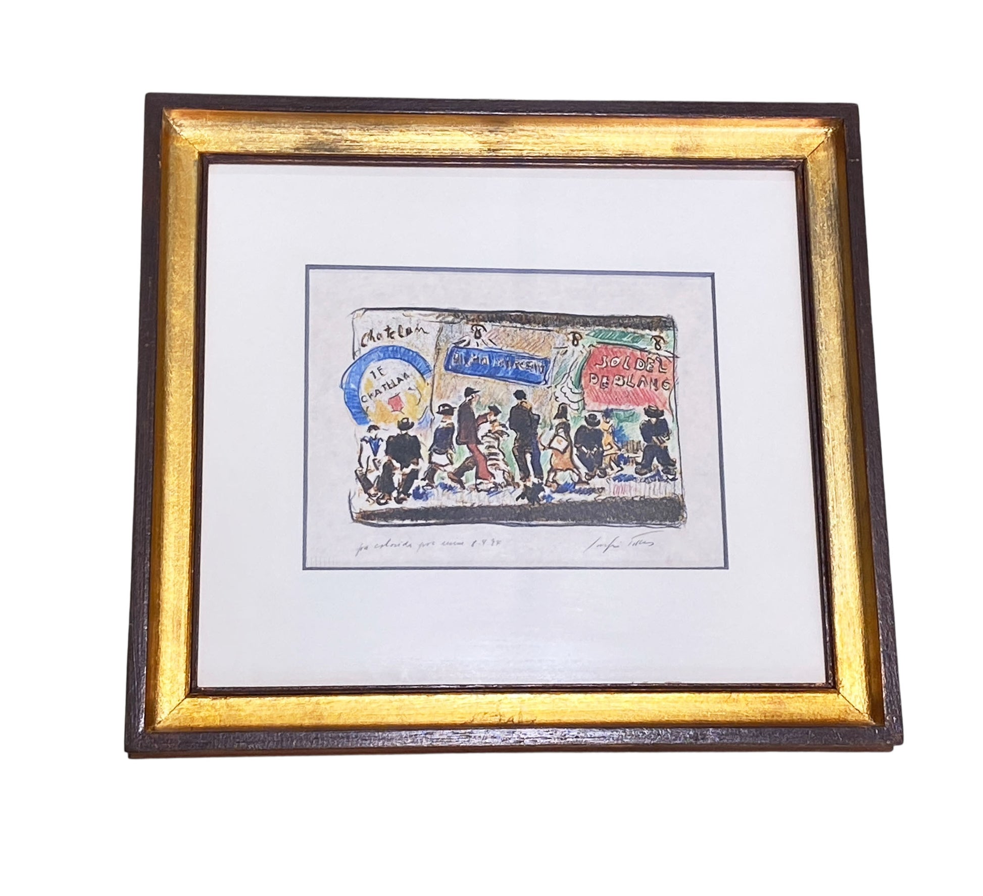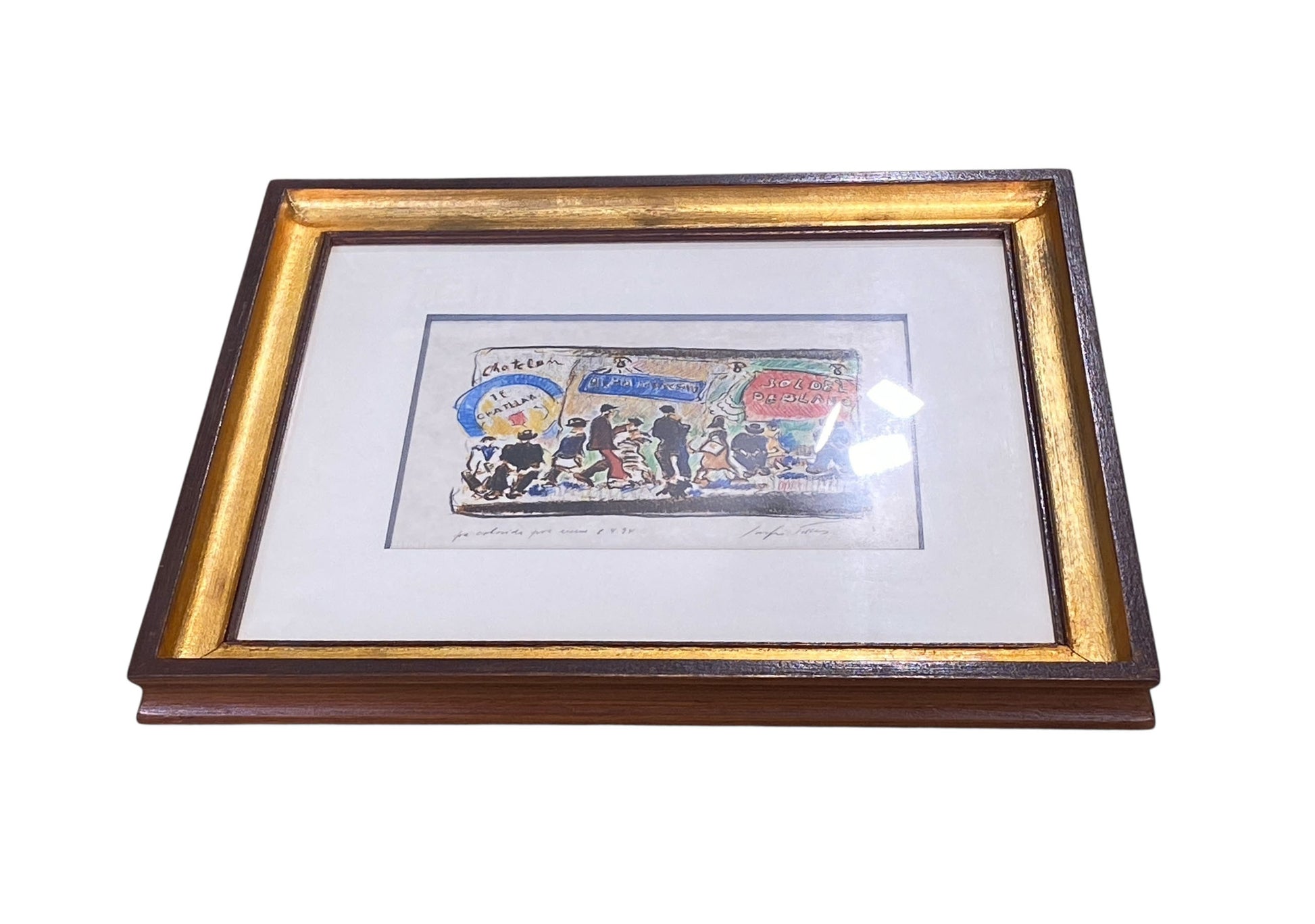 Sergio Telles (Brazil, 1936–2022) offers a crayon-on-paper piece entitled "French Market Scene," featuring figures walking amidst storefront signs. The artwork is signed lower left and dated 8-4-94, measuring 15.75" high, 17.25" wide, and 1.25" deep. Born in Rio de Janeiro, Telles was a distinguished painter and illustrator who trained in art restoration at the Vatican Pinacoteca and studied under leading Brazilian artists. His diplomatic career enriched his cultural perspective, influencing his extensive travels and inspiring much of his artistic output. His work has been widely exhibited and auctioned internationally.