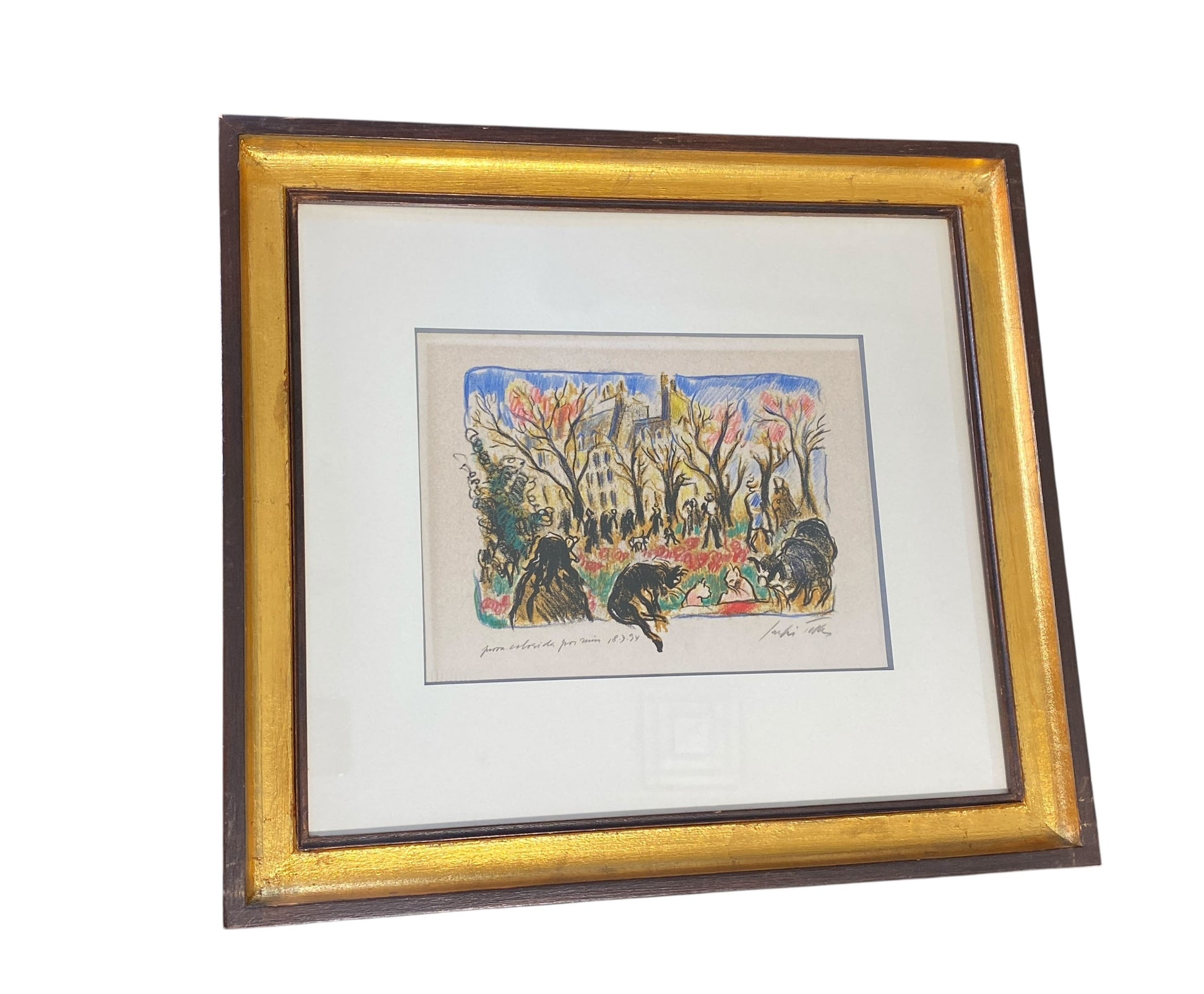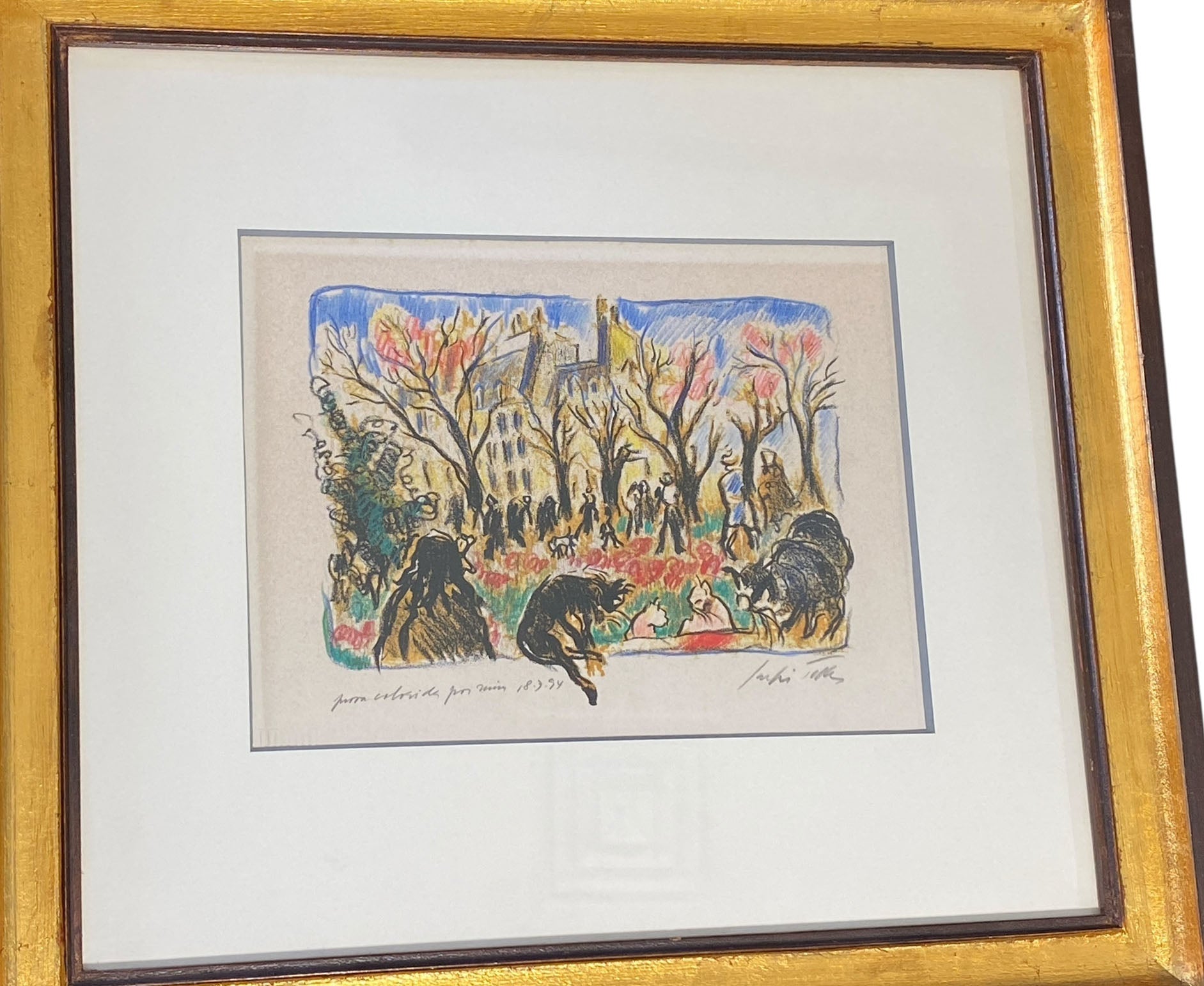 Sergio Telles (Brazil, 1936–2022) presents a crayon-on-paper artwork titled "French Market Scene," depicting figures strolling among trees and buildings. Signed in the lower left and dated 18-7-94, the piece measures 15.75" high, 17.25" wide, and 1.25" deep. A native of Rio de Janeiro, Telles was a renowned painter and illustrator who trained in art restoration at the Vatican Pinacoteca and studied with prominent Brazilian artists. His diplomatic career broadened his cultural horizons, fueling his travels and artistic inspiration. His work has been extensively exhibited and sold at international auctions.