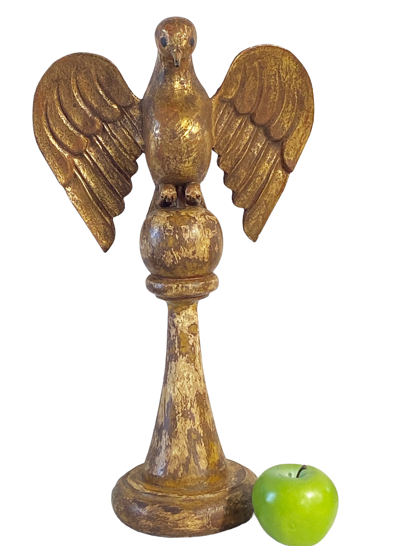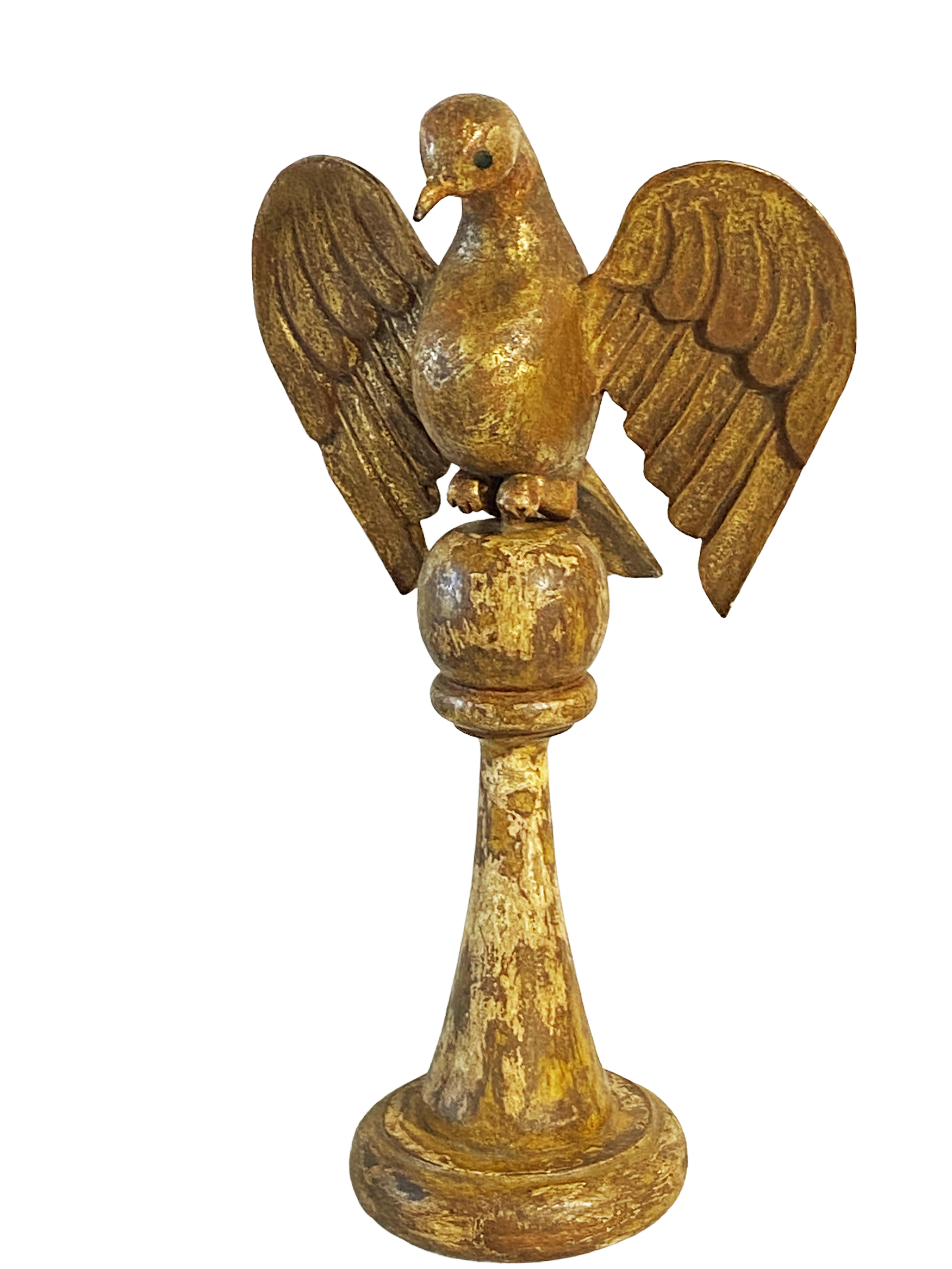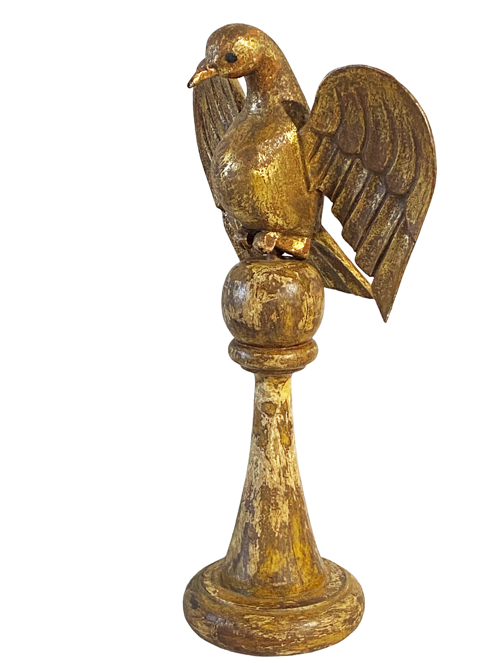 Add a playful touch to your space with this unique European, hand-carved sculpture of a bird standing on a finial-like stand or The Holy Spirit , golden color metallic leaf has been applied to the bird's body which is a perfect juxtaposition to the distressed, brown-and-gold finial base ,it is removable, 19" H by 10.75"w by 7.5" D Thanks