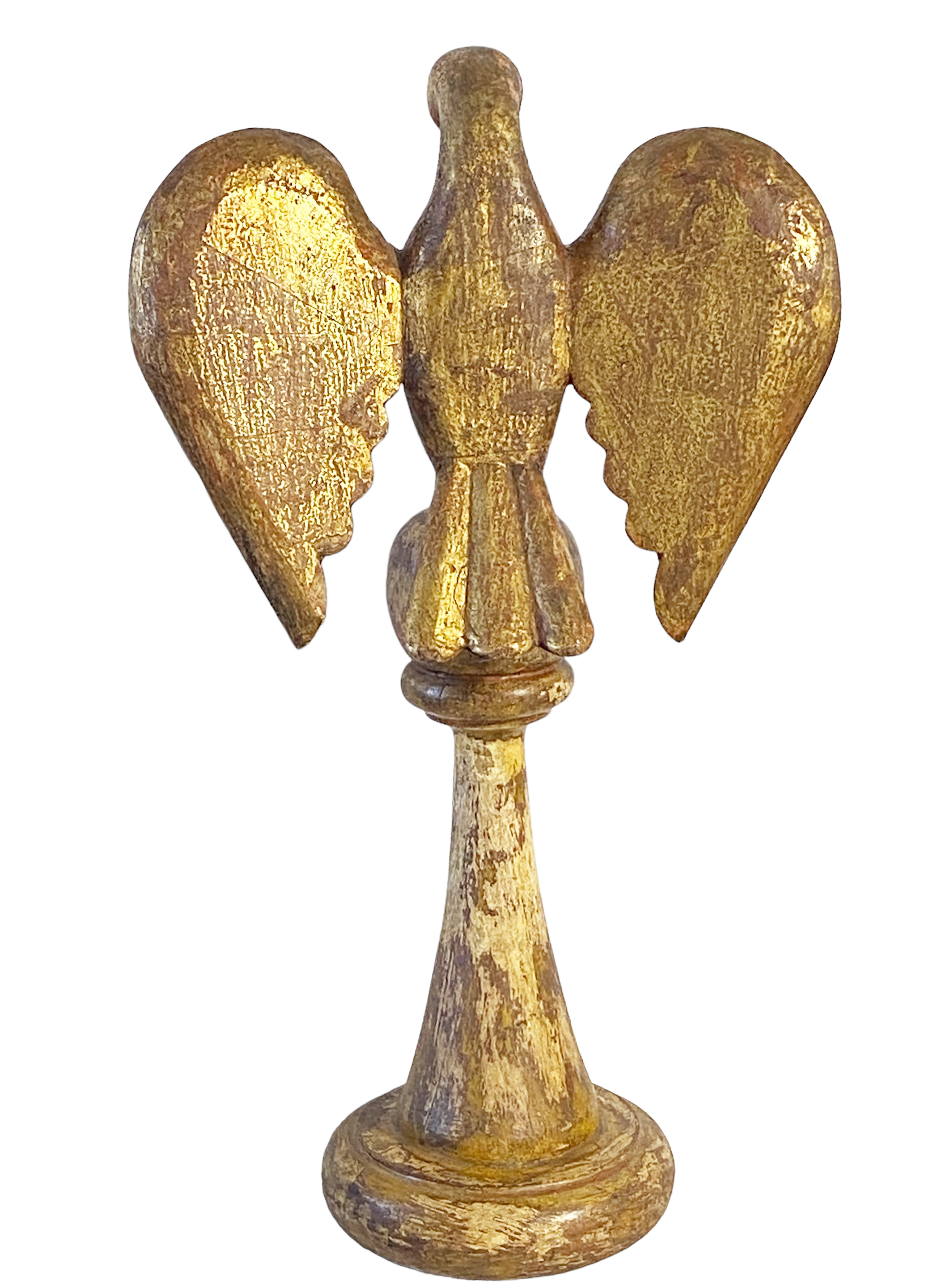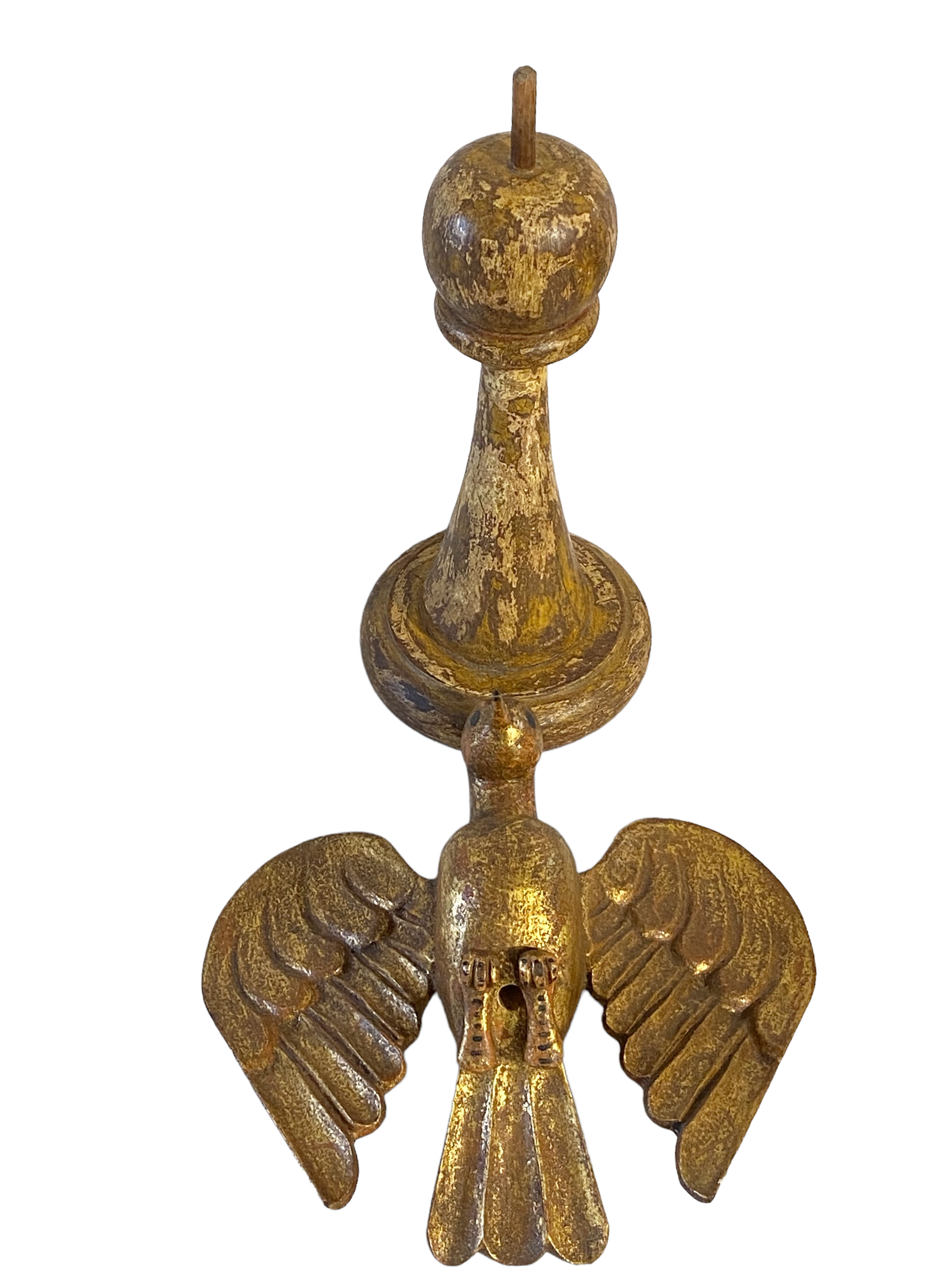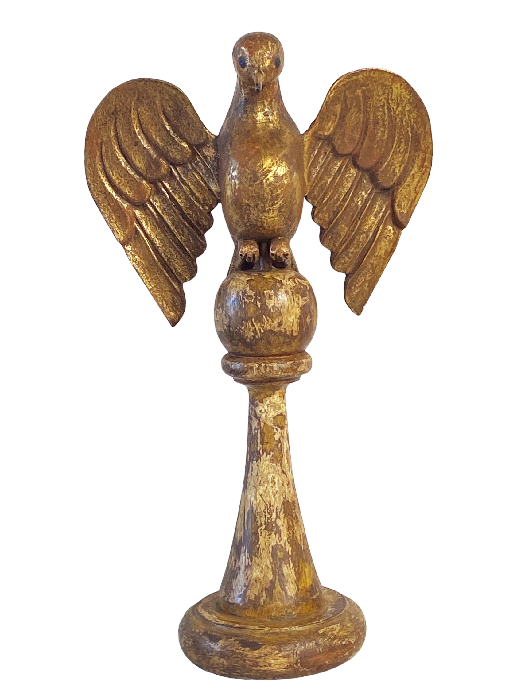 Add a playful touch to your space with this unique European, hand-carved sculpture of a bird standing on a finial-like stand or The Holy Spirit , golden color metallic leaf has been applied to the bird's body which is a perfect juxtaposition to the distressed, brown-and-gold finial base ,it is removable, 19" H by 10.75"w by 7.5" D Thanks