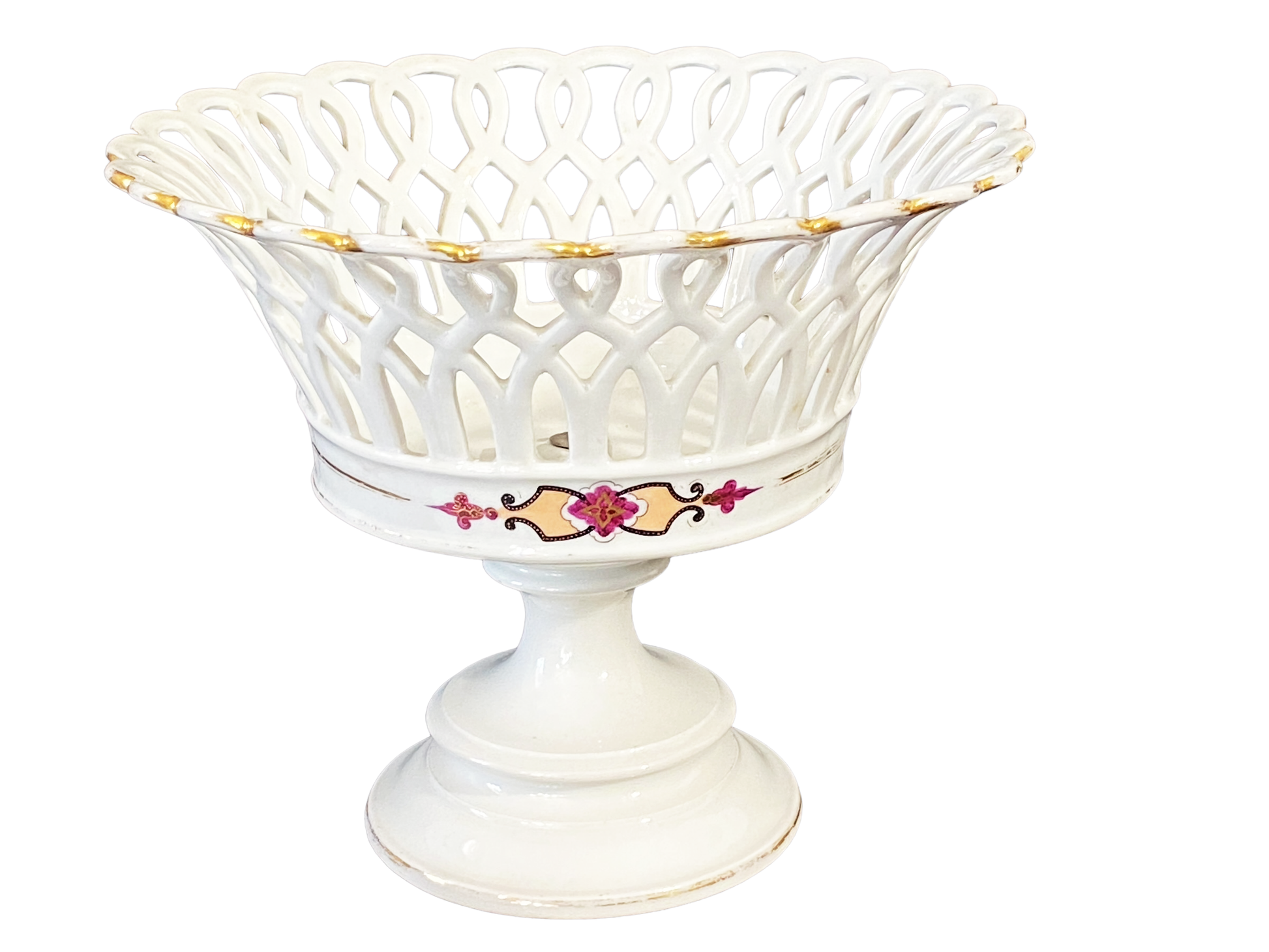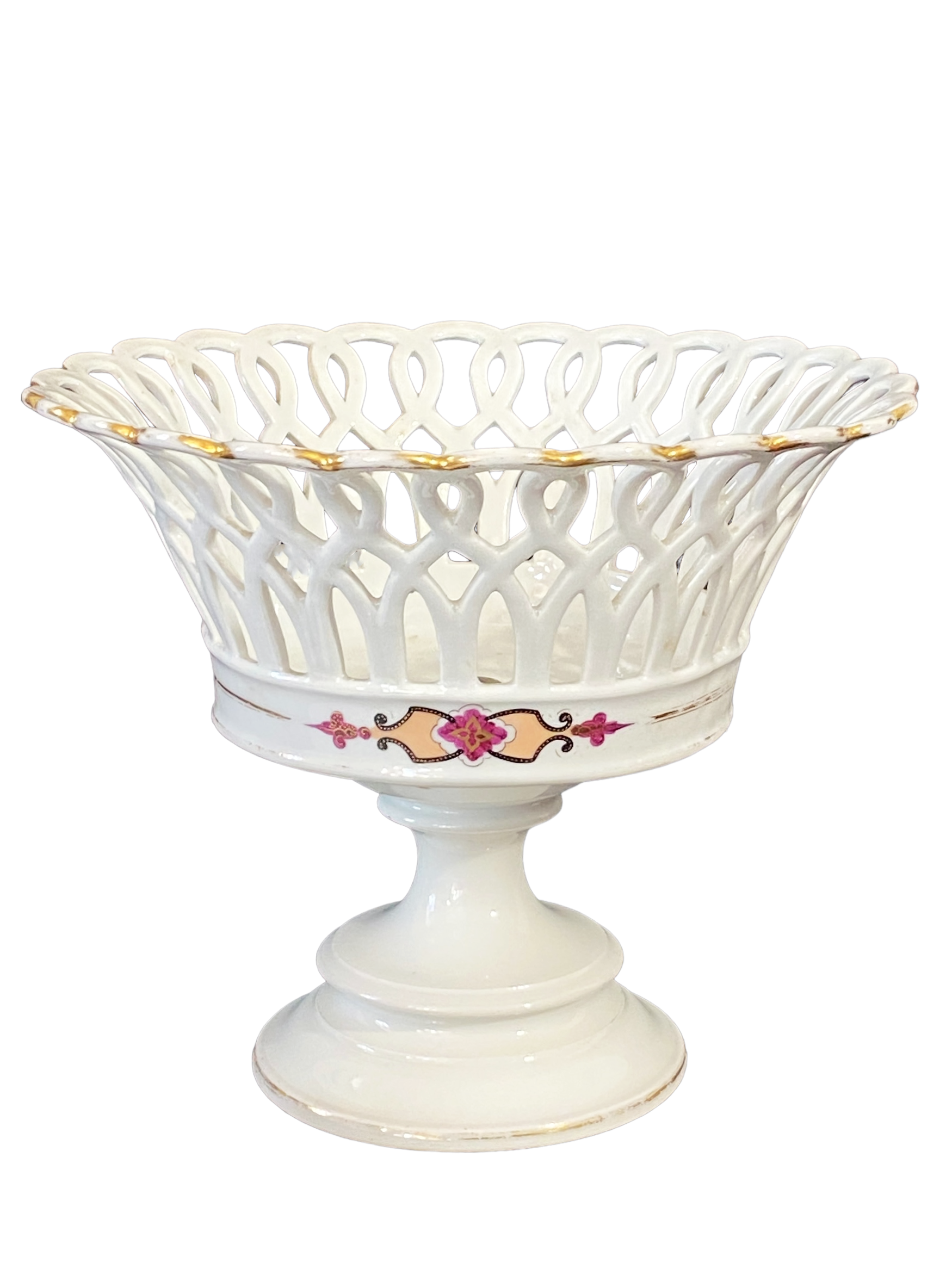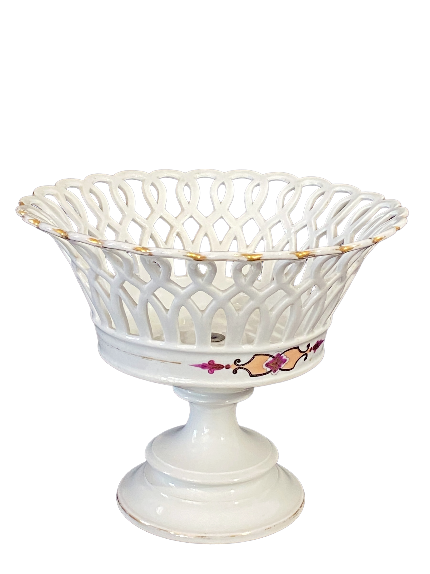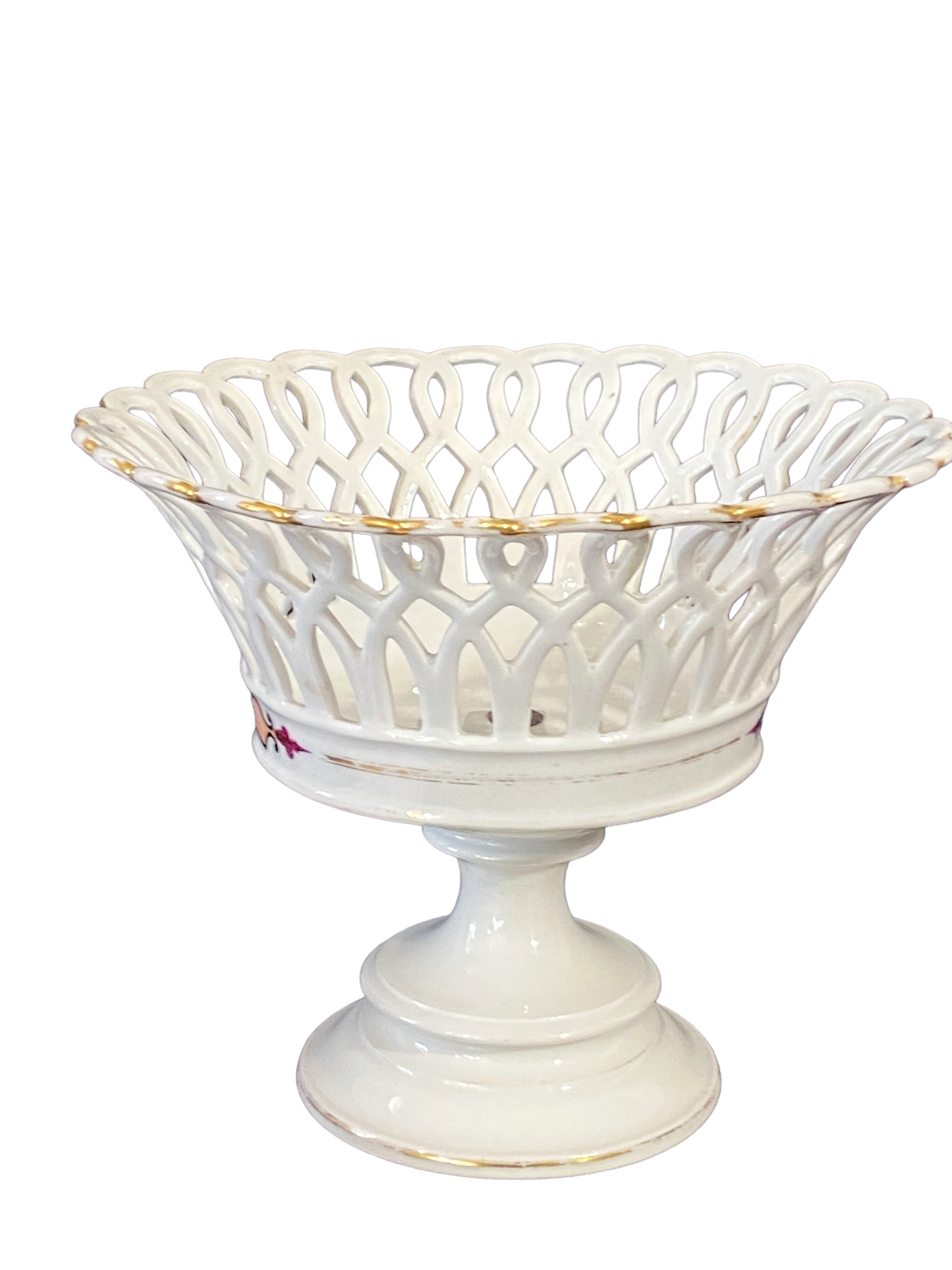 19th century old Paris porcelain reticulated compote (corbeille, fruit basket) in tazza form with gilded decoration (late 19th century).shown minor gilt loss overall good condition 7.5" H by 9" diameter