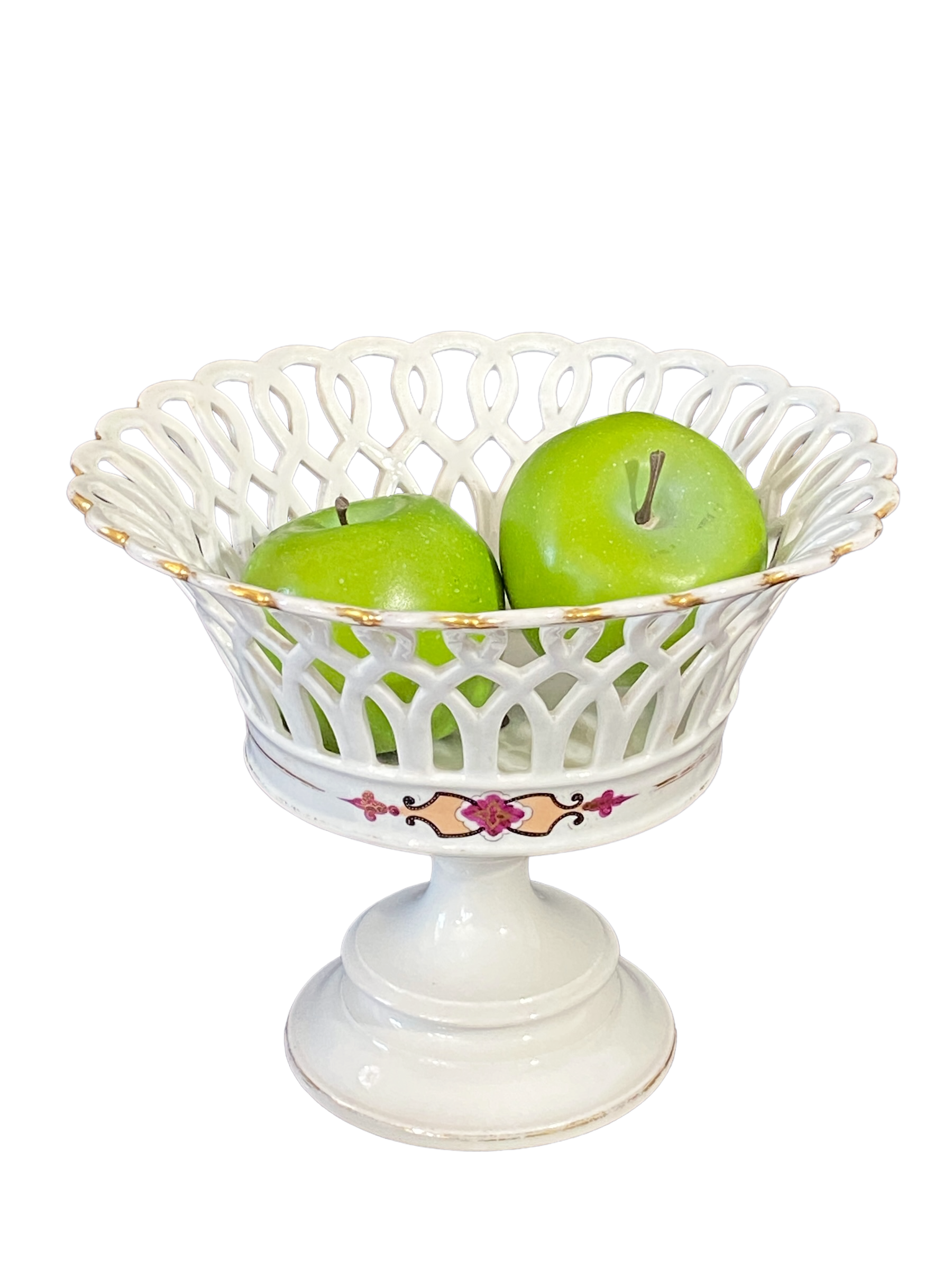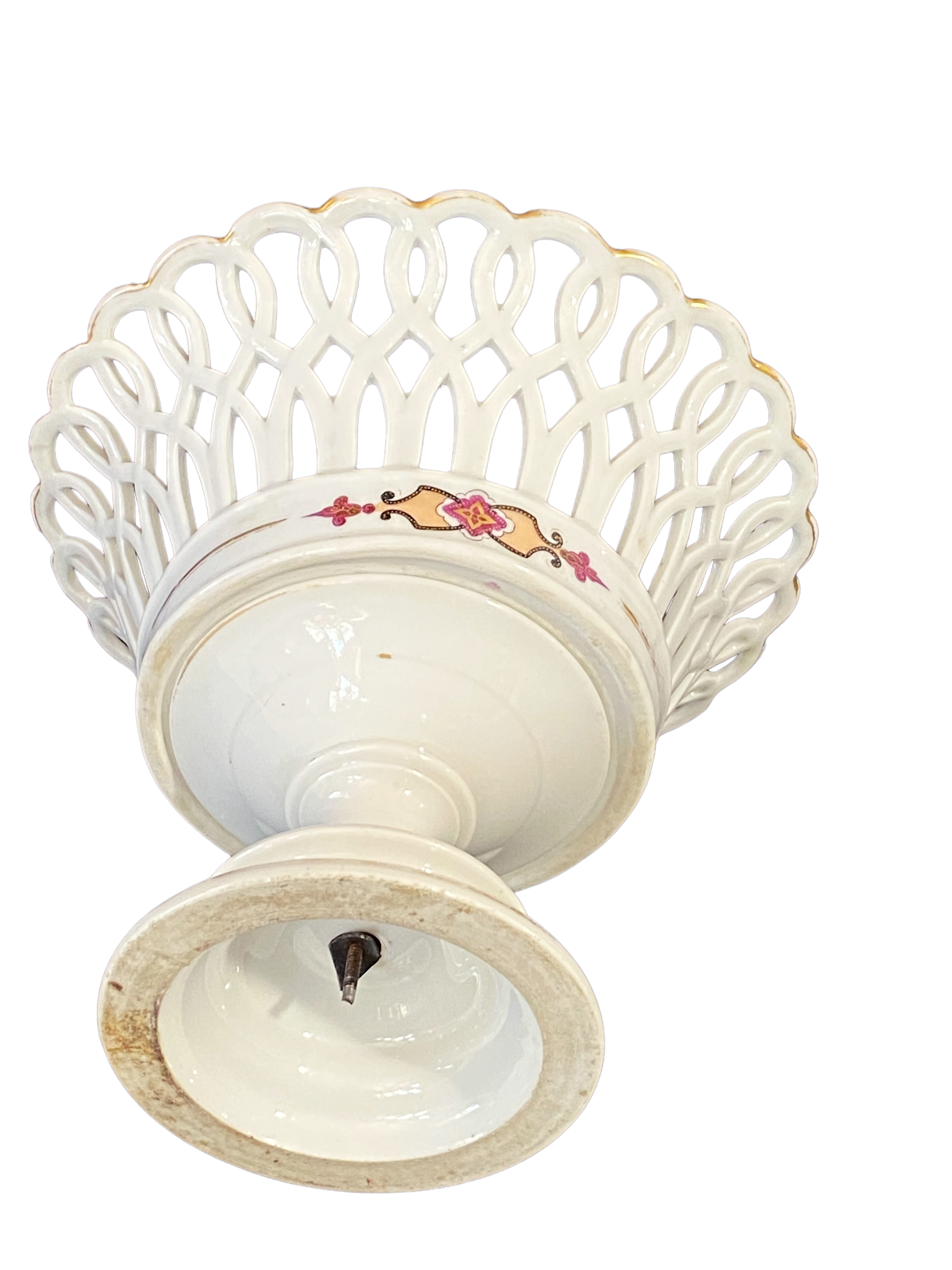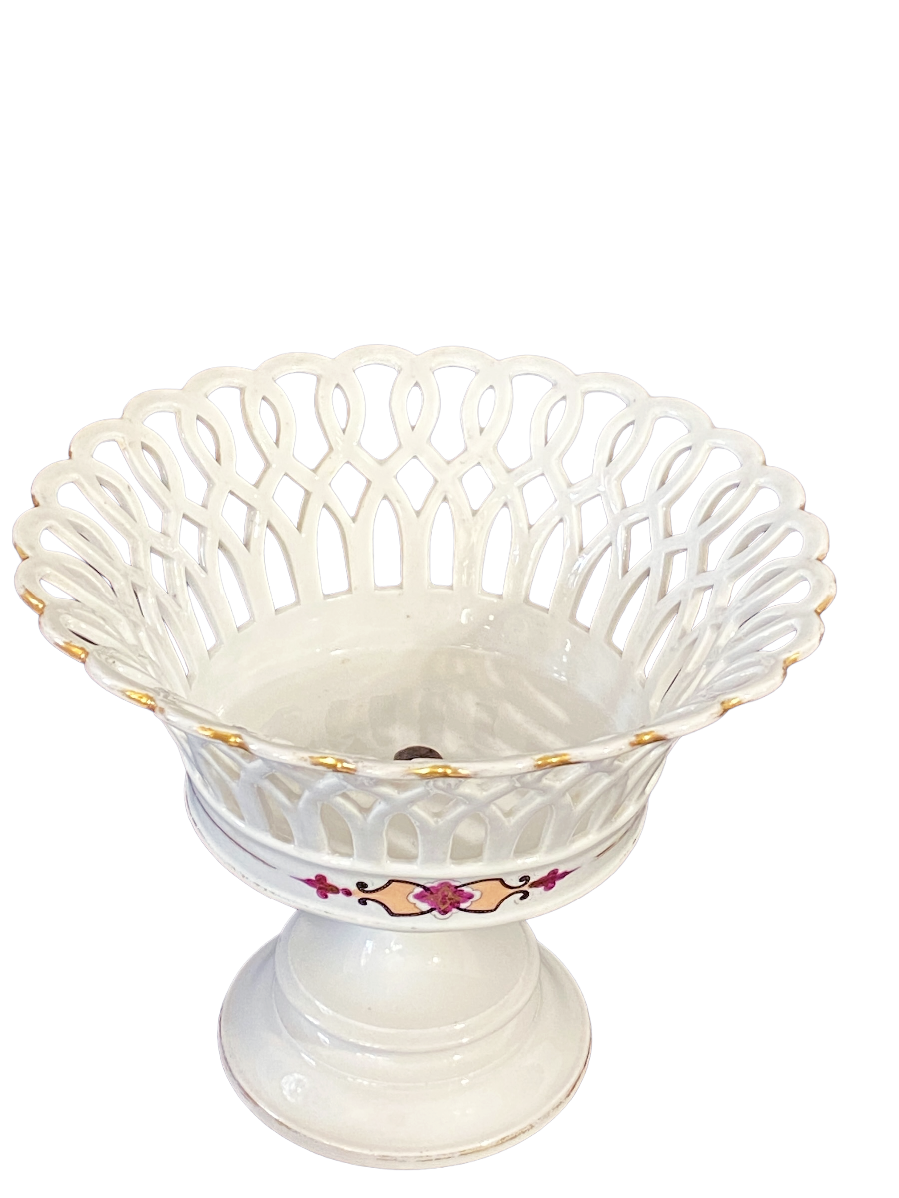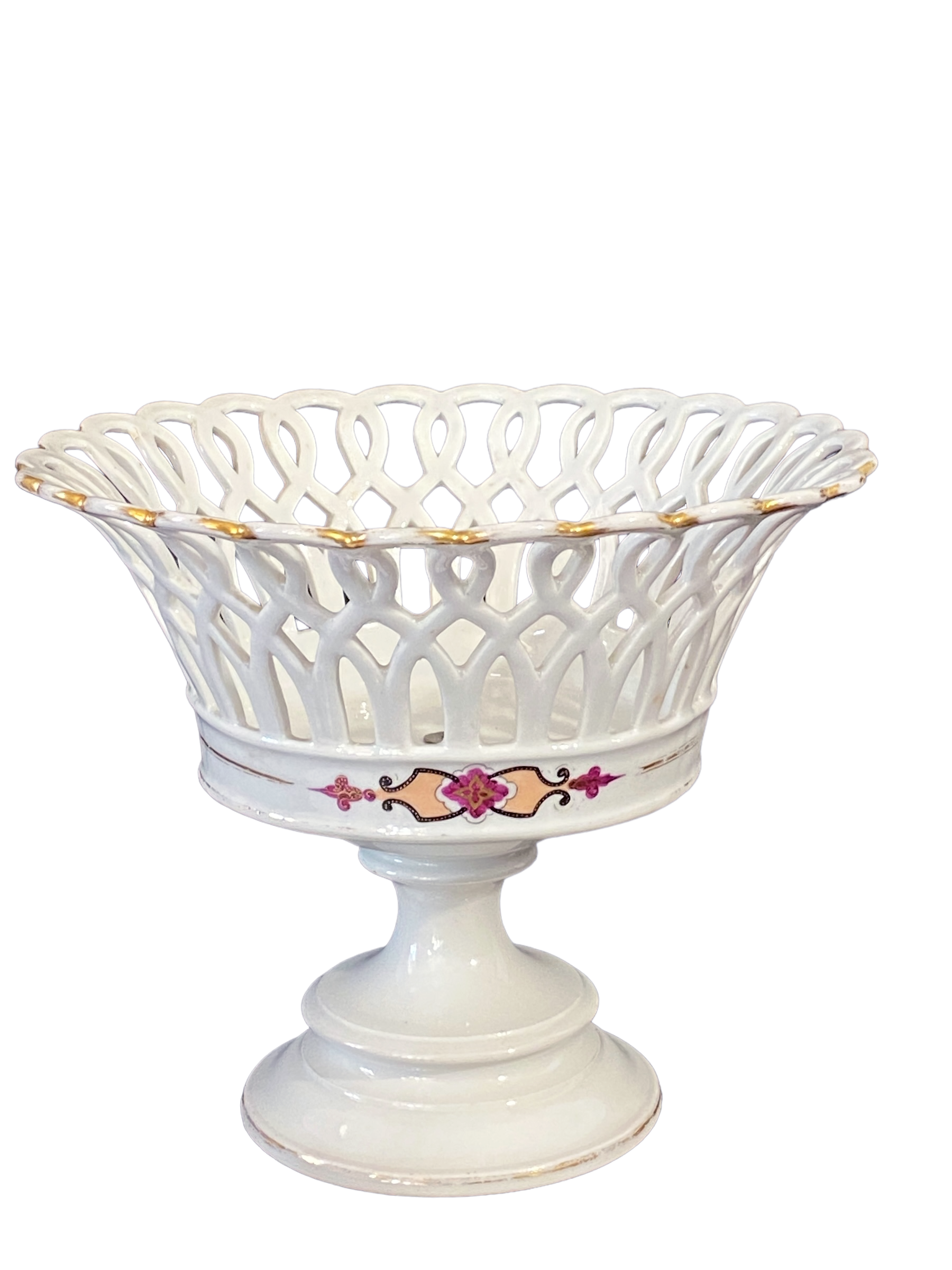 19th century old Paris porcelain reticulated compote (corbeille, fruit basket) in tazza form with gilded decoration (late 19th century).shown minor gilt loss overall good condition 7.5" H by 9" diameter