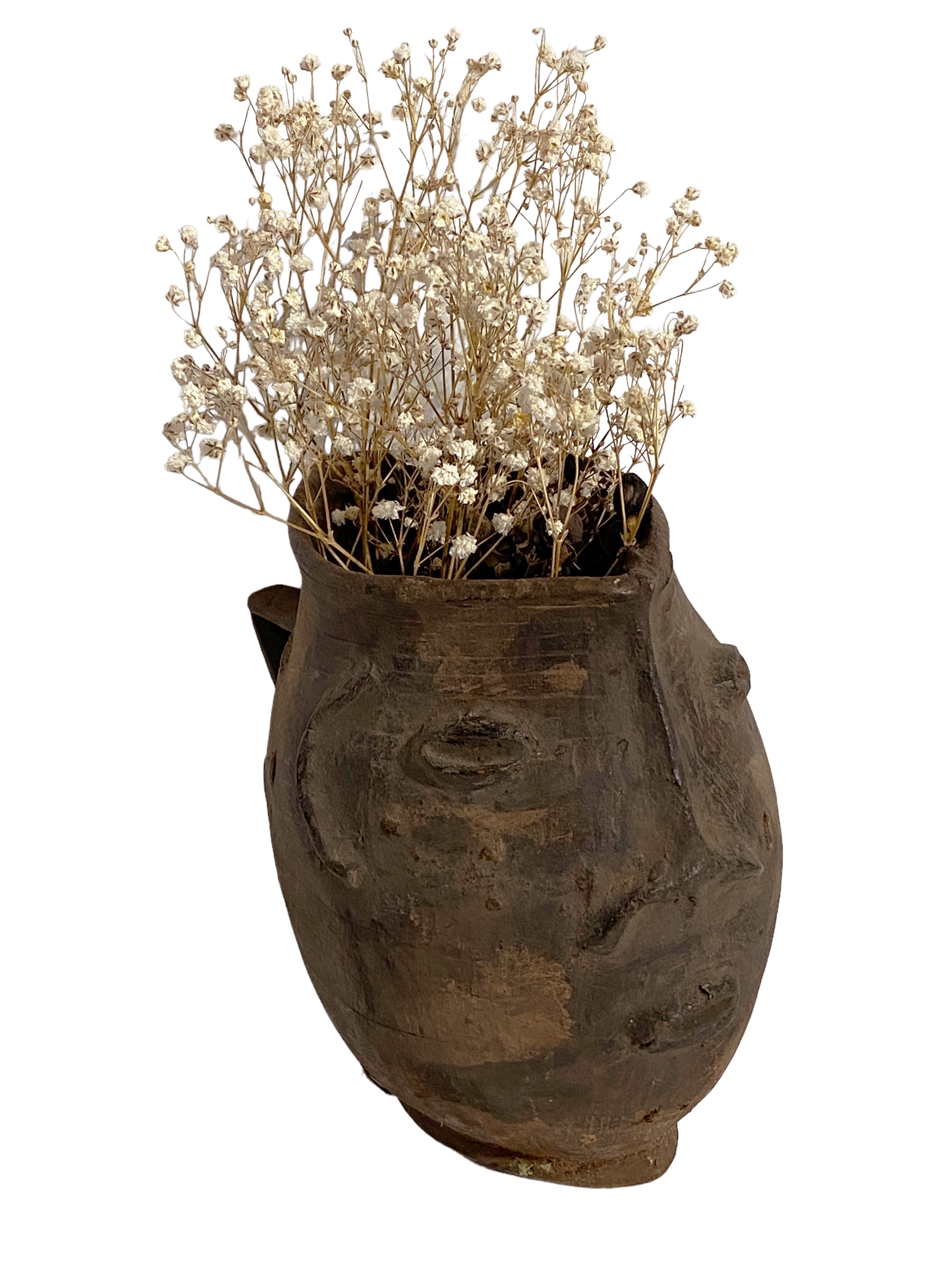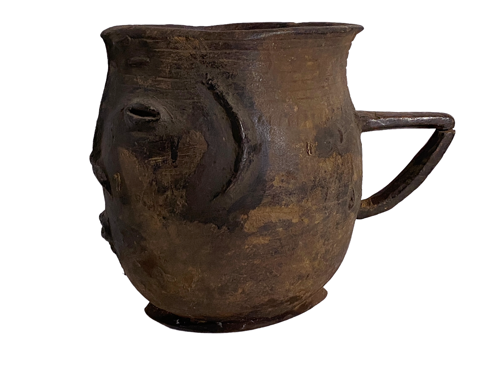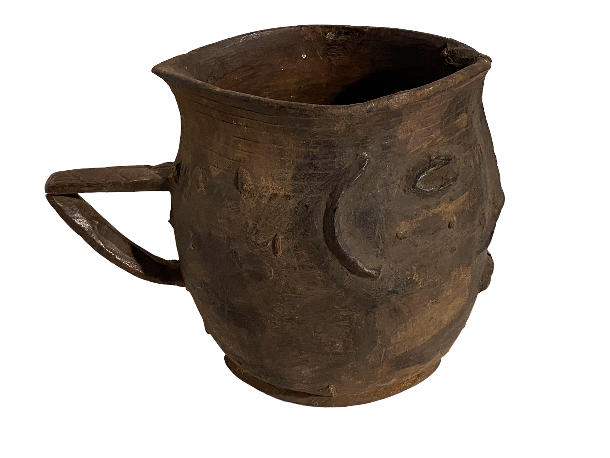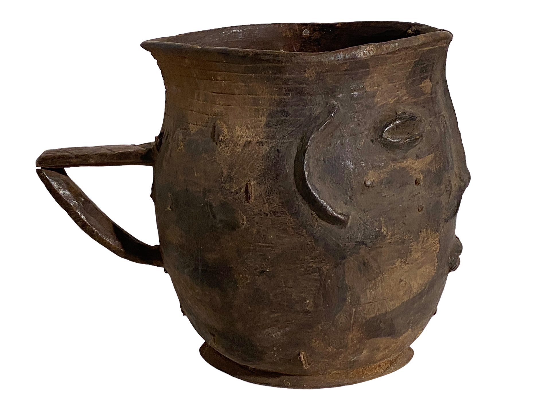 A well carved Kuba wooden cup in the form of a human head. Figural cups such as this cups are among the most popular artifacts found in the Kuba region in the savanna region of the southeastern part of Democratic Republic of the Congo. These cups may be seen as the consecration of decorative art among the Kuba. Kuba society is devoted to the visual: The art of decoration reigns supreme. Kuba art is prized both for the quality and care of their craftsmanship and for the astounding power of their design (Bwiin) which touched sensitivity of western collectors and artists. 7" H by 9" D by 5" W