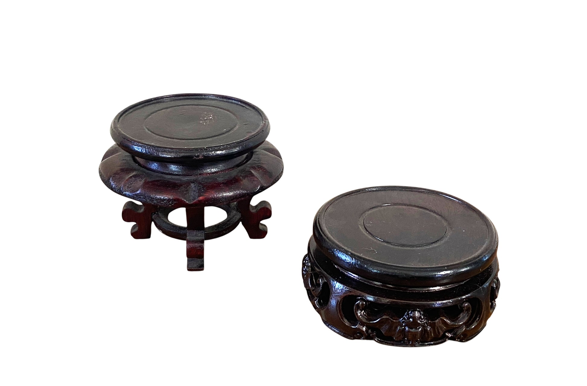 Oriental solid carved wood set of two stands for collectables, with open work make the perfect base to showcase your object and enhance its looks.Deep rosewood finish with natural lacquer coat and visible deep wood grain. ( the displayed items are not included in the sale) 4" widest part 3"w top 3' H and by 4" widest d by 3.5" D by 1.75" H .