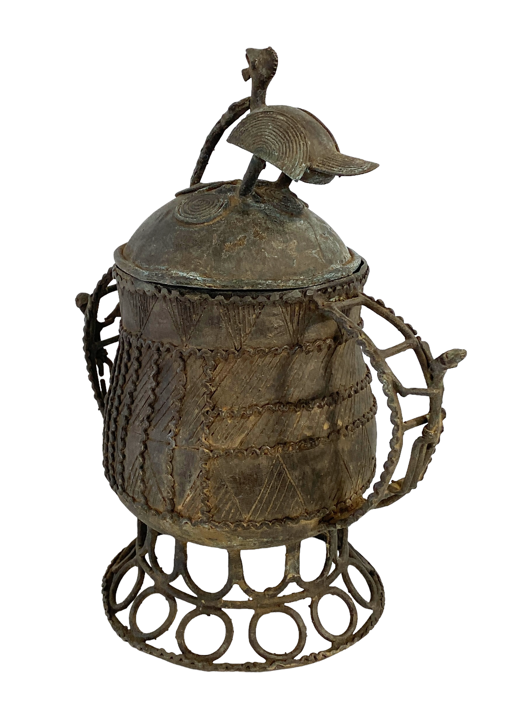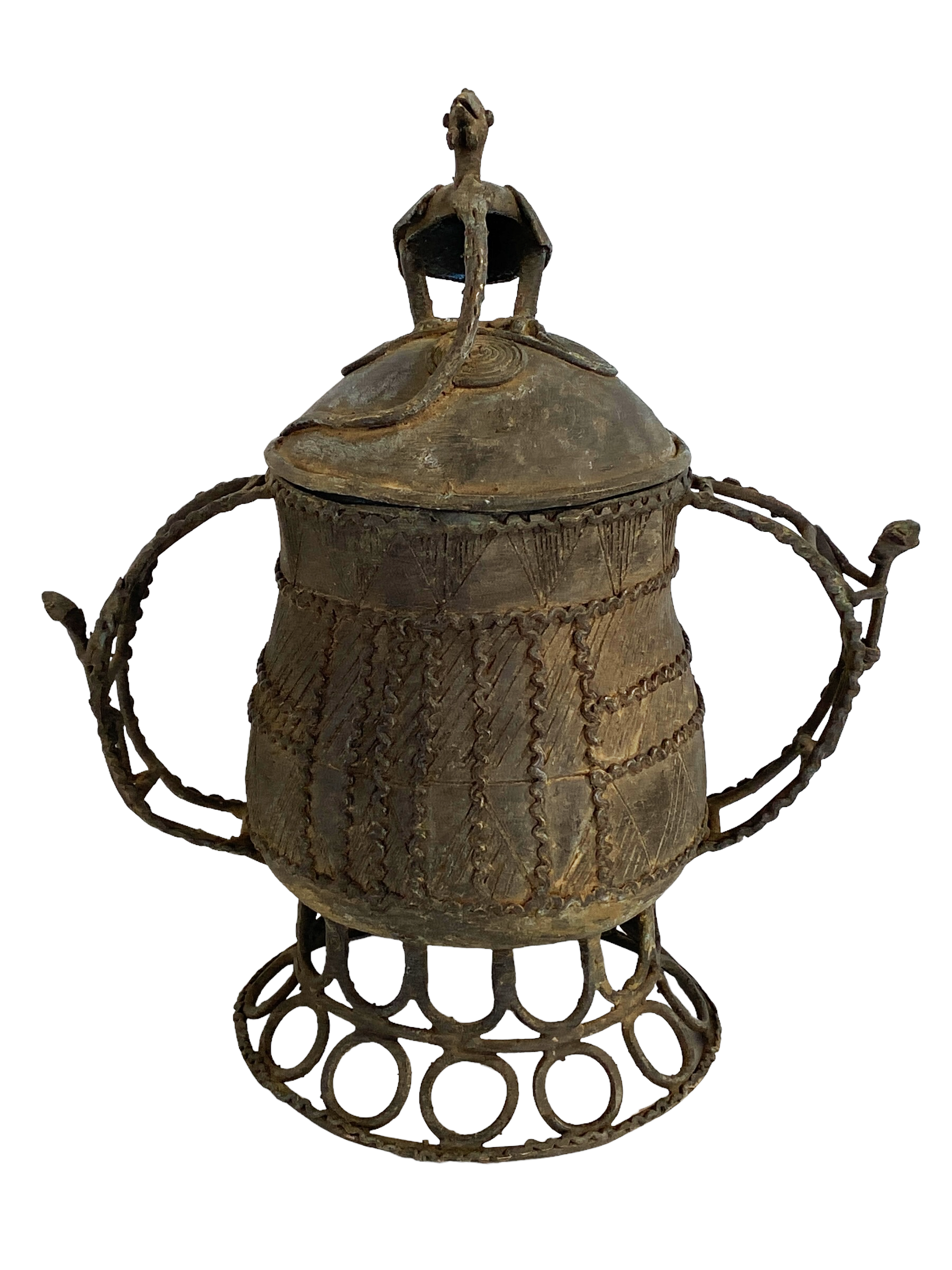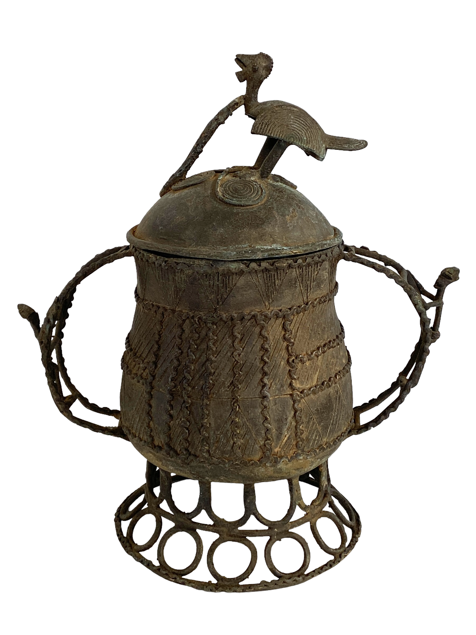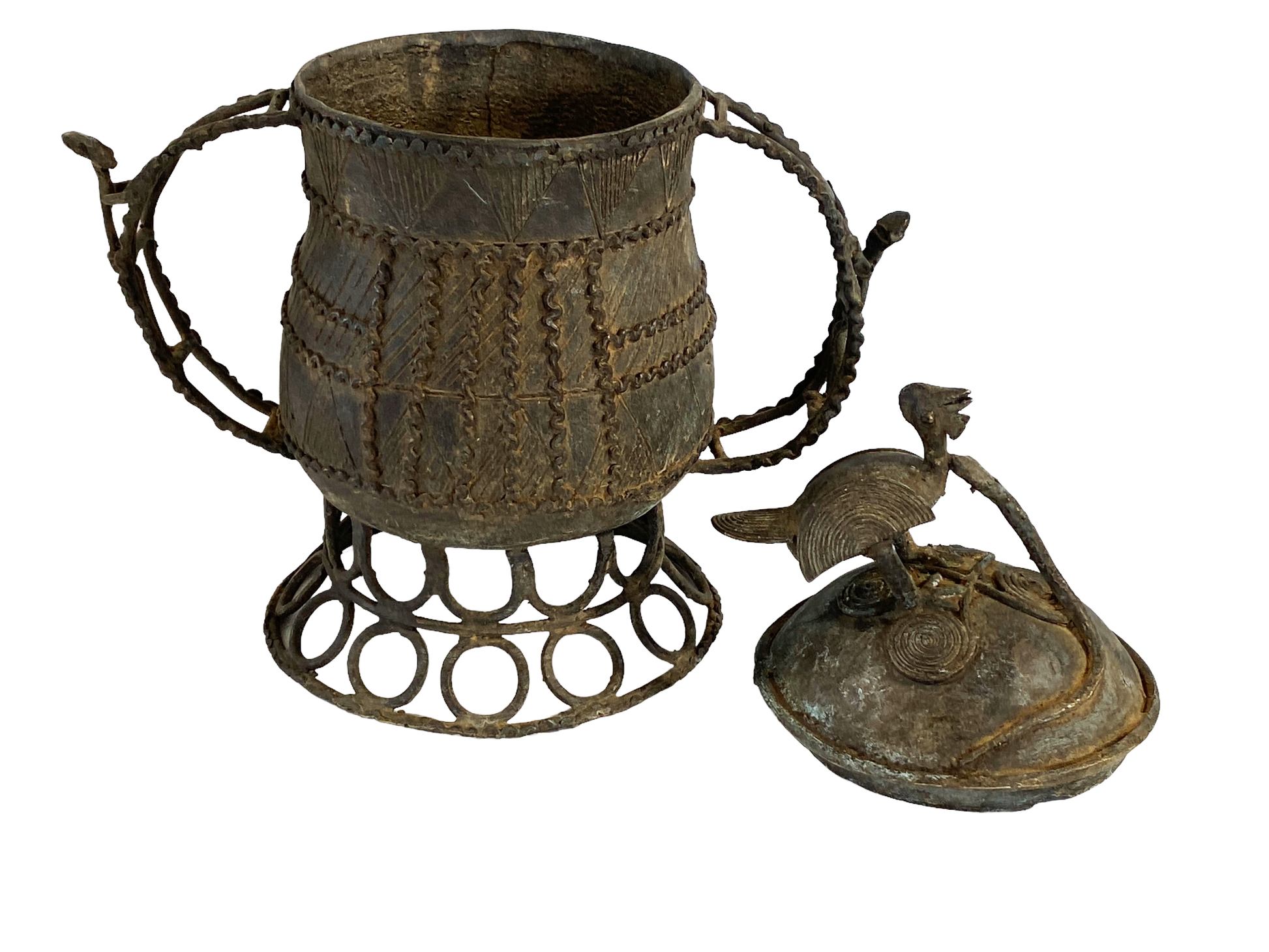 This exquisite cast bronze vessel, known as a kuduo, was historically reserved for the elite members of the Akan kingdoms. Inside the kuduo, people would typically store gold dust, nuggets, and other personal items of significance. This item features a standing bird and snake on the lid handle, which is said to provide luck and protection, as well as two figures on the side handles. The vessel measures 10.75"h by 9"w by 5.5" D, and is even more impressive in person.