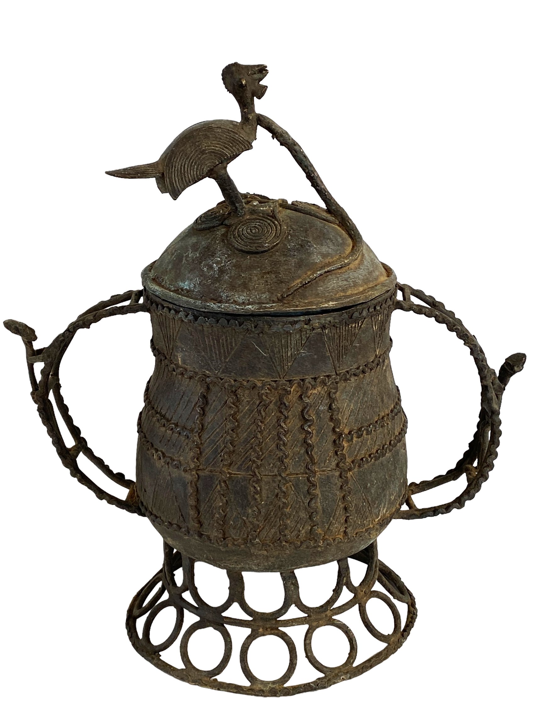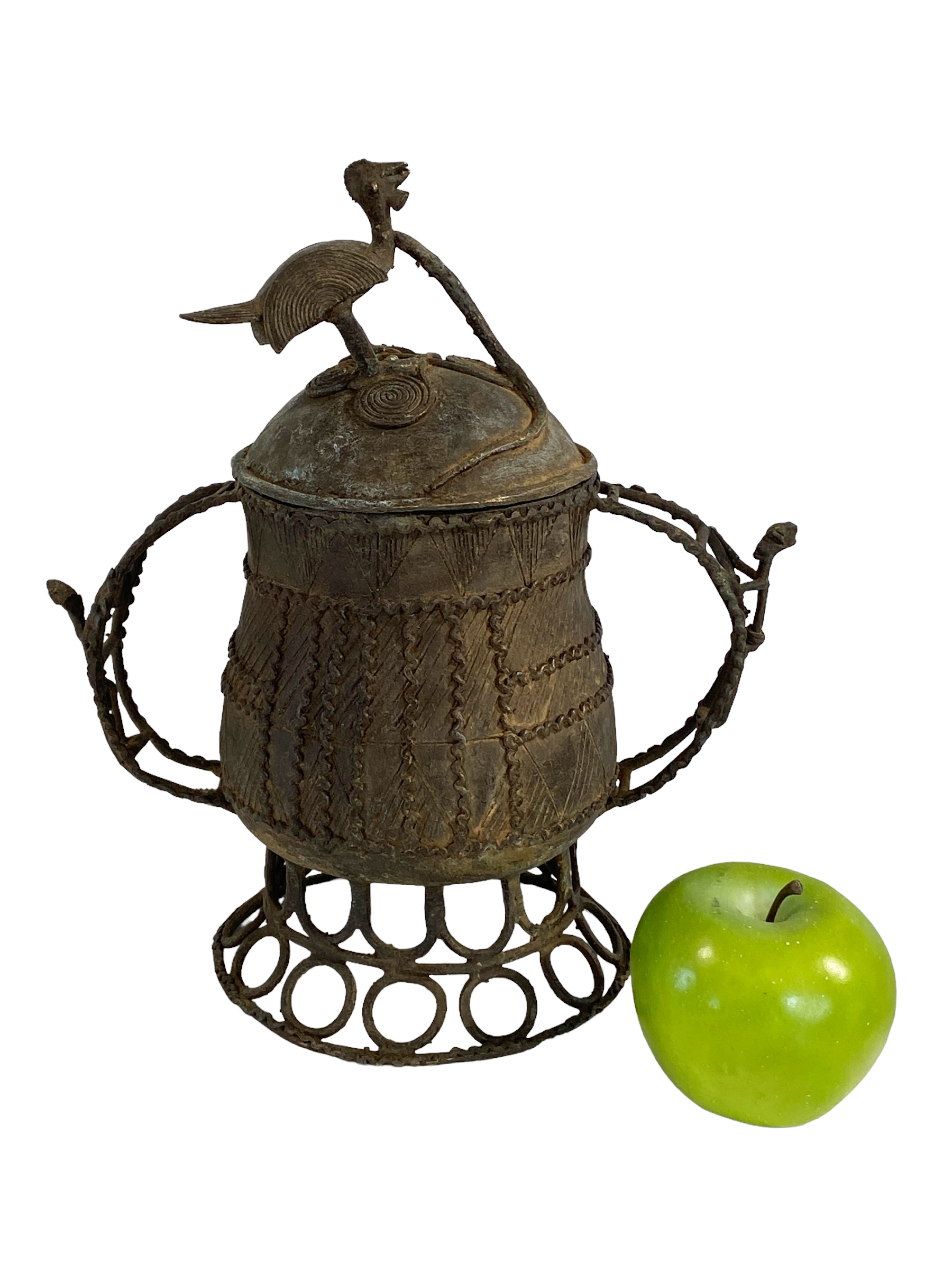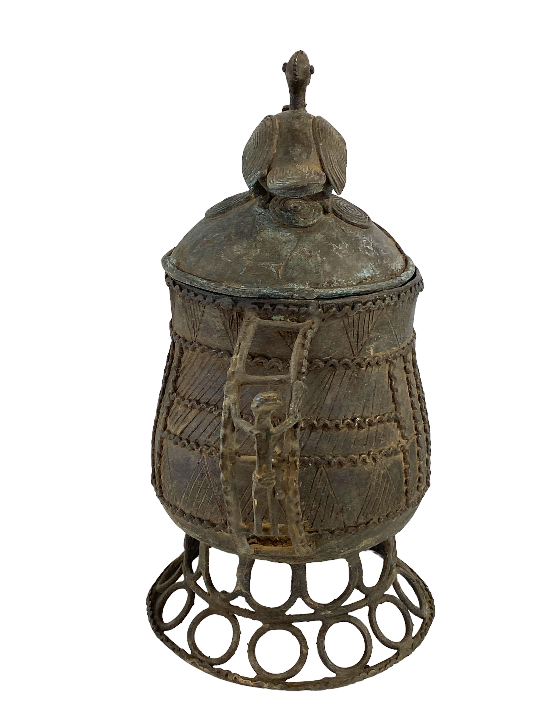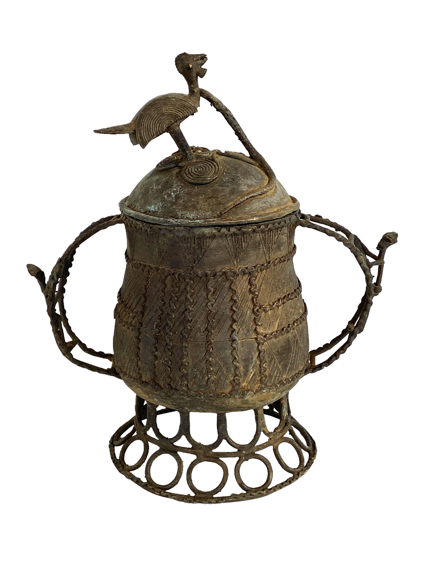 This exquisite cast bronze vessel, known as a kuduo, was historically reserved for the elite members of the Akan kingdoms. Inside the kuduo, people would typically store gold dust, nuggets, and other personal items of significance. This item features a standing bird and snake on the lid handle, which is said to provide luck and protection, as well as two figures on the side handles. The vessel measures 10.75"h by 9"w by 5.5" D, and is even more impressive in person.