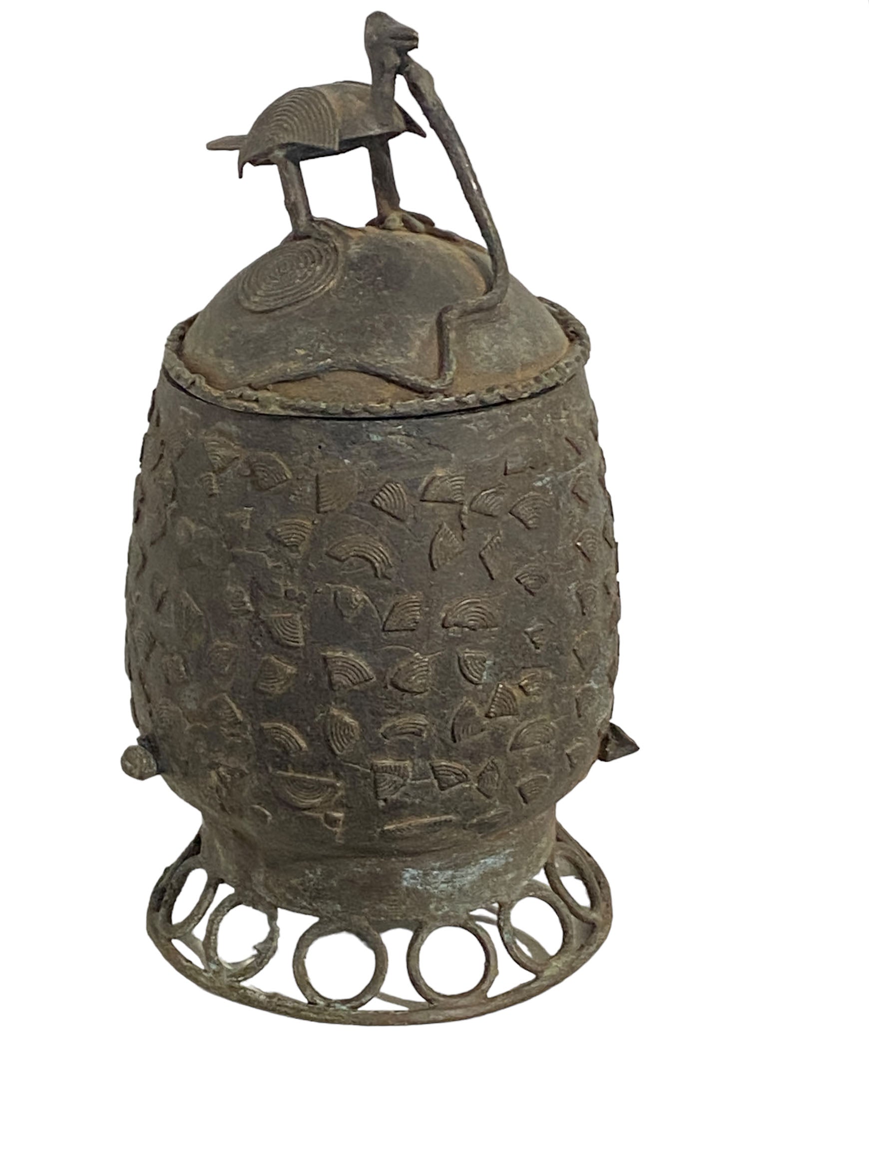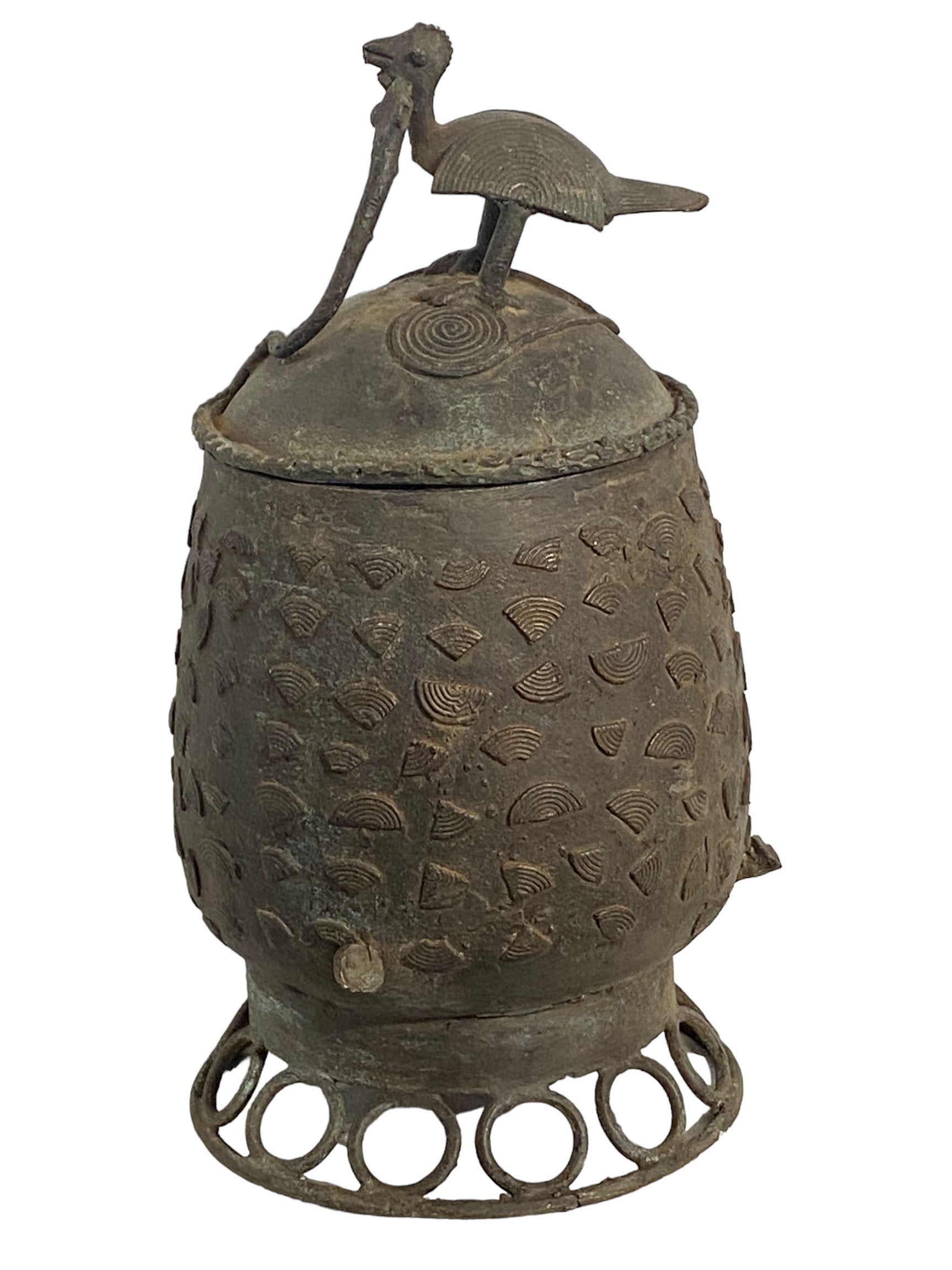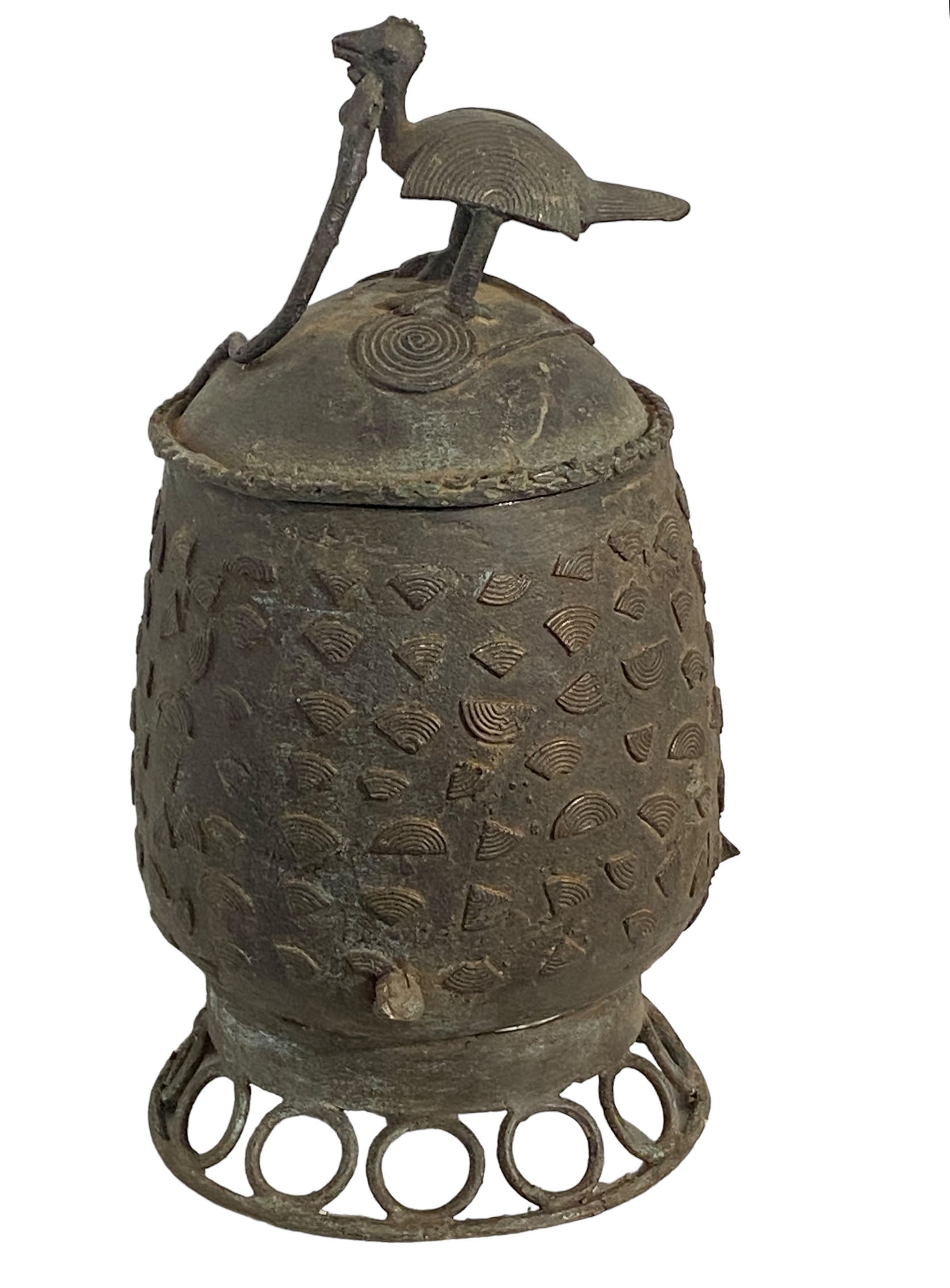 This exquisite cast bronze vessel, known as a kuduo, was historically reserved for the elite members of the Akan kingdoms. Inside the kuduo, people would typically store gold dust, nuggets, and other personal items of significance. This item features a standing bird and snake on the lid handle, which is said to provide luck and protection, as well as two figures on the side handles. The vessel measures 10.75"h by 9"w by 5.5" D, and is even more impressive in person.