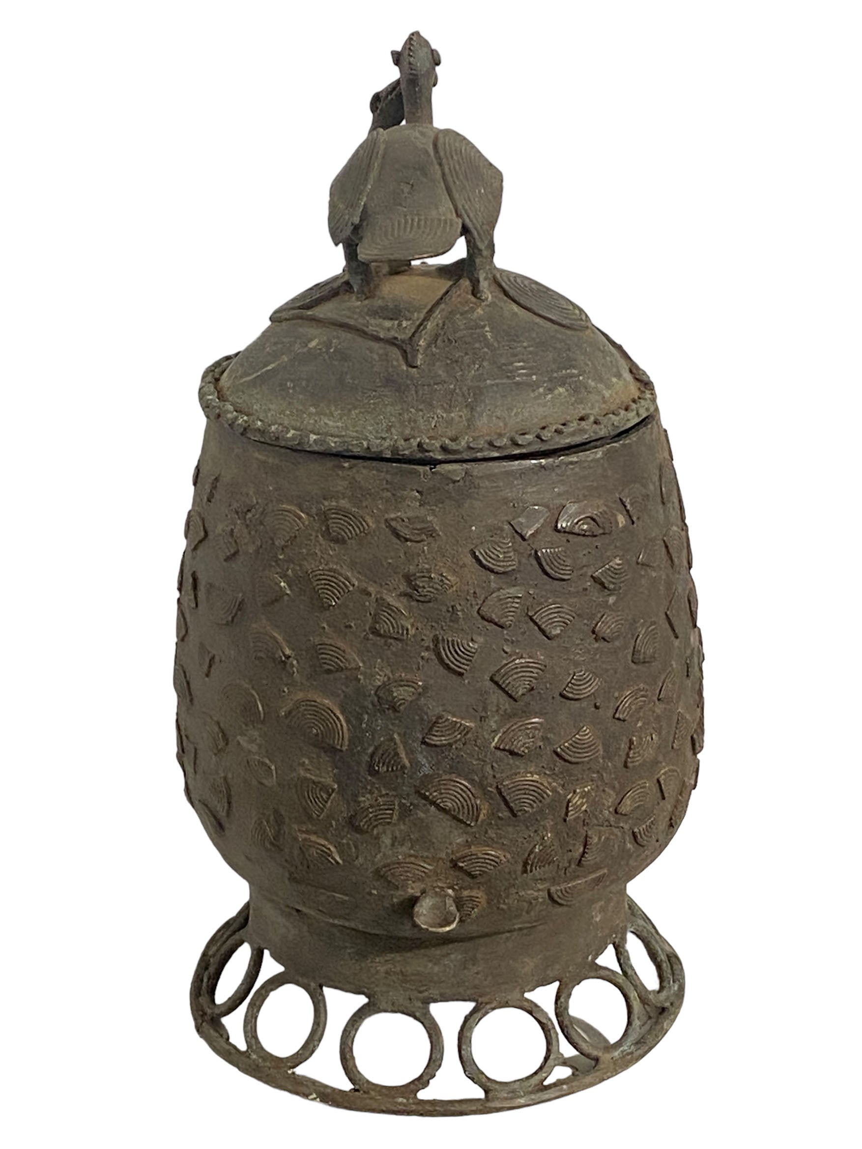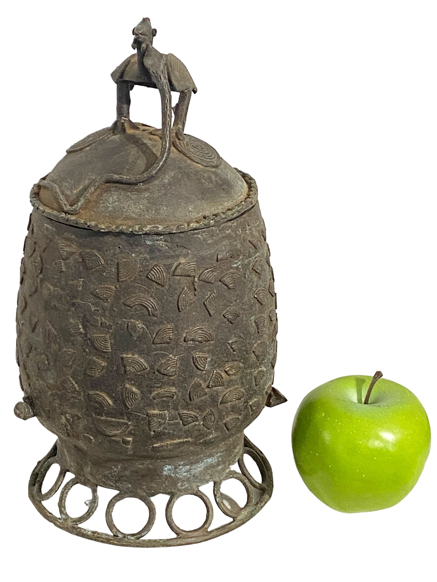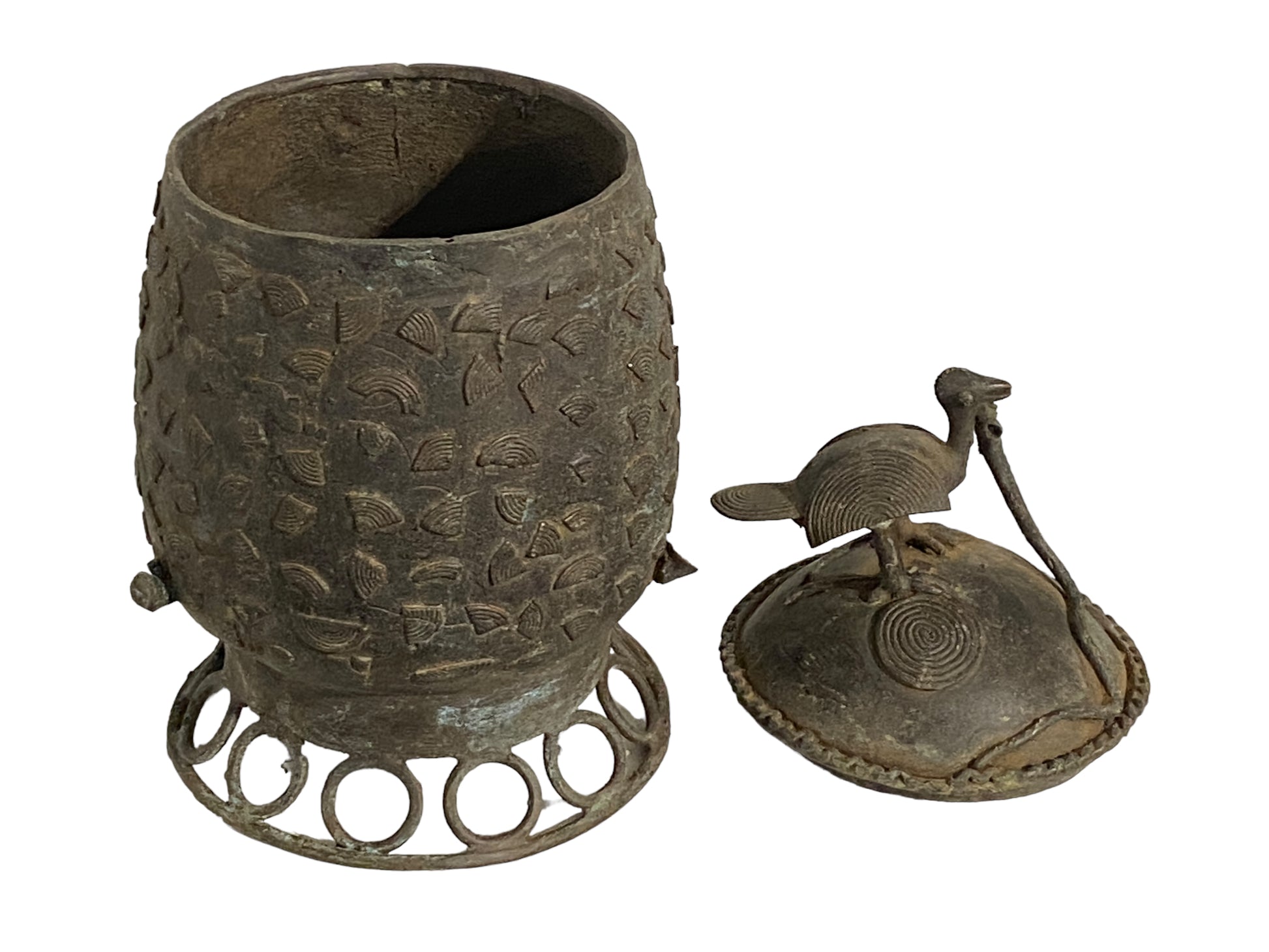 This exquisite cast bronze vessel, known as a kuduo, was historically reserved for the elite members of the Akan kingdoms. Inside the kuduo, people would typically store gold dust, nuggets, and other personal items of significance. This item features a standing bird and snake on the lid handle, which is said to provide luck and protection, as well as two figures on the side handles. The vessel measures 10.75"h by 9"w by 5.5" D, and is even more impressive in person.