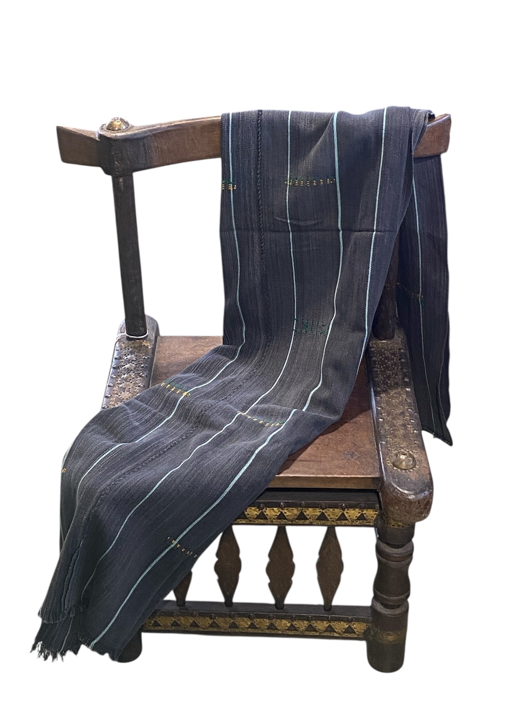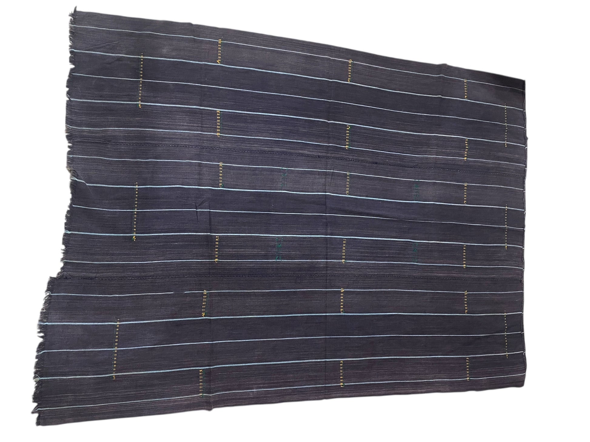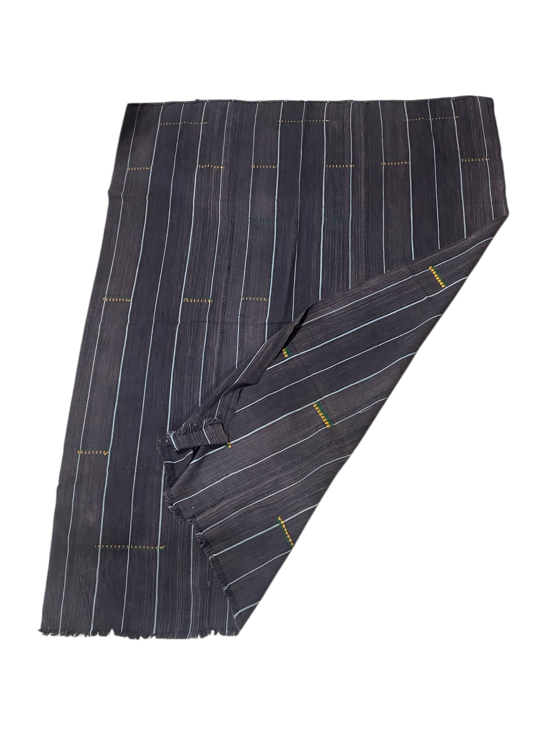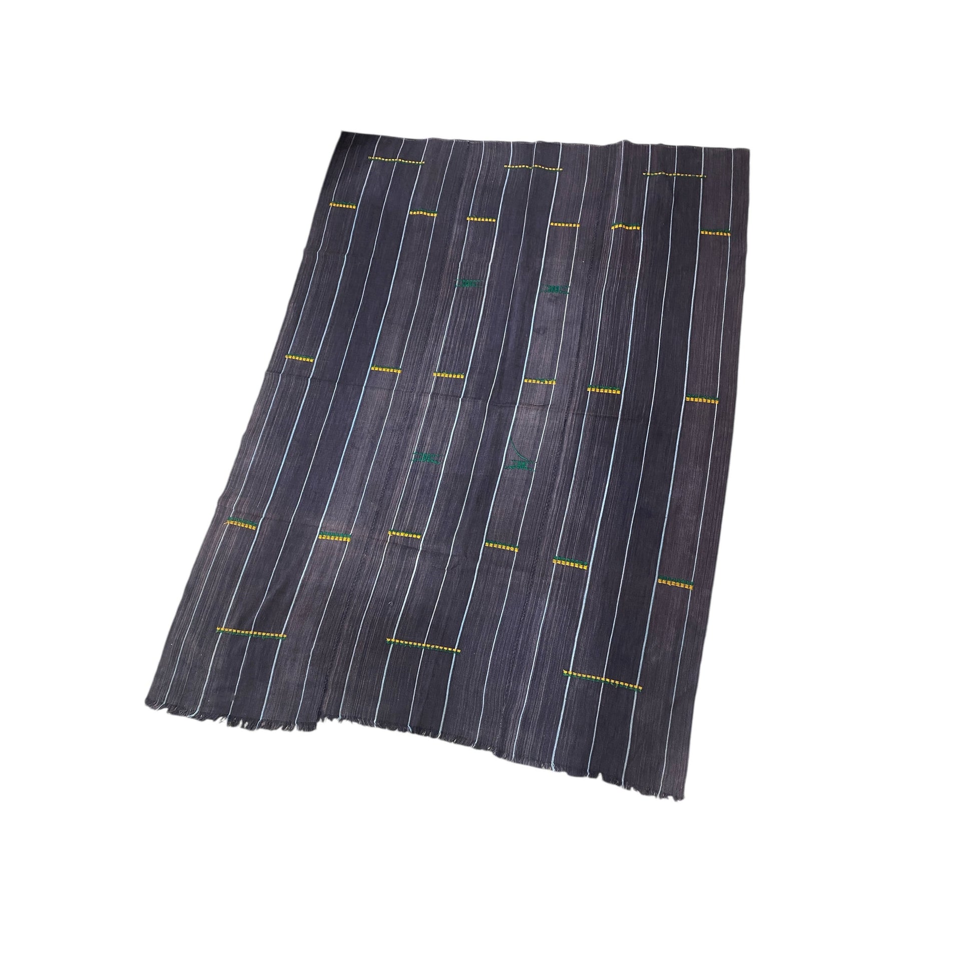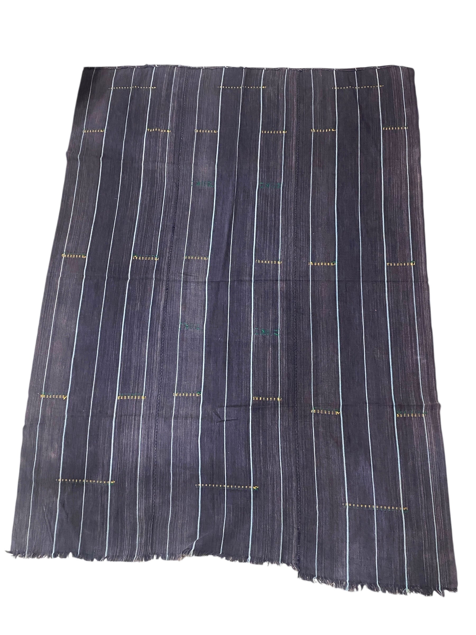 This superb textile from the Mossi people of Burkina Faso . Made from hand spun cotton dyed yarns woven into narrow strips and meticulously joined together, each cloth served as a traditional wrapper for Mossi women and with simple minimalist embroideries in yellow and green.