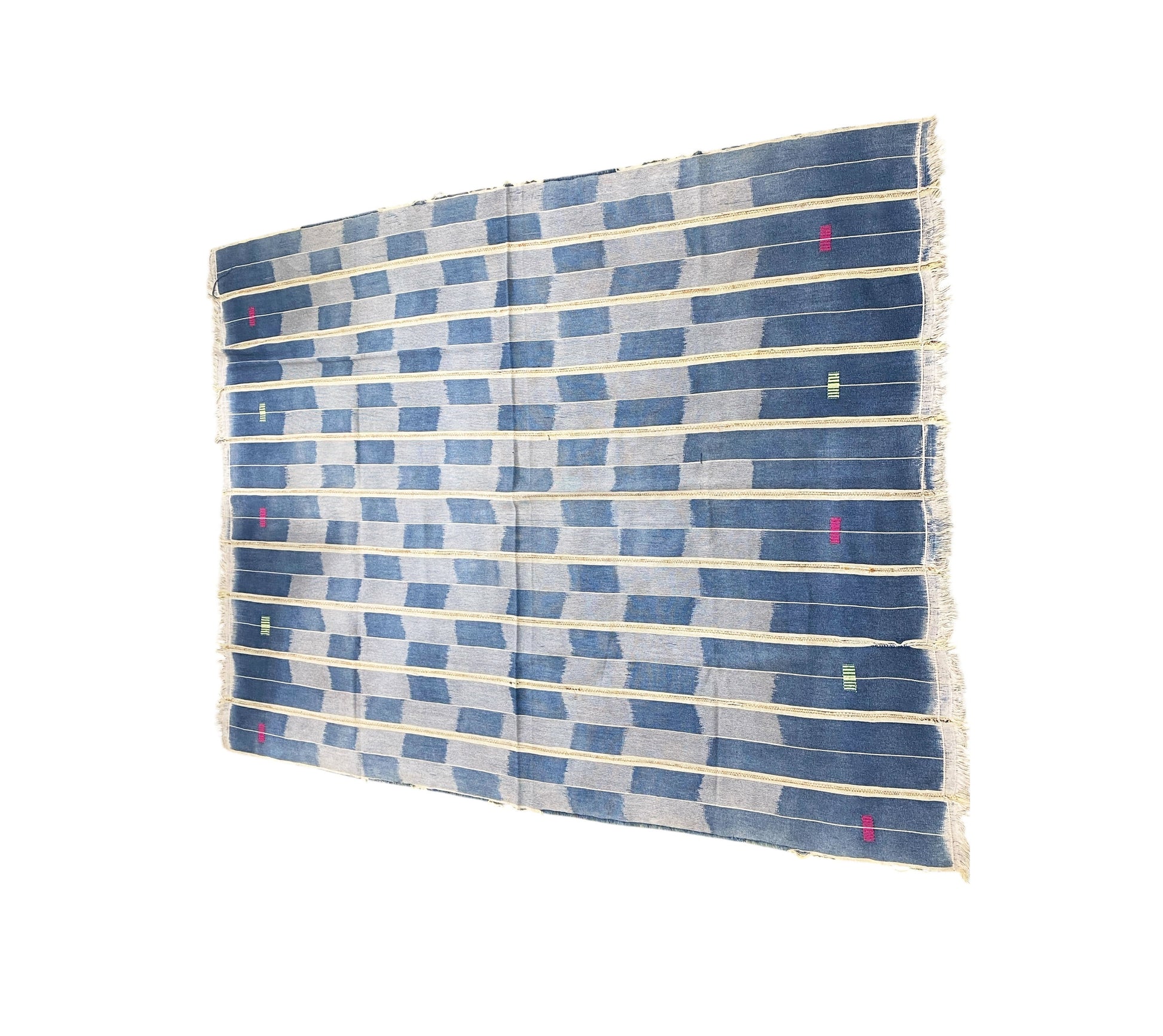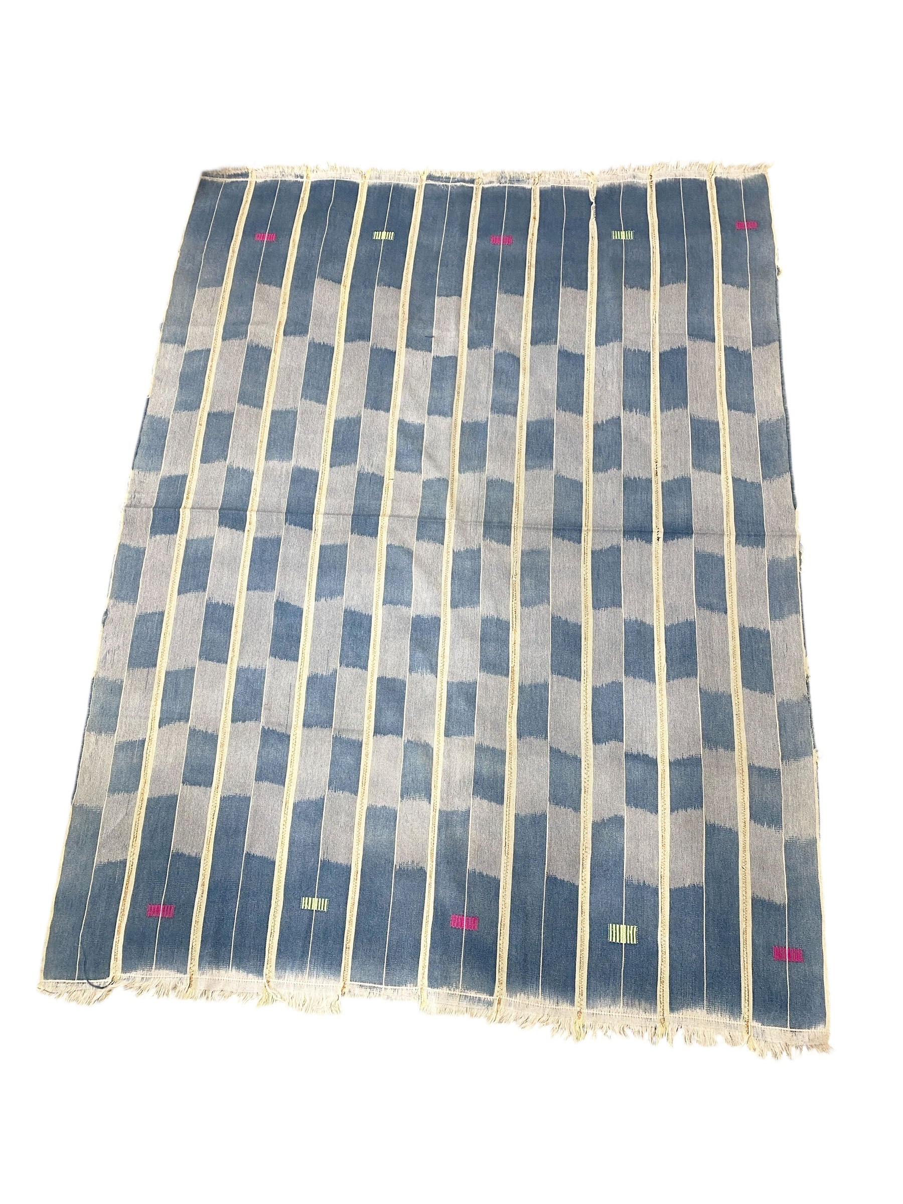 Superb and Unique Traditionally worn as a wrapper by women of the Baoulé tribe. Cotton yarn dyed in indigo, off white ,pink, and yellow using the warp ikat method, handwoven into narrow strips , then stitched together into a whole cloth. 100% cotton.