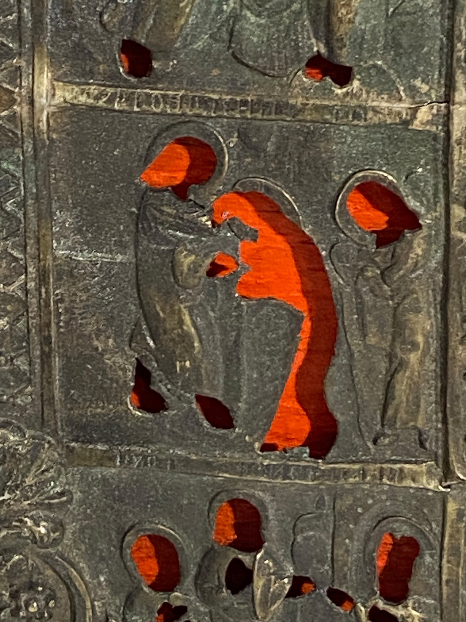 A riza or oklad, sometimes called a "revetment" in English, is a metal cover protecting an icon. It is usually made of gilt or silvered metal with repoussé work and is pierced to expose elements of the underlying painting