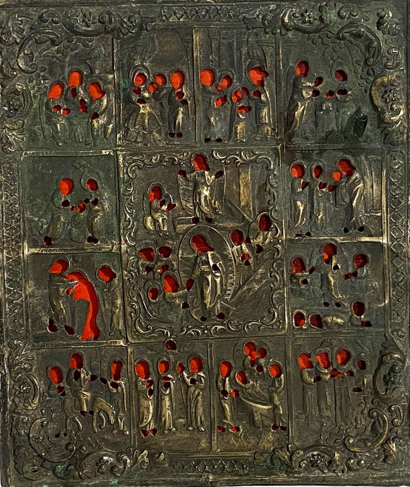 Antique Russian silvered metal Riza or oklad ( No icon just the Riza ) with amazing repoussse pierced work ,with a contemporary red painted wood frame ,No icon just the Riza .