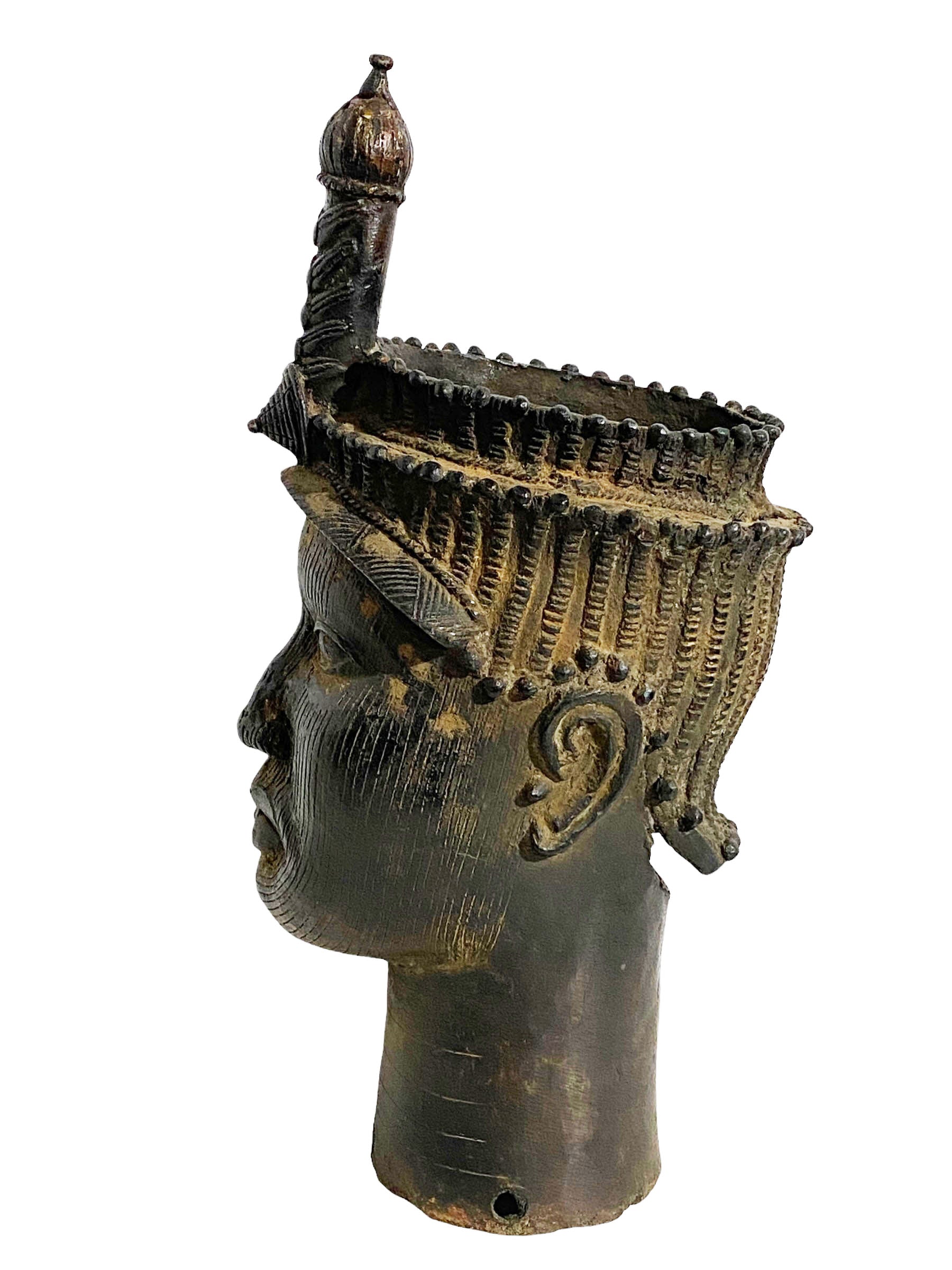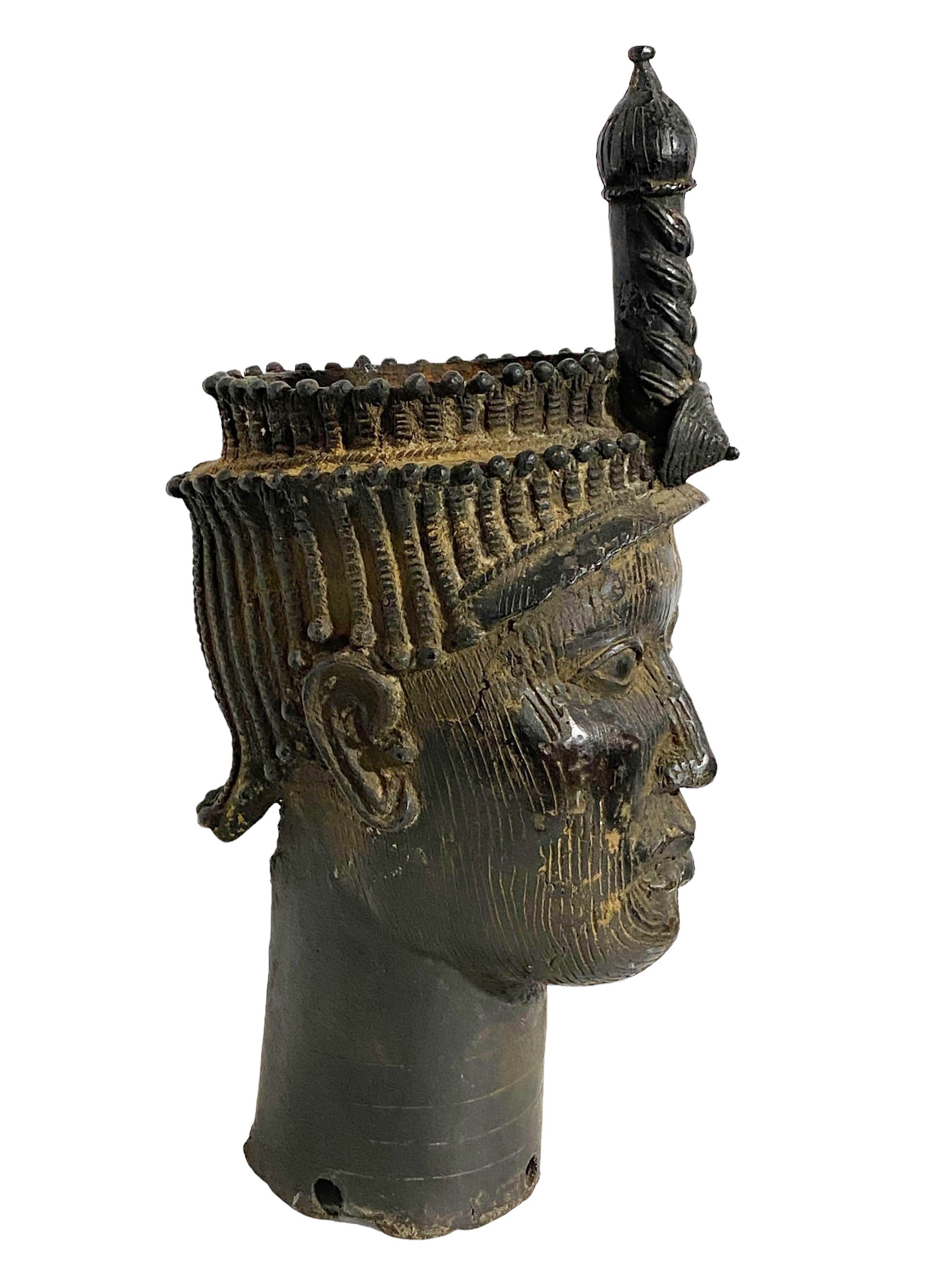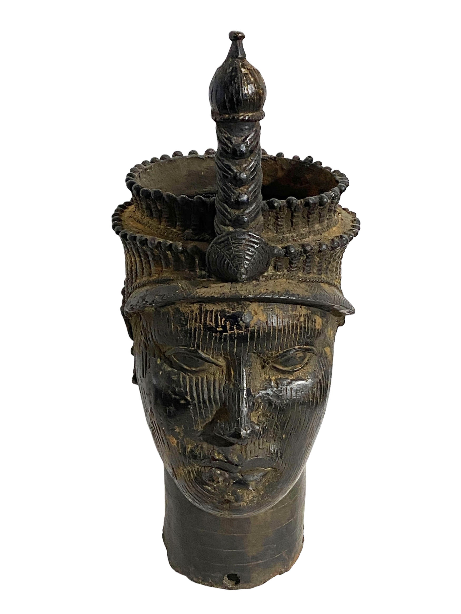 This exquisite vintage Benin Bronze Head of Oba from Nigeria is a remarkable piece, standing at a height of 19 inches, with a width of 7.5 inches and a depth of 9 inches. Although there may be some minor cast imperfections, the overall condition is still excellent. These Benin heads were typically placed on altars as a tribute to the divine ancestry of the great king, or OBA. The bronze casters guild, established in the 15th or 16th century, primarily created art for the royal family, with smaller pieces also available for chiefs. Using the lost-wax technique, each Benin casting is uniquely crafted, making it a one-of-a-kind piece.
