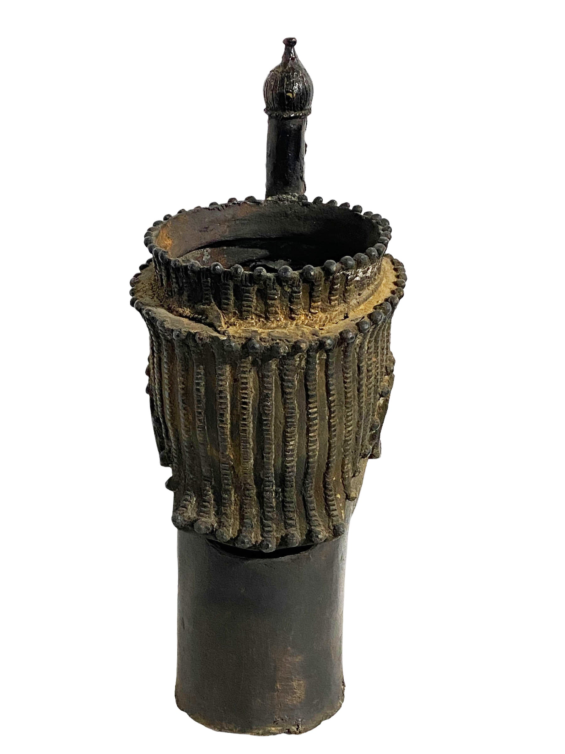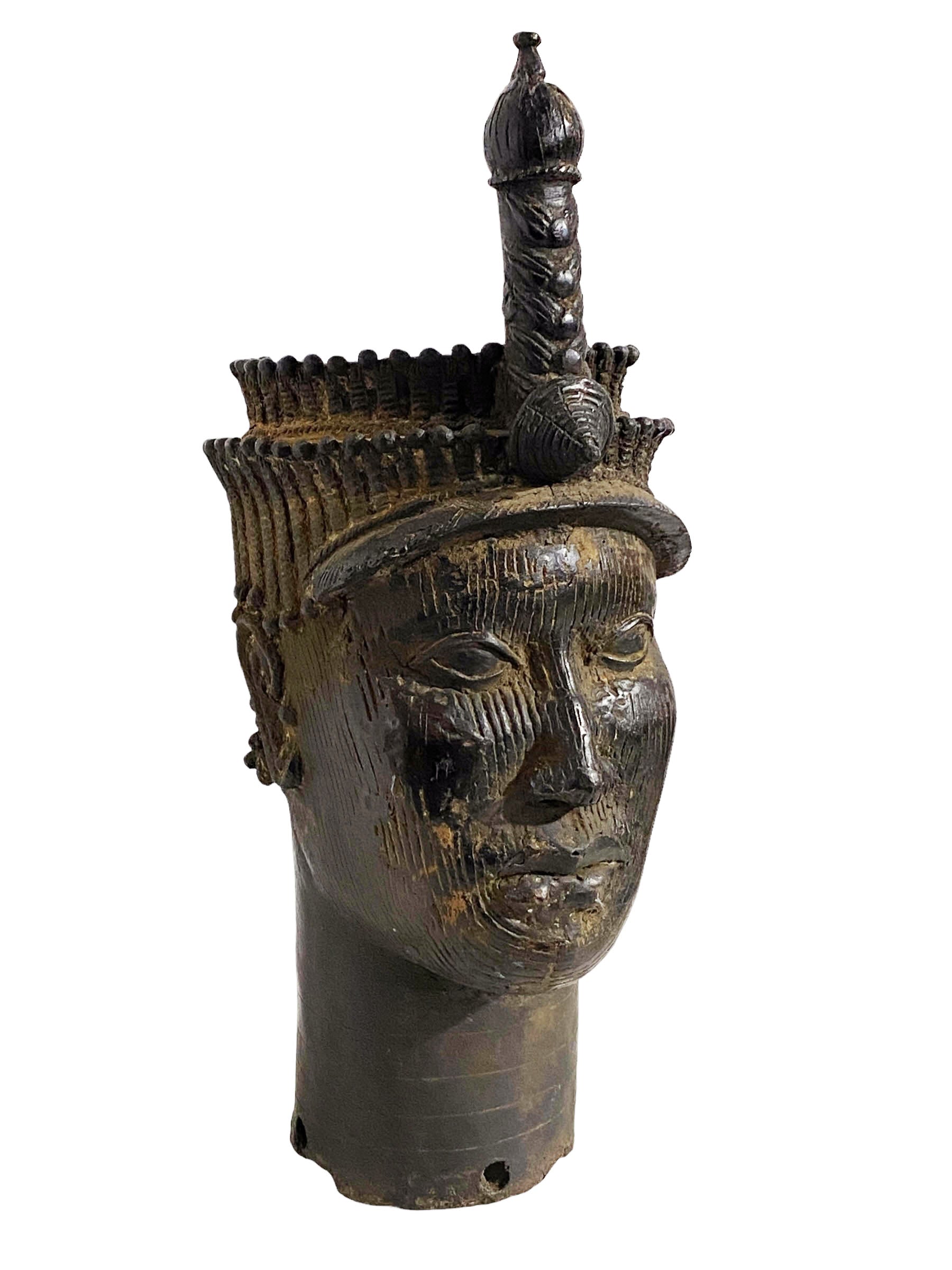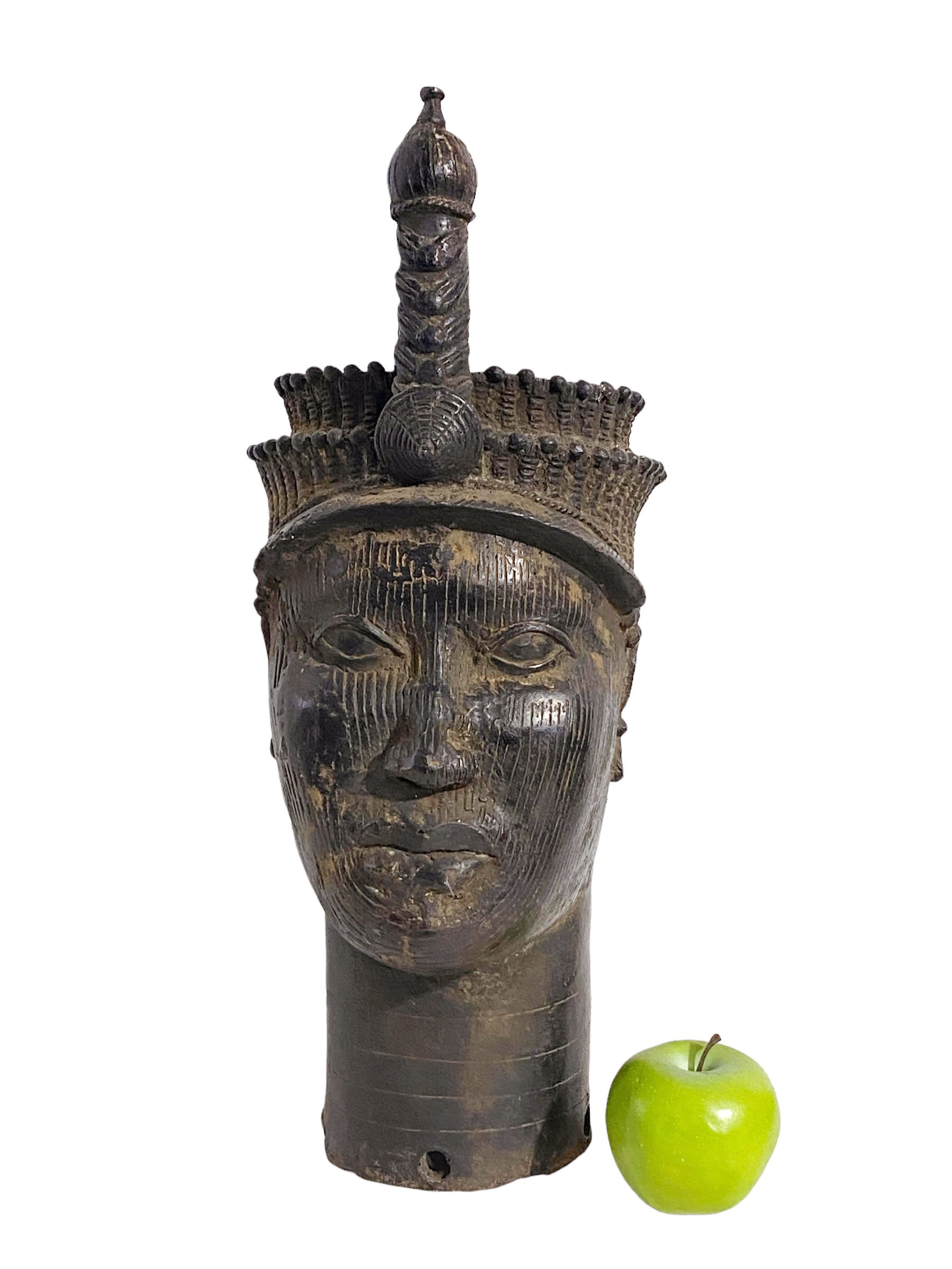 This exquisite vintage Benin Bronze Head of Oba from Nigeria is a remarkable piece, standing at a height of 19 inches, with a width of 7.5 inches and a depth of 9 inches. Although there may be some minor cast imperfections, the overall condition is still excellent. These Benin heads were typically placed on altars as a tribute to the divine ancestry of the great king, or OBA. The bronze casters guild, established in the 15th or 16th century, primarily created art for the royal family, with smaller pieces also available for chiefs. Using the lost-wax technique, each Benin casting is uniquely crafted, making it a one-of-a-kind piece.