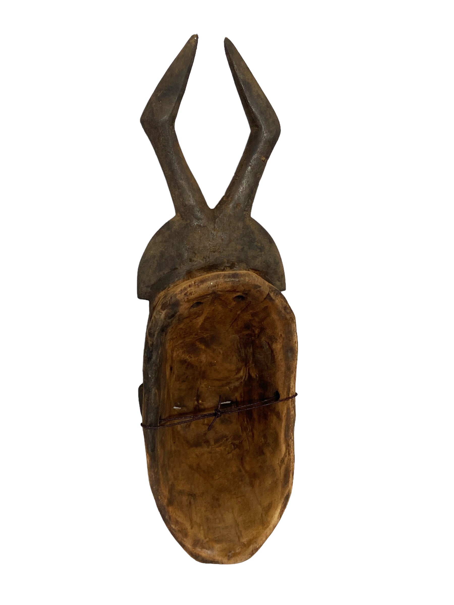 A superbly carved single-piece wooden Baule Kpan or Mblo Portrait mask stands at 17" tall, 5.25" wide, and 4" deep. These masks are traditionally performed during days of rest and to honor important visitors. This timeless artifact is a tribute to the exceptional skill of the Baule craftsmen of the past and potentially even to the original owner of the mask.