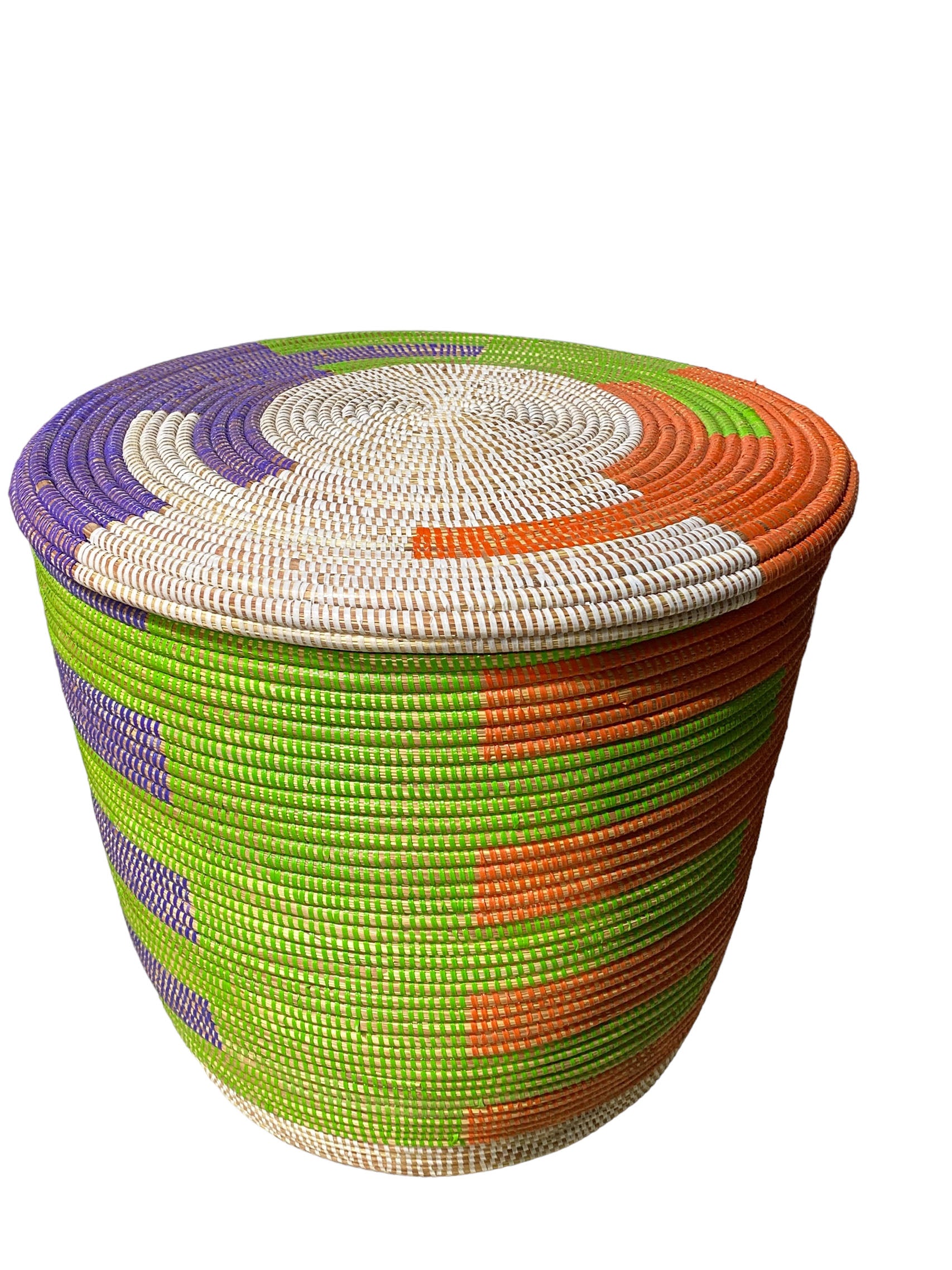 This large traditional basket with lid hails from Senegal, West Africa. It is handwoven by Wolof women in rural regions, and each piece is unique in terms of its patterning. These pieces makes a great decoration or gift and measures 17.5" in height and 19" in diameter.