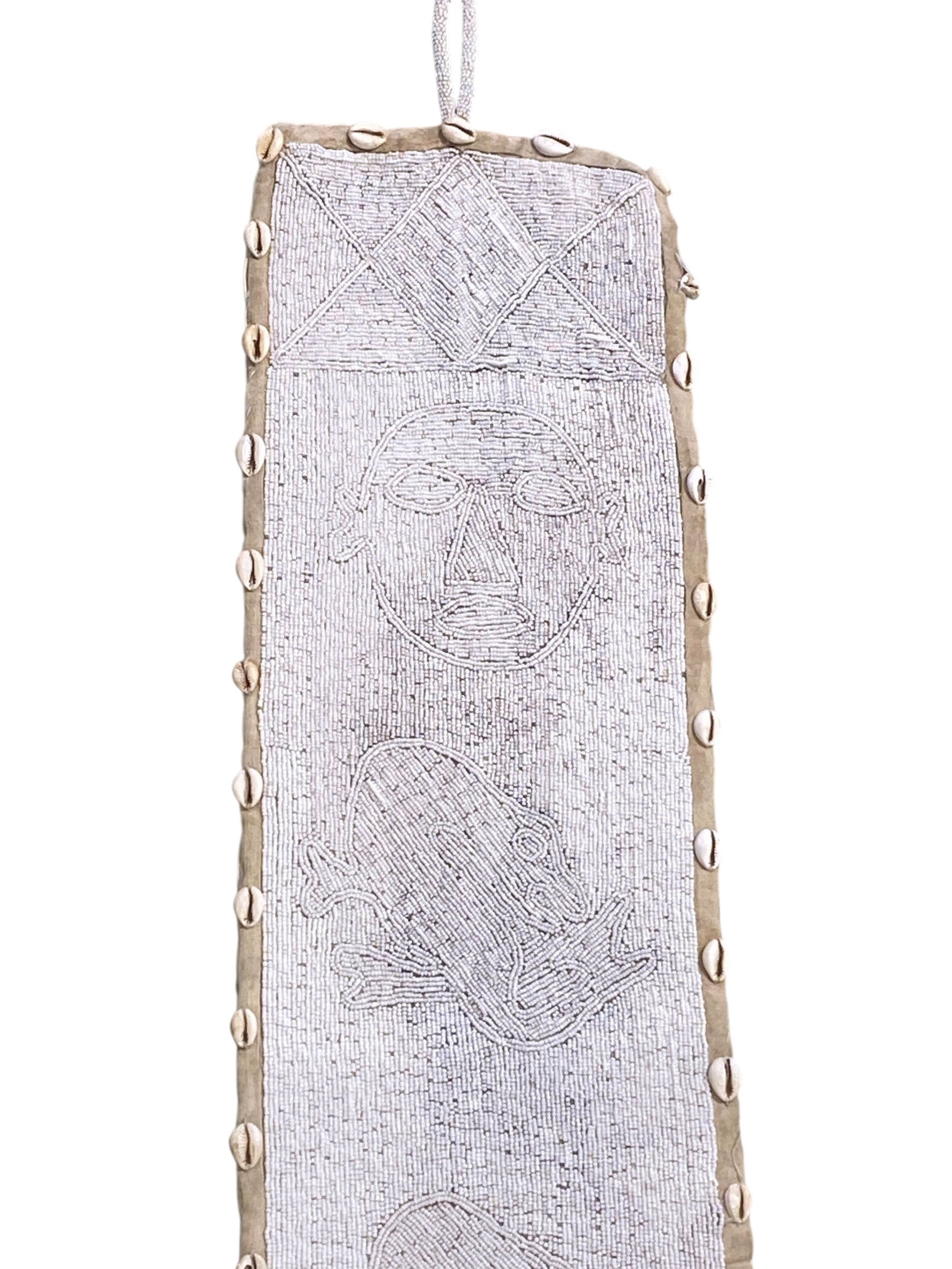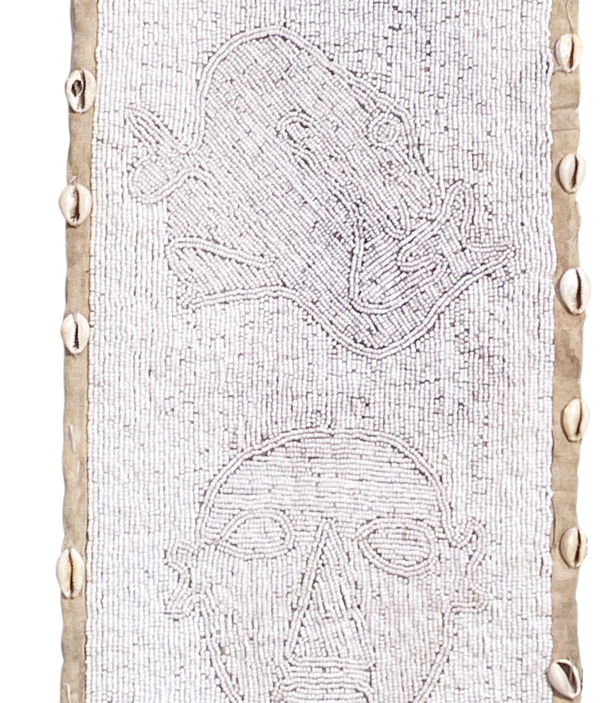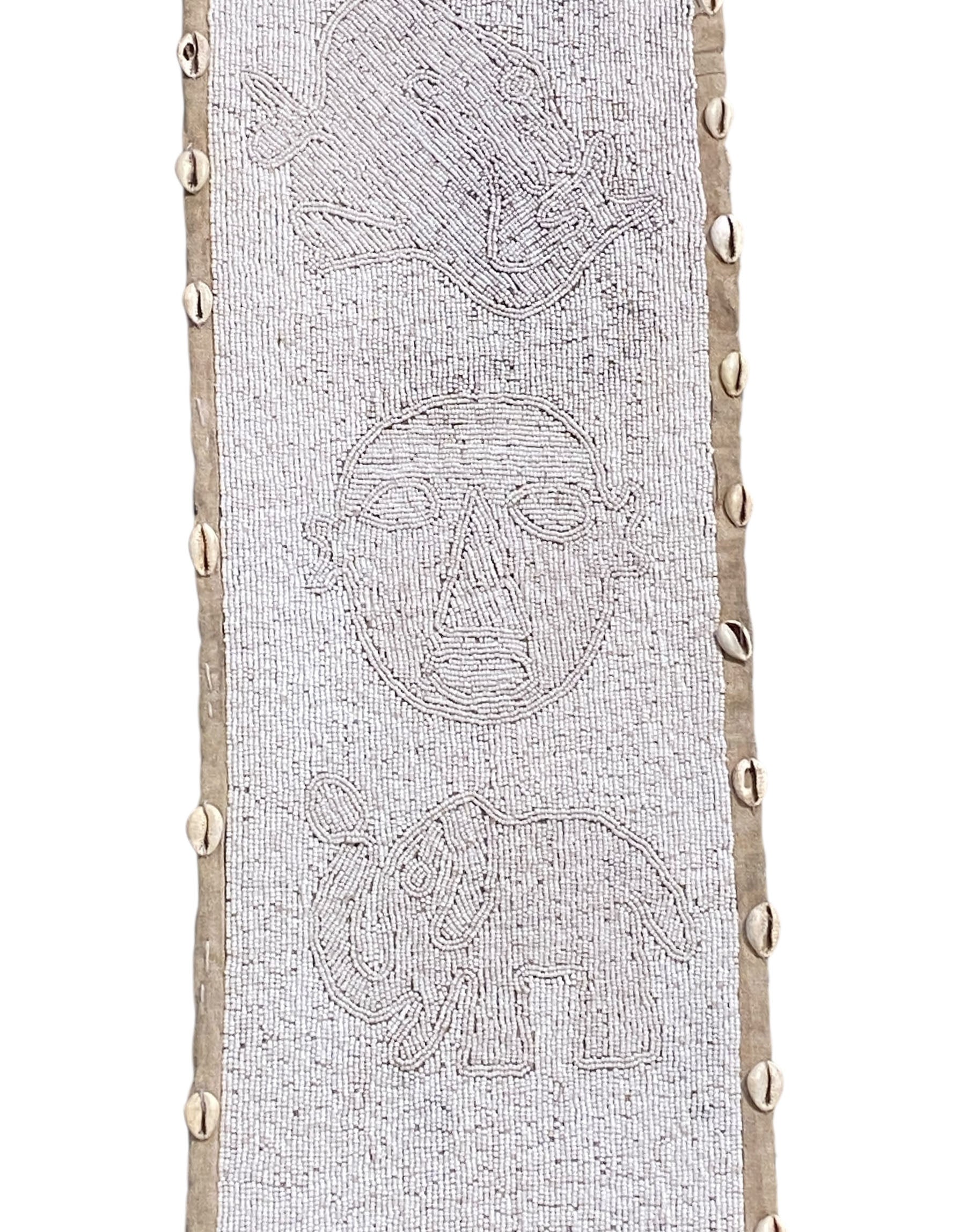 This is a beautiful Yoruba Beaded Sash comes from Nigeria. A beautiful example of a diviners belt or kings belt from the Yoruba Tribe of Benin Nigeria. Each figure face is associated with a different empowering God (Orisha). Animal Figures are symbols of the mystical powers of women. A diviner is one of the very few non royal persons permitted to use solidly beaded materials. These are usually reserved for the Yoruba kings. The Belts are as wonderful as wall hangings and decorative art in your home, as well as complimenting your collection.