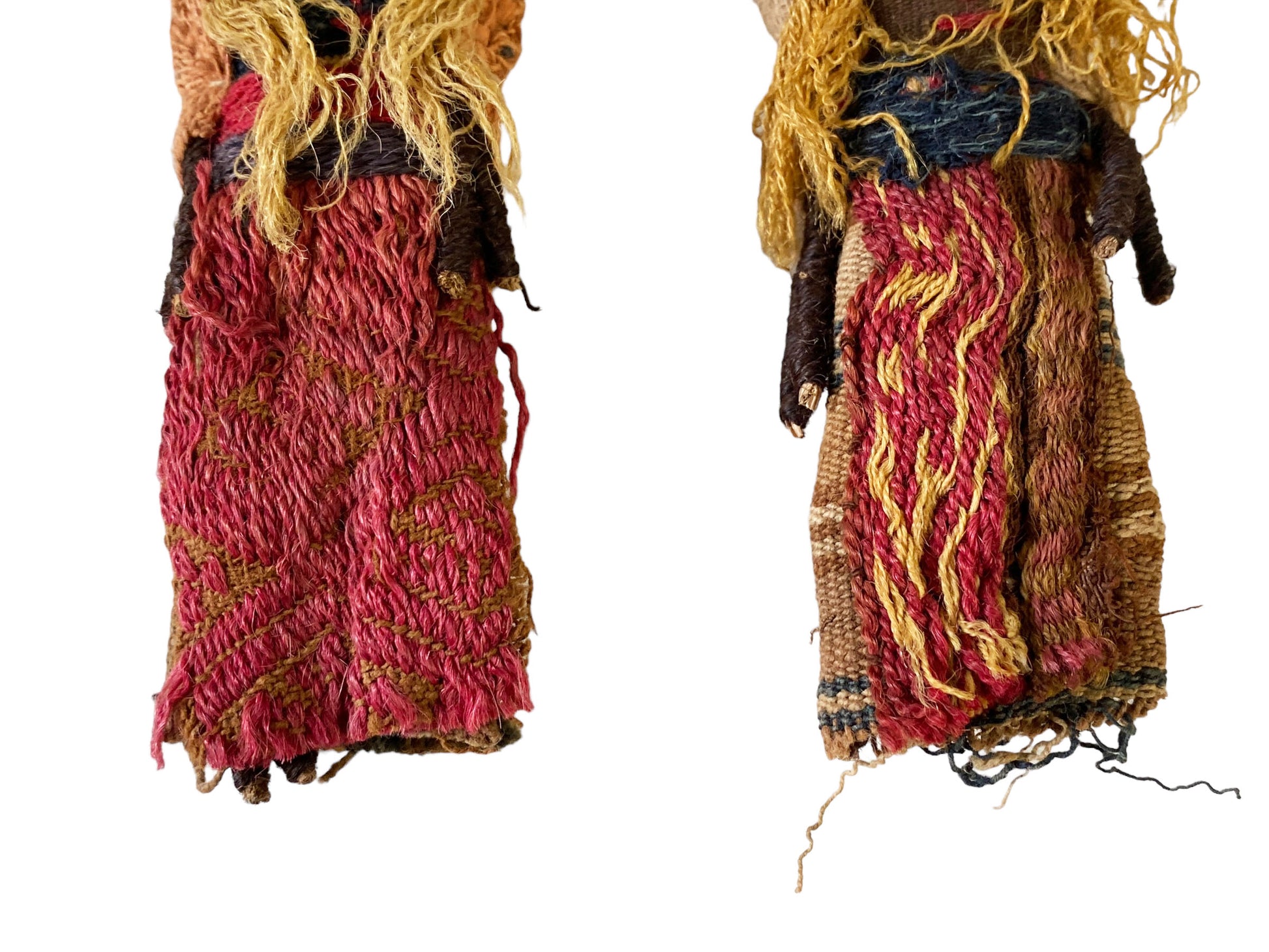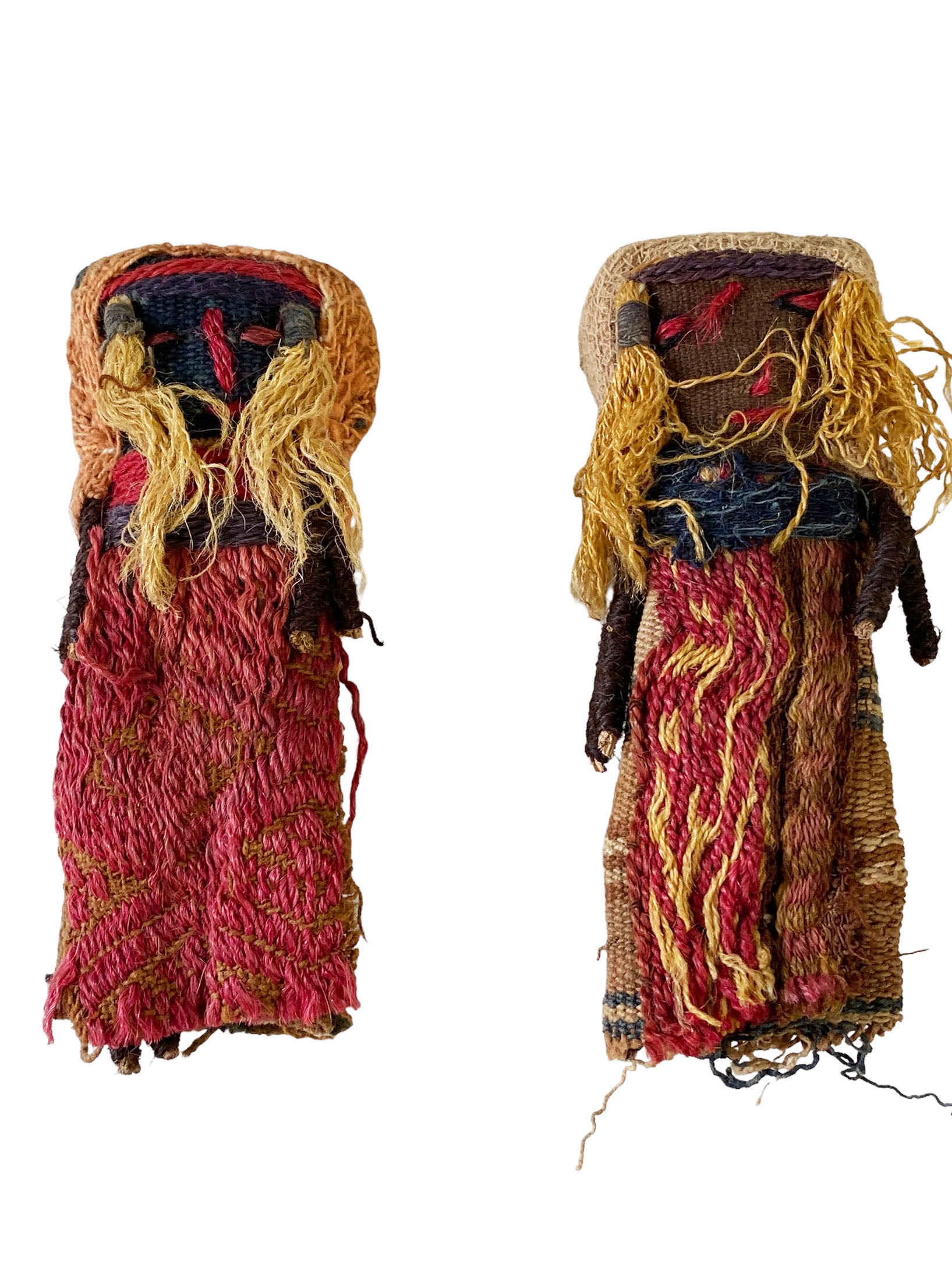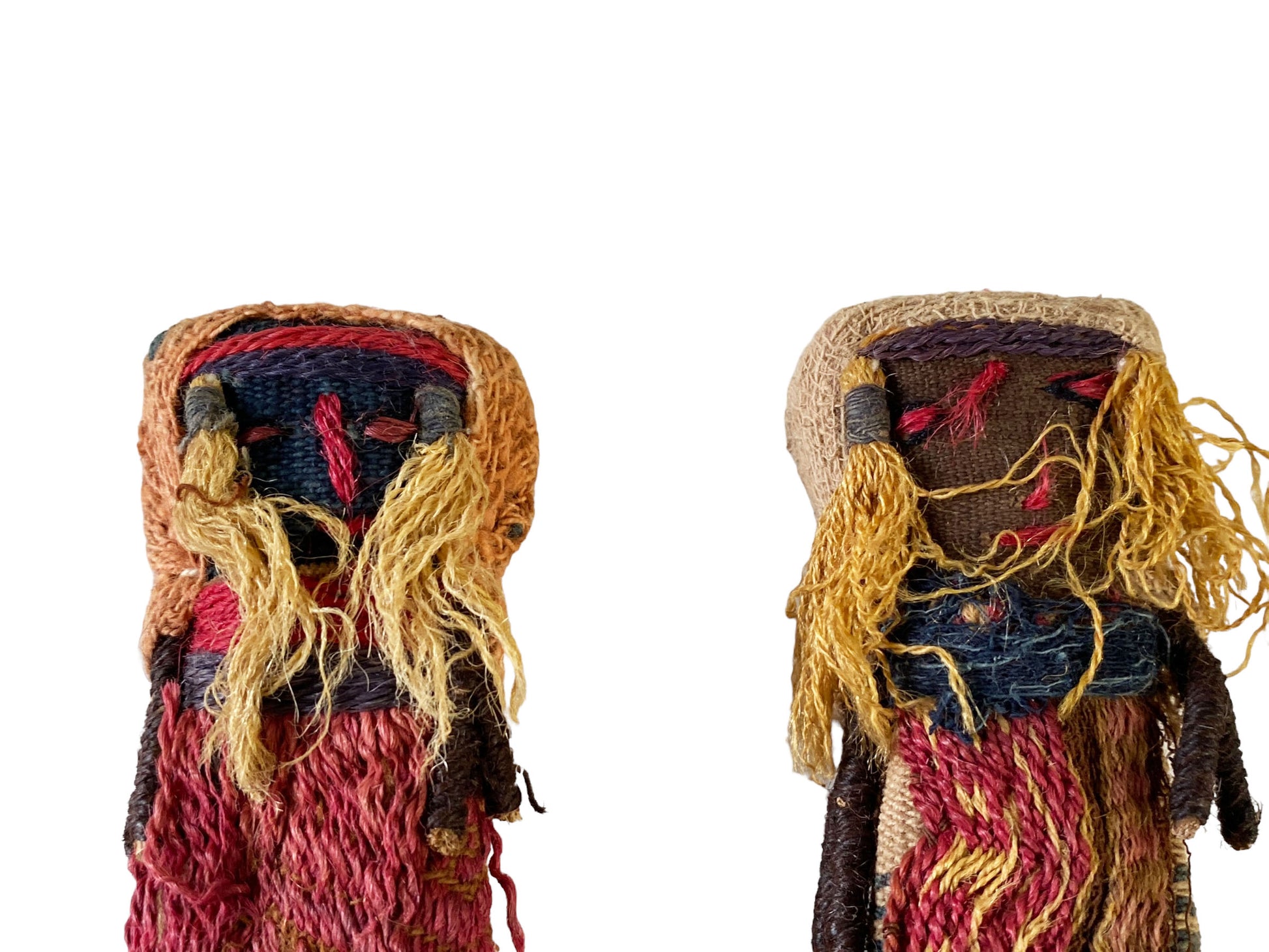 Dolls of this sort were historically buried alongside individuals to provide them with lasting protection. This set of two from the Chancay tribe measure 1.5" w by 0.75" D by 4"H and 8"H and boasts hand-embroidered faces. The fabric used for these dolls is centuries old, originating from Columbian times, and the quality of the fabric and natural dyeing process is remarkable. Adhering to ancient traditions, Peruvian dolls are crafted from ancient textile fragments that were used by Peruvians living on the arid central coast millenniums ago.