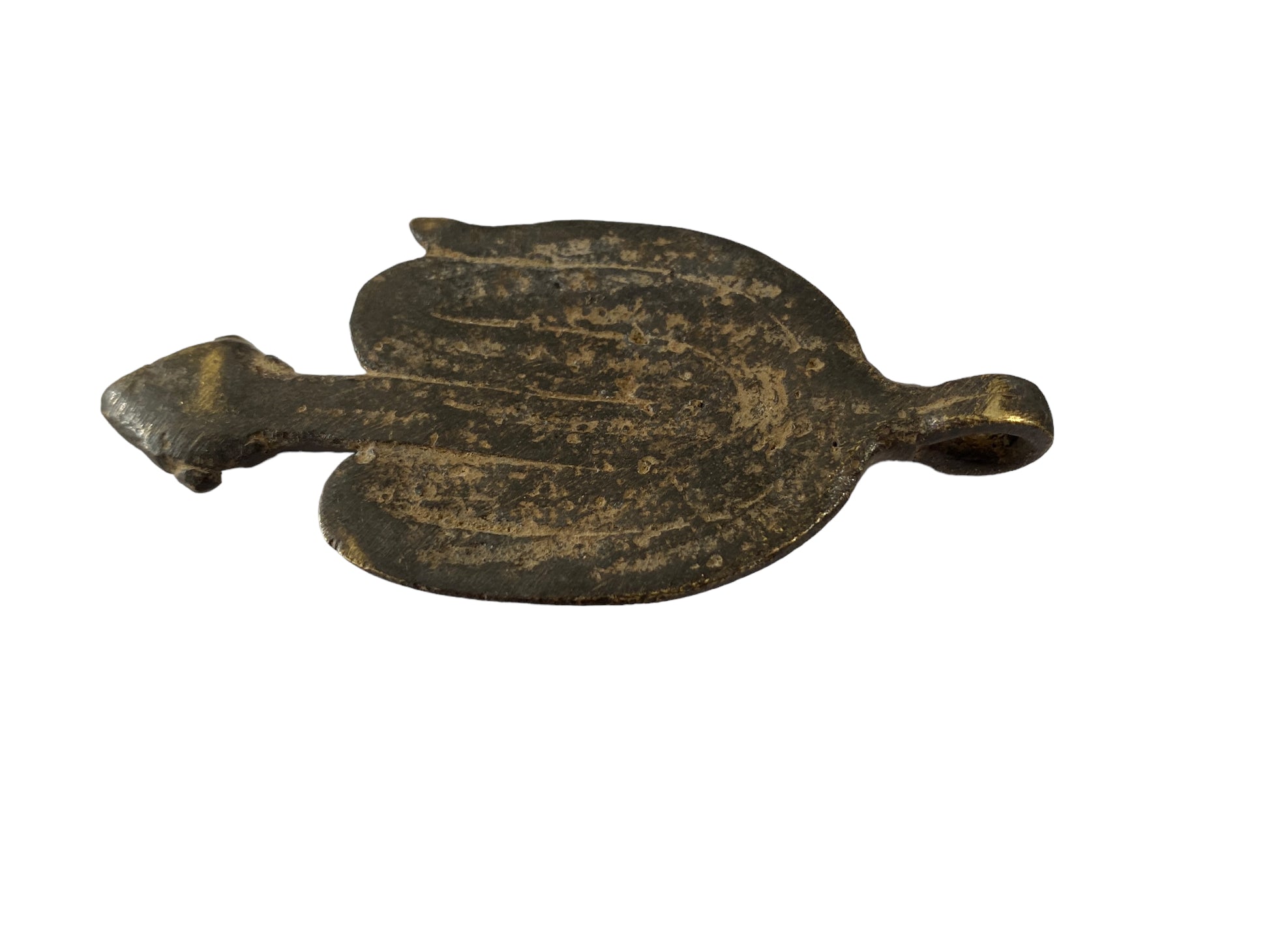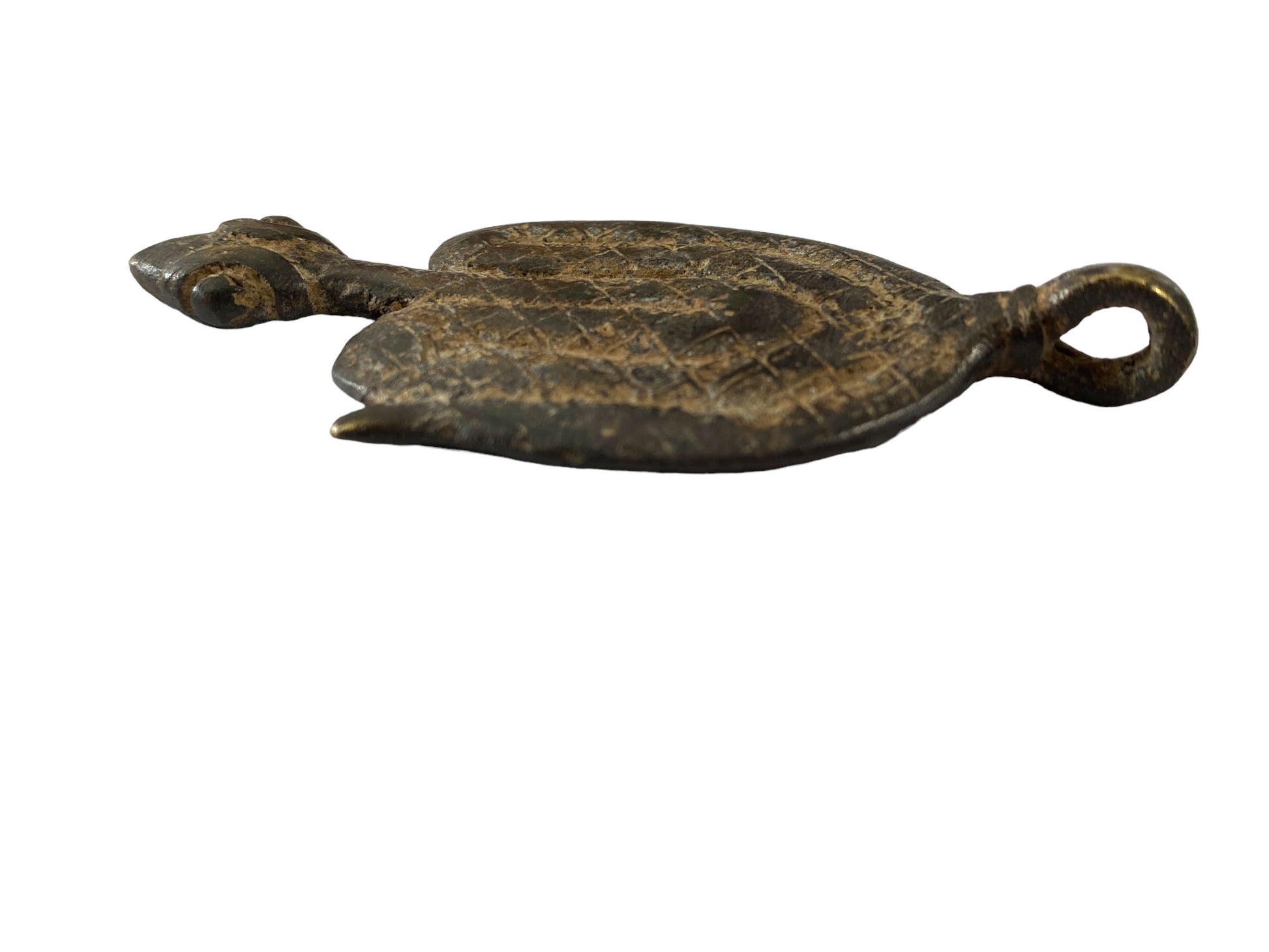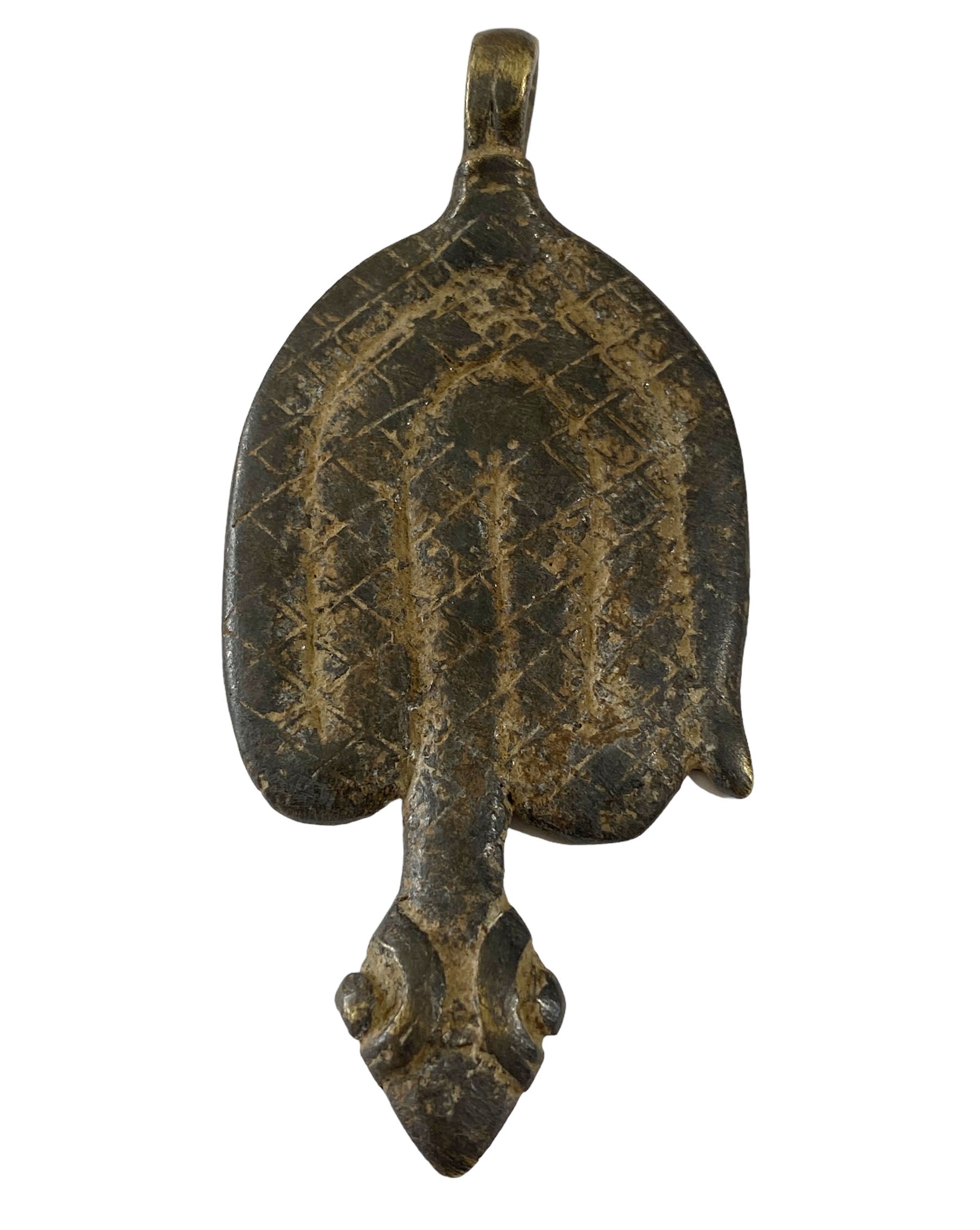 This Gan bronze amulet pendant showcases a serpent surrounded by an intricate pattern of circles. With the serpent's symbolic protective powers, it is a revered amulet amongst the Gan. The sophisticated lost wax method was employed during its casting, resulting in a one-of-a-kind piece sourced from Burkina Faso. Origin: Gan ethnic group - BURKINA FASO. Age: Late 20th century. Materials: Bronze. Condition: Good. Dimensions: 3" long by 1" 1/4 w.