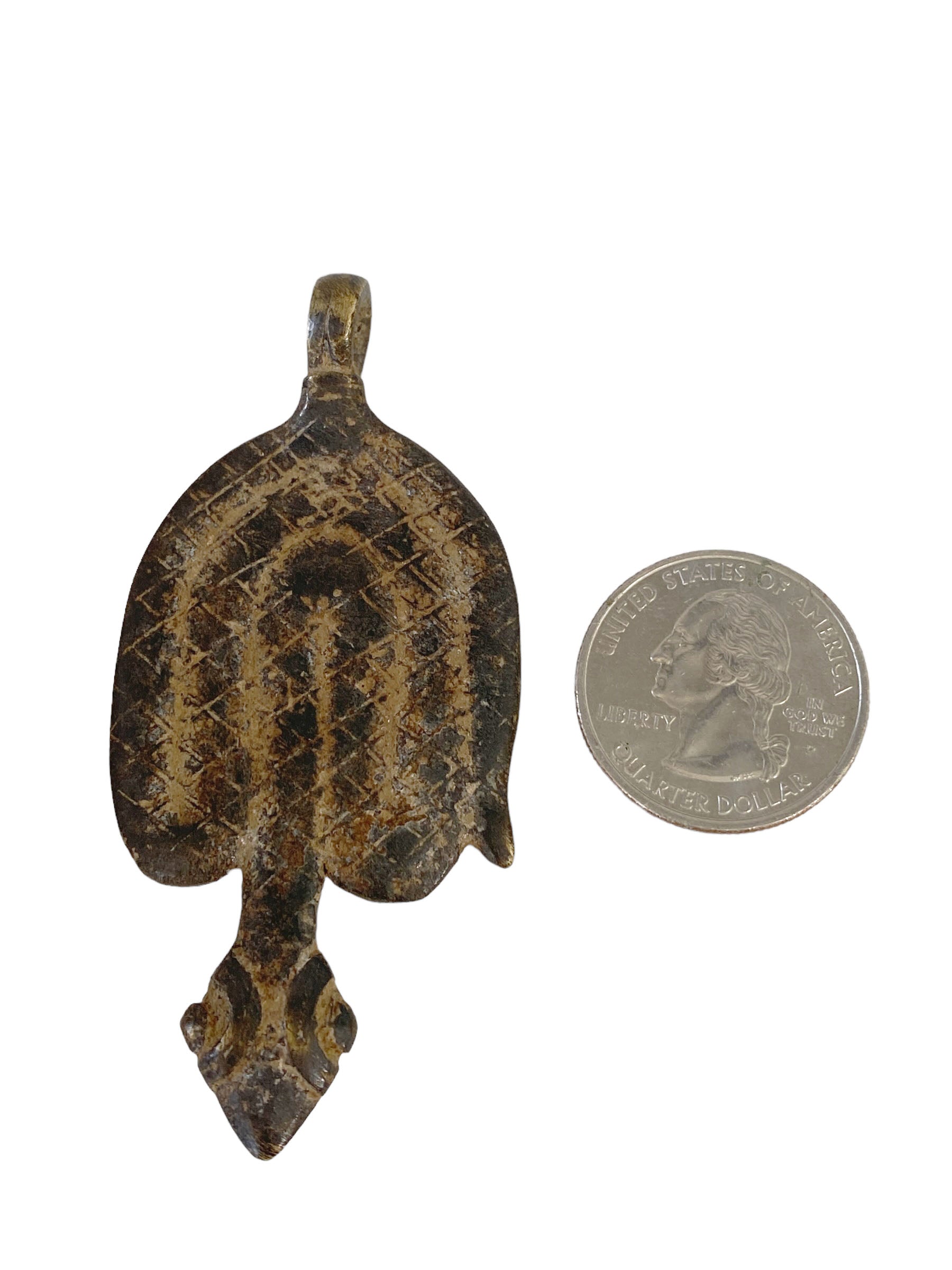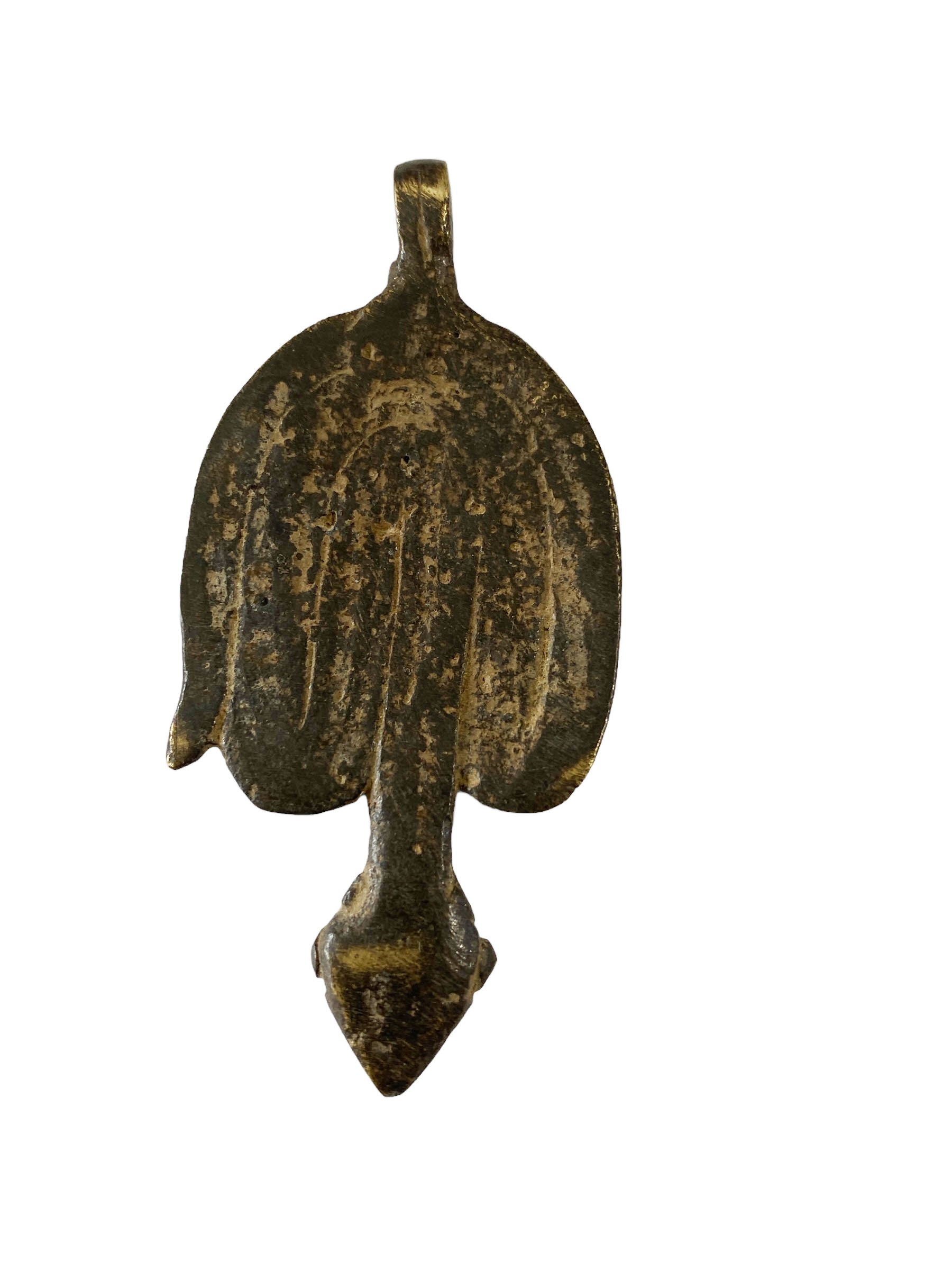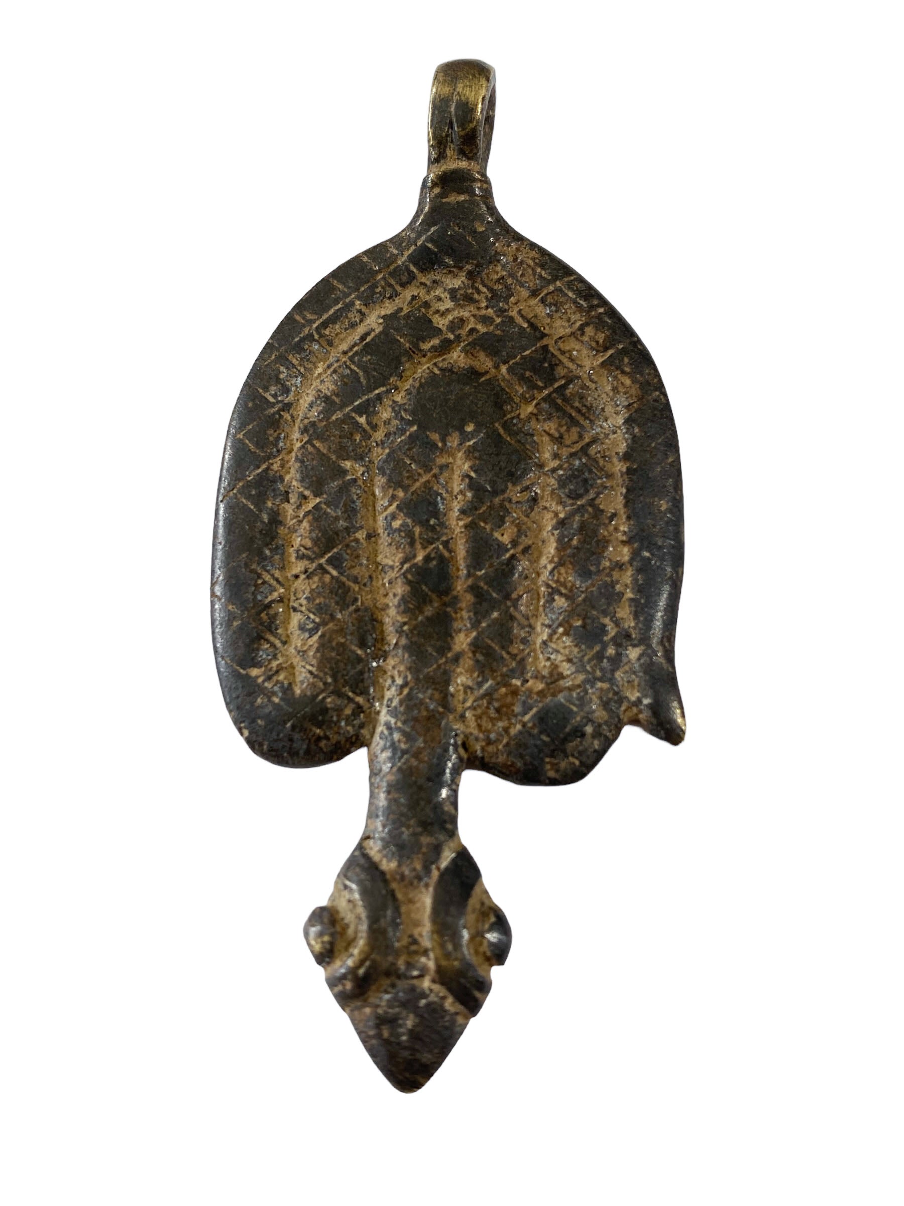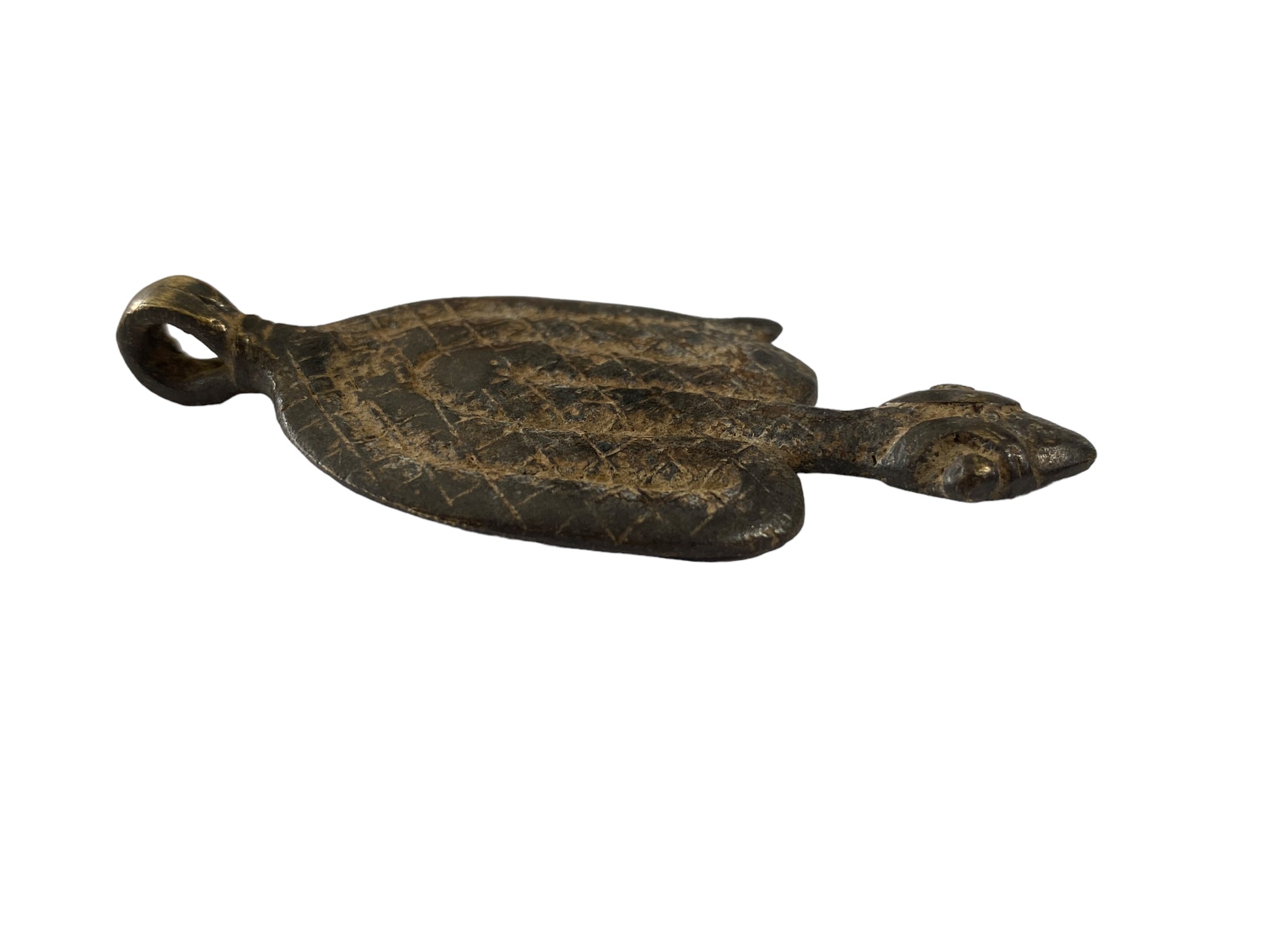 This Gan bronze amulet pendant showcases a serpent surrounded by an intricate pattern of circles. With the serpent's symbolic protective powers, it is a revered amulet amongst the Gan. The sophisticated lost wax method was employed during its casting, resulting in a one-of-a-kind piece sourced from Burkina Faso. Origin: Gan ethnic group - BURKINA FASO. Age: Late 20th century. Materials: Bronze. Condition: Good. Dimensions: 3" long by 1" 1/4 w.