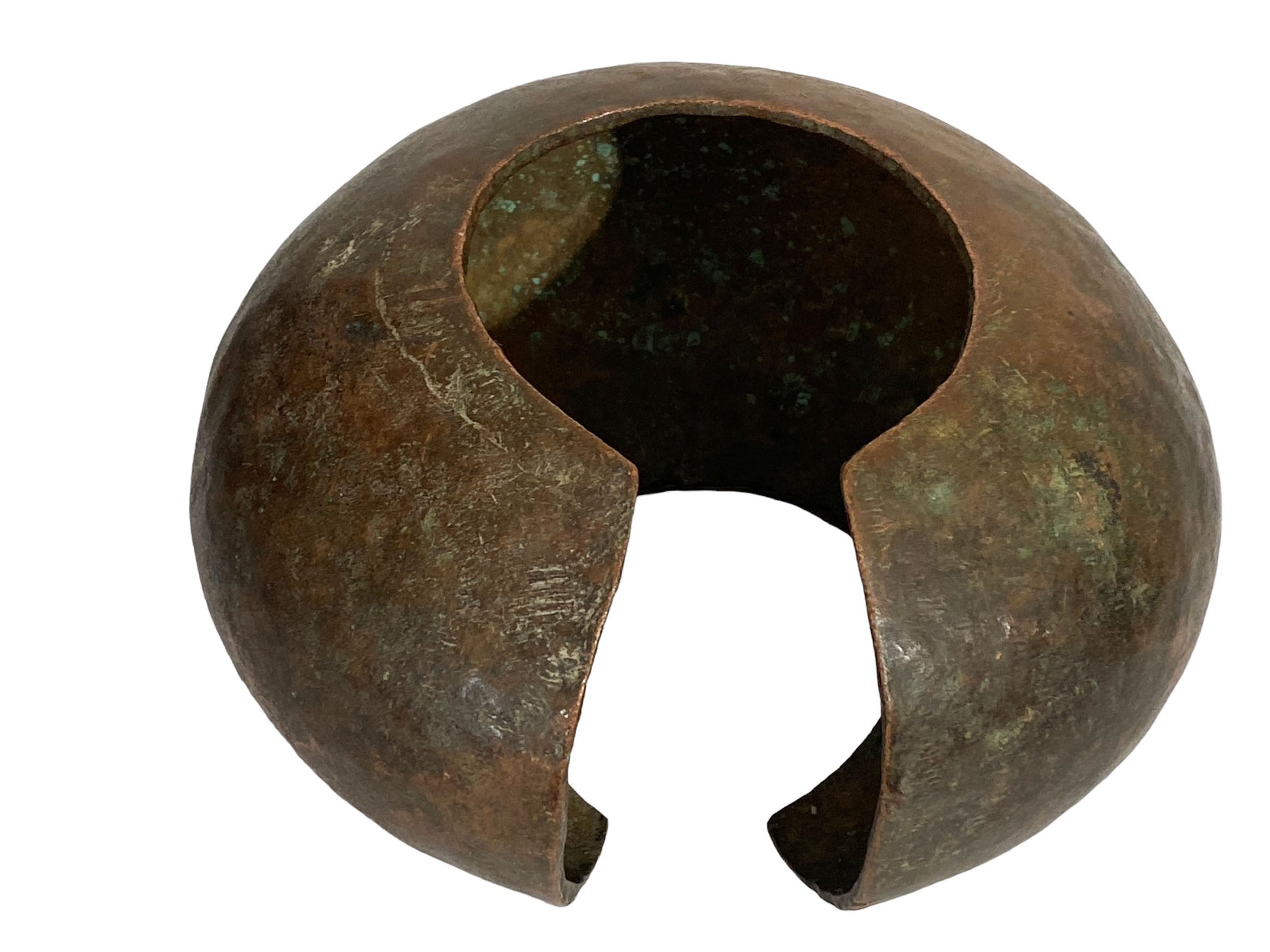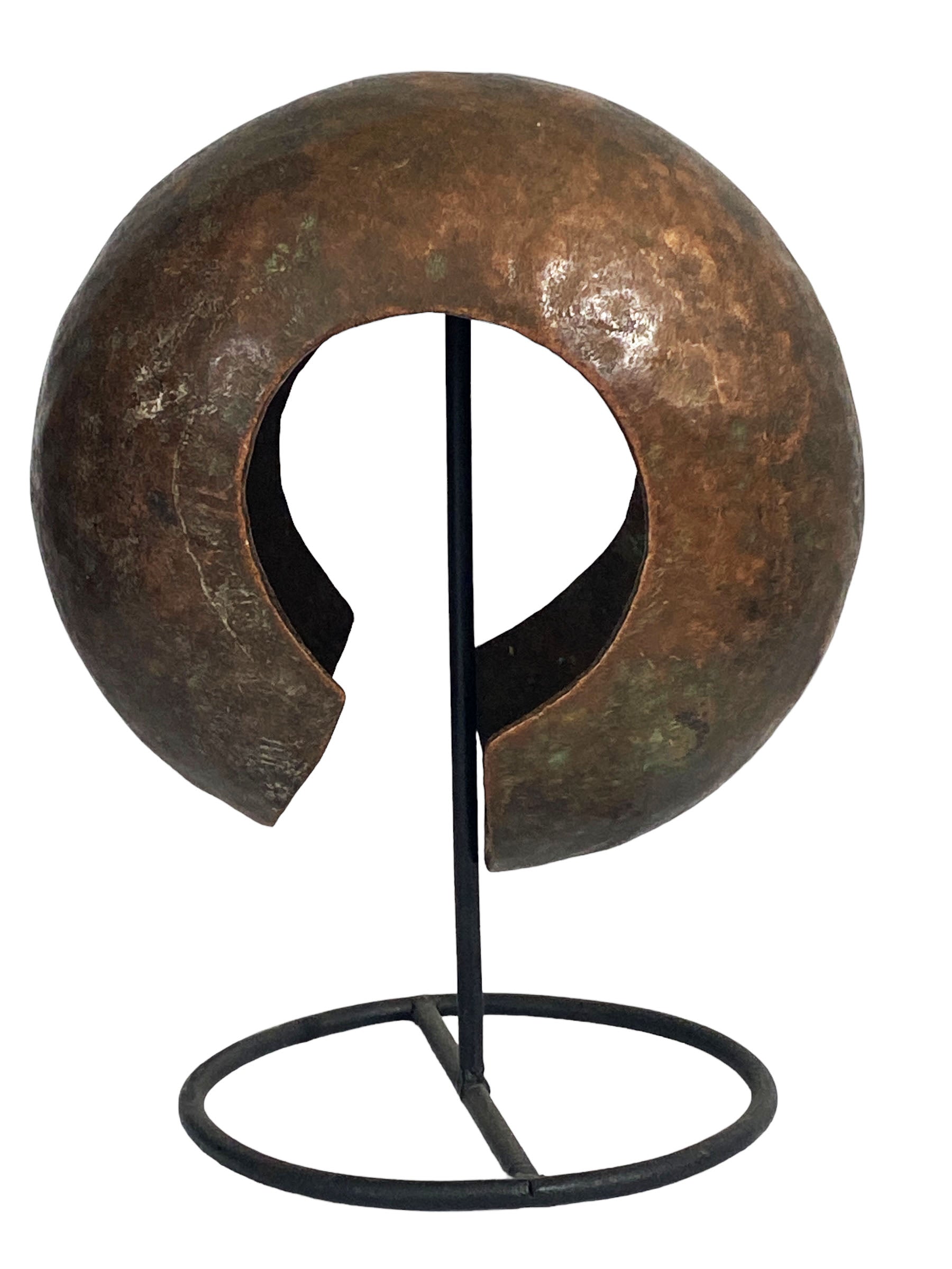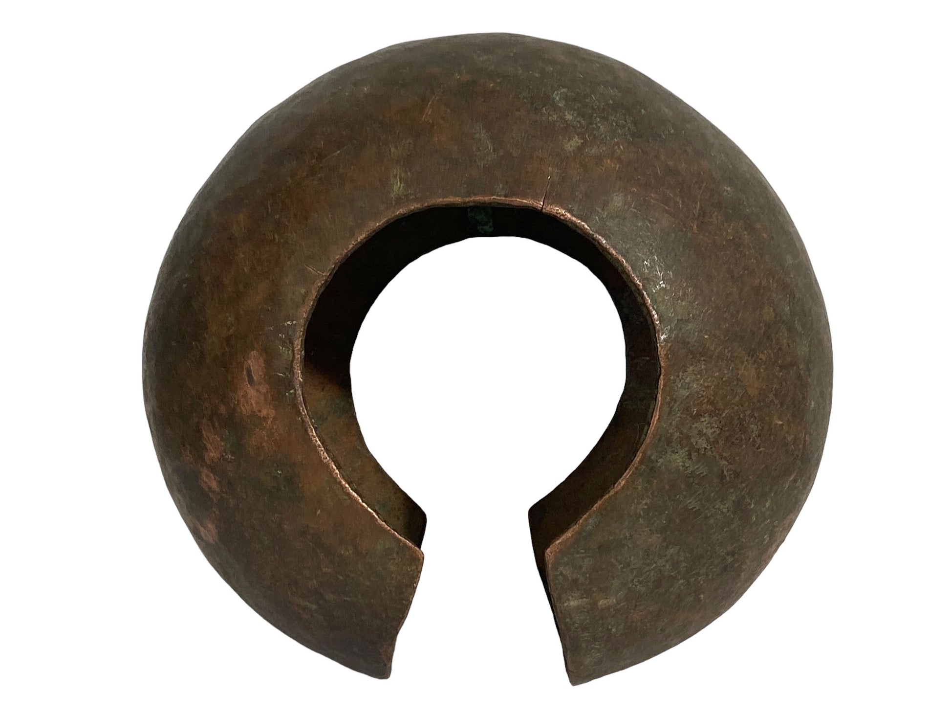 This superb Old Mbole Anklet Bracelet Trade Currency measures 8" W by 7.5" d by 4.5" H . It originates from the Southeastern Democratic Republic of the Congo, where the Mbole people use it to facilitate major trade transactions. The Mbole people have some of the largest jewelry forms in sub-Saharan Africa, traditionally worn by both men and women. The anklets come in two sizes, the larger called "Ehuke" and the smaller called "Diako," forged and hammered from a single ingot with one side featuring a cast opening.