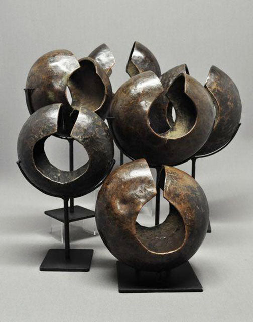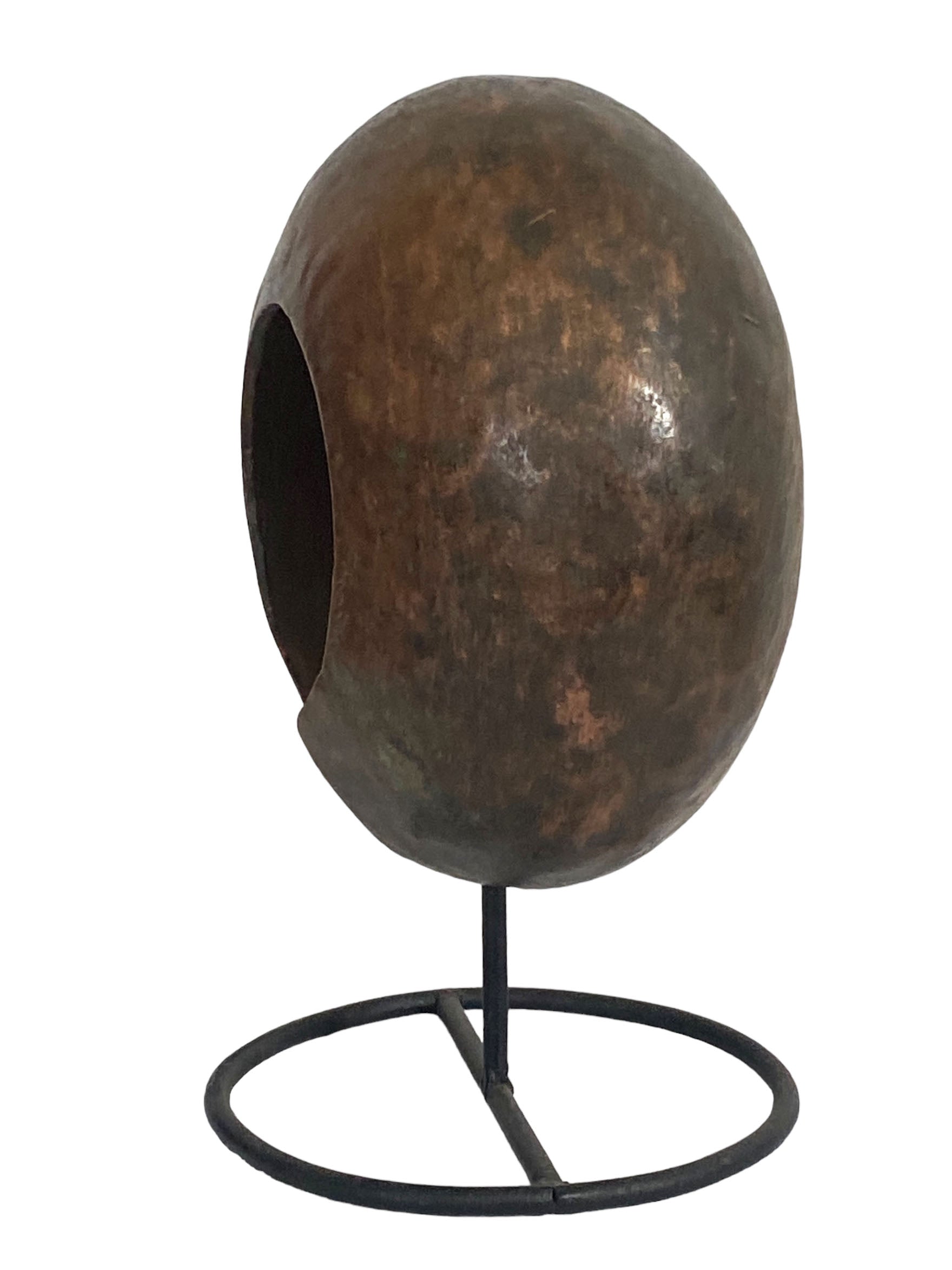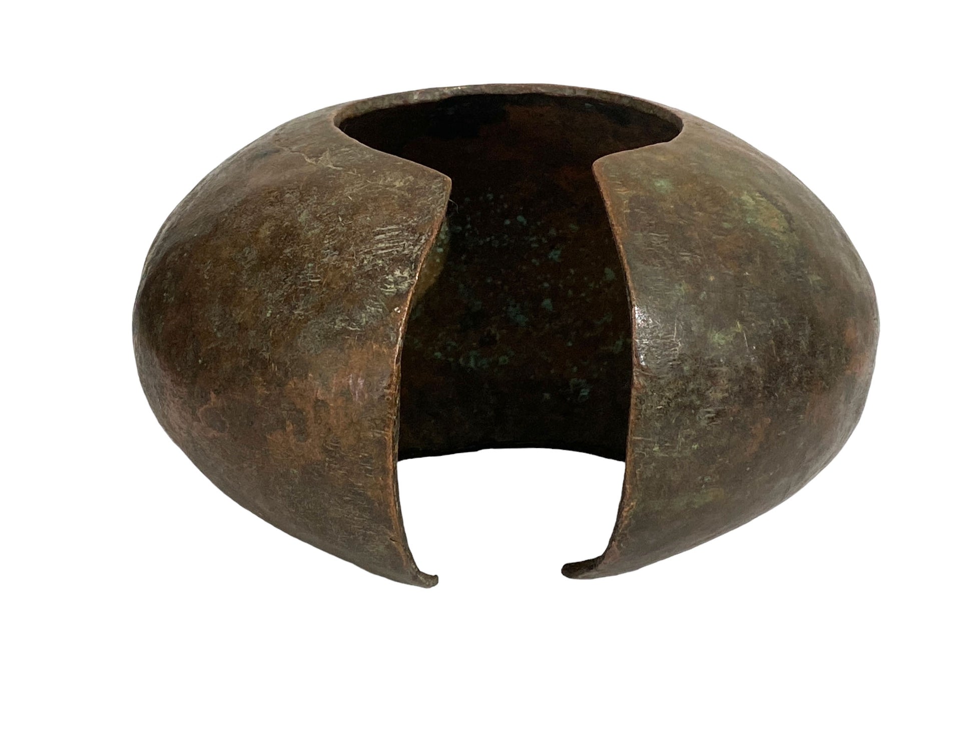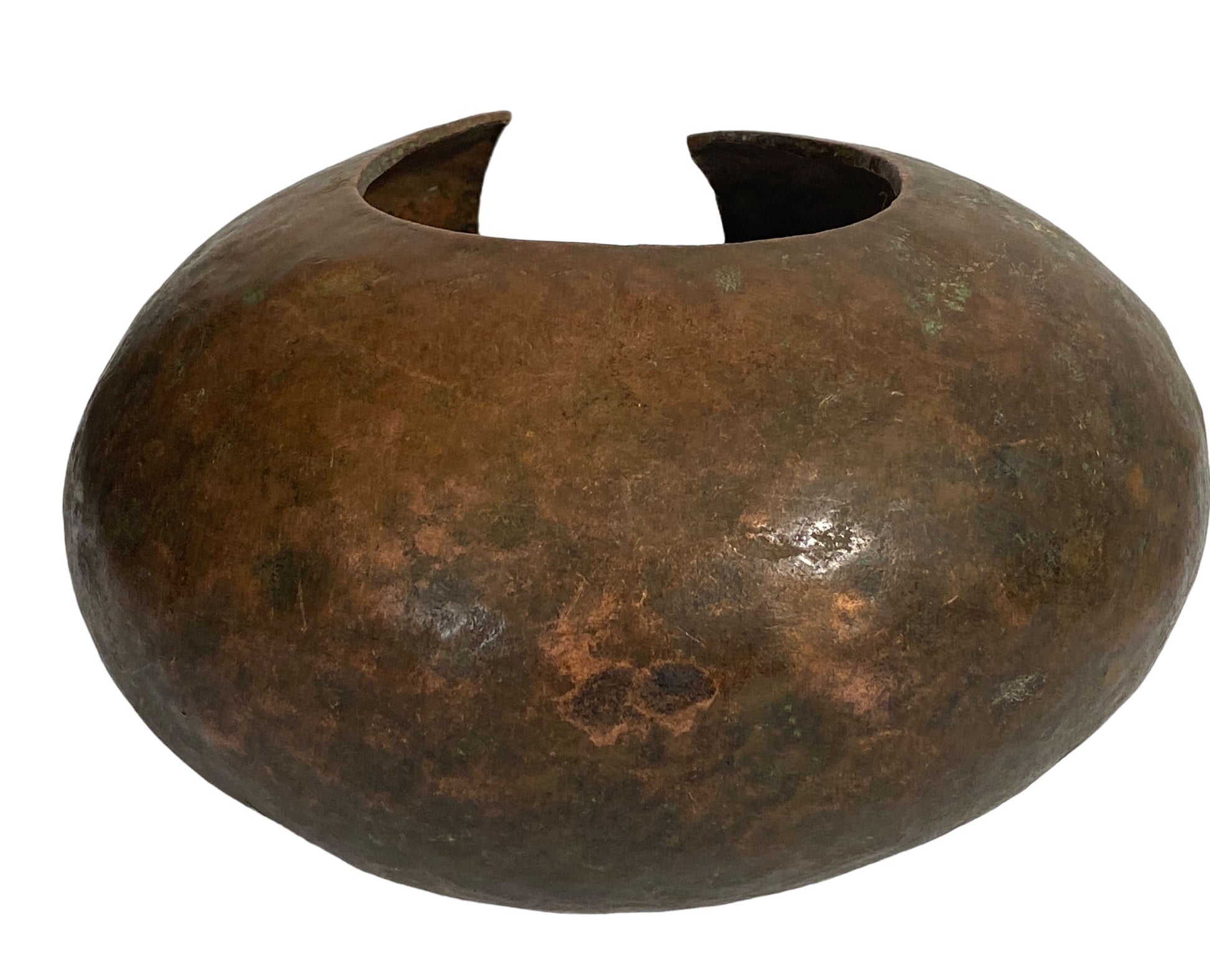 This superb Old Mbole Anklet Bracelet Trade Currency measures 8" W by 7.5" d by 4.5" H . It originates from the Southeastern Democratic Republic of the Congo, where the Mbole people use it to facilitate major trade transactions. The Mbole people have some of the largest jewelry forms in sub-Saharan Africa, traditionally worn by both men and women. The anklets come in two sizes, the larger called "Ehuke" and the smaller called "Diako," forged and hammered from a single ingot with one side featuring a cast opening.