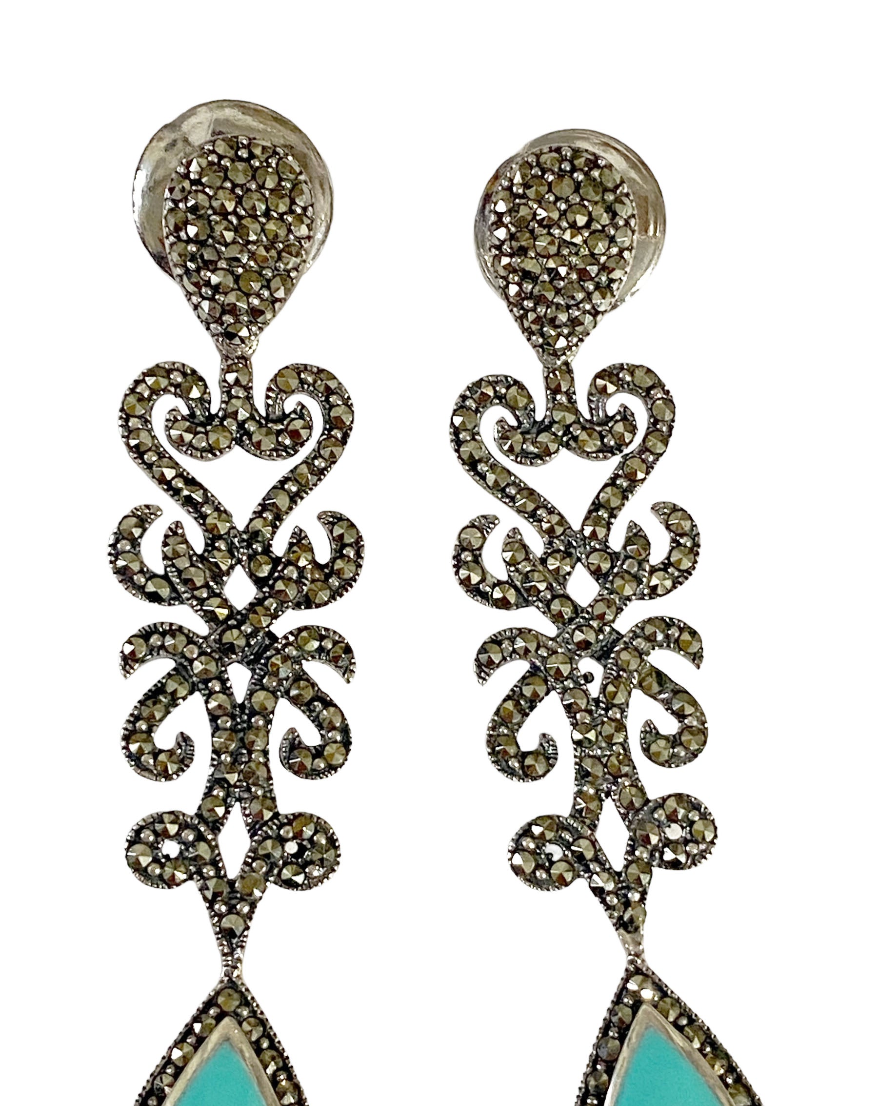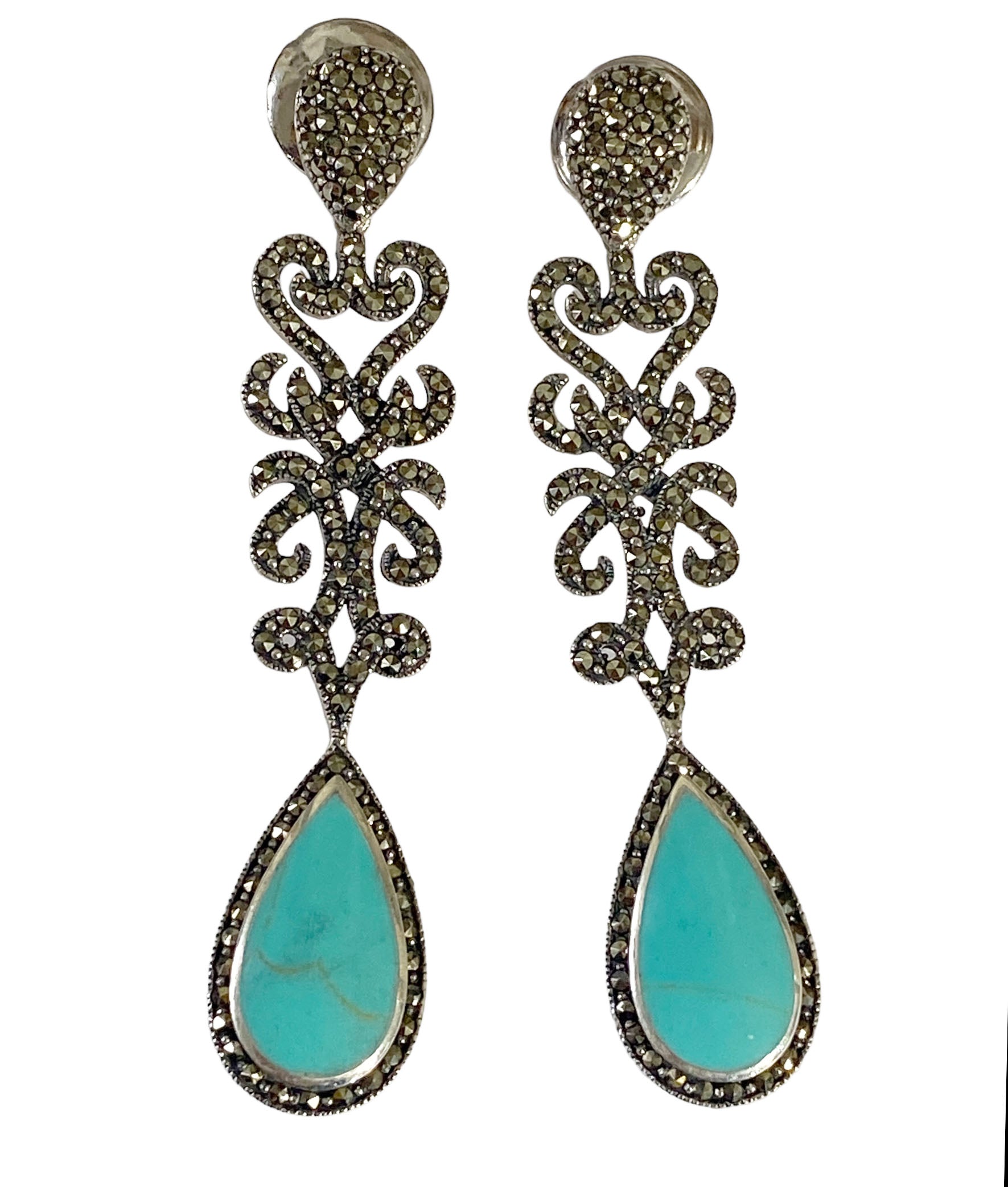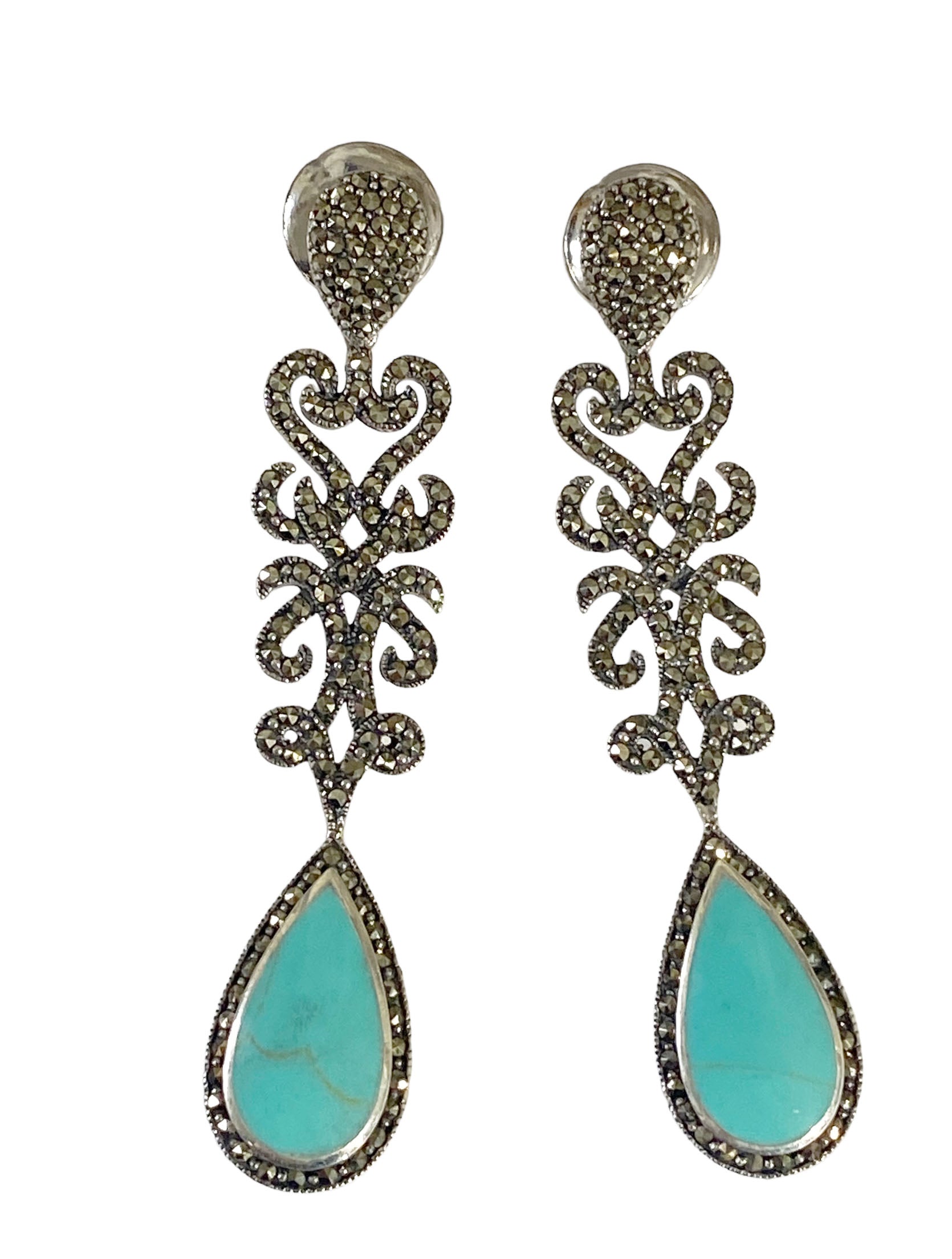 These Vintage Sterling Silver Stud Earrings feature Marcasite Stones set with a Turquoise Stone drop of approximately 2.75" long, 0.5" wide, and 0.75" deep. Exquisite design and timeless elegance make them truly beautiful.
