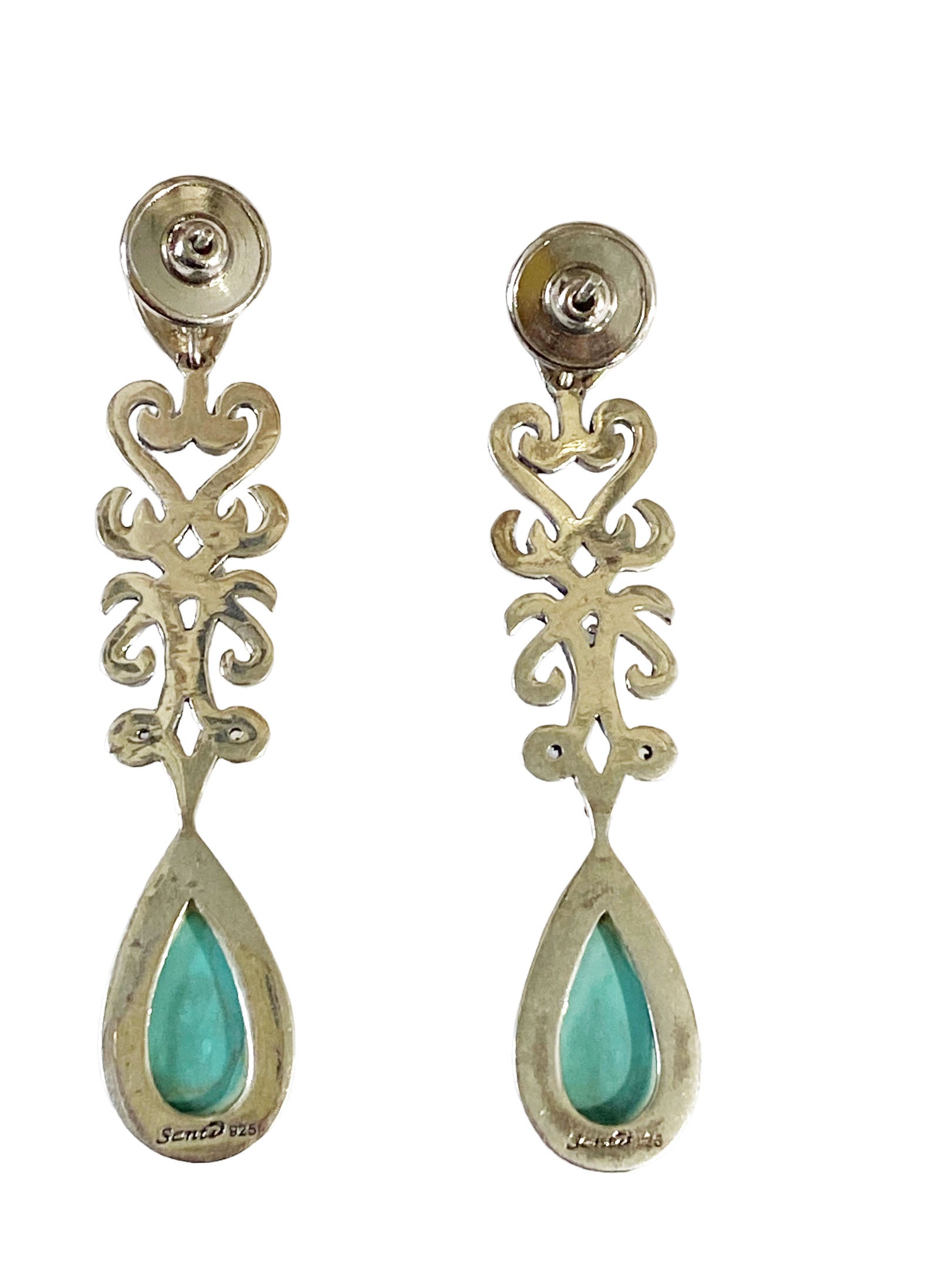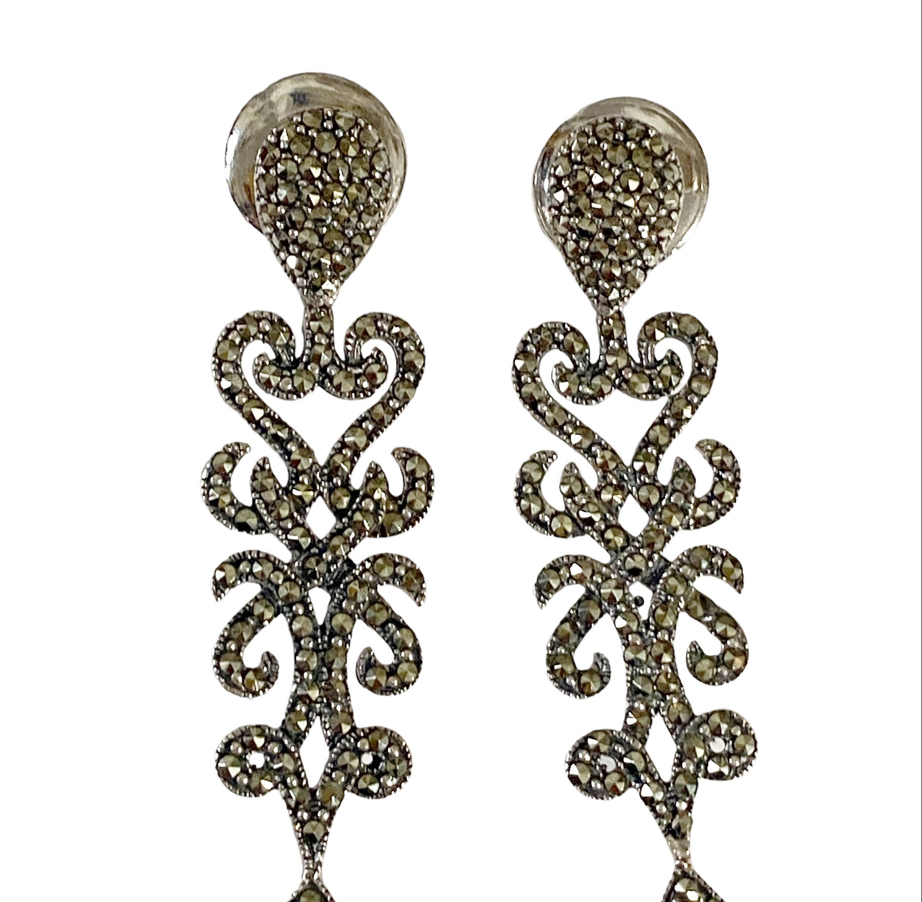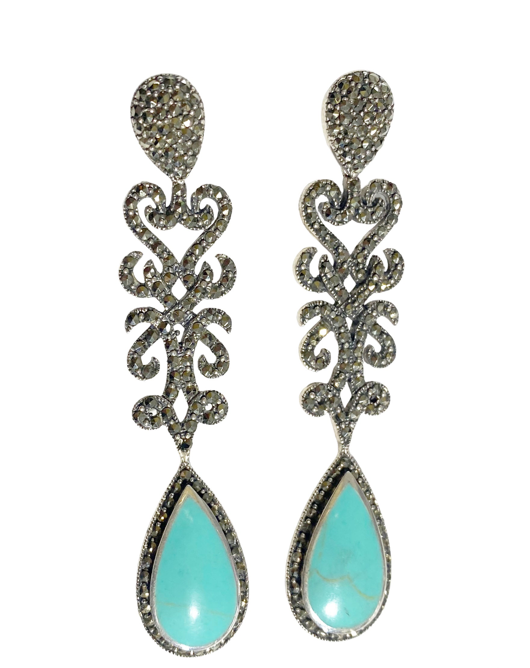 These Vintage Sterling Silver Stud Earrings feature Marcasite Stones set with a Turquoise Stone drop of approximately 2.75" long, 0.5" wide, and 0.75" deep. Exquisite design and timeless elegance make them truly beautiful.