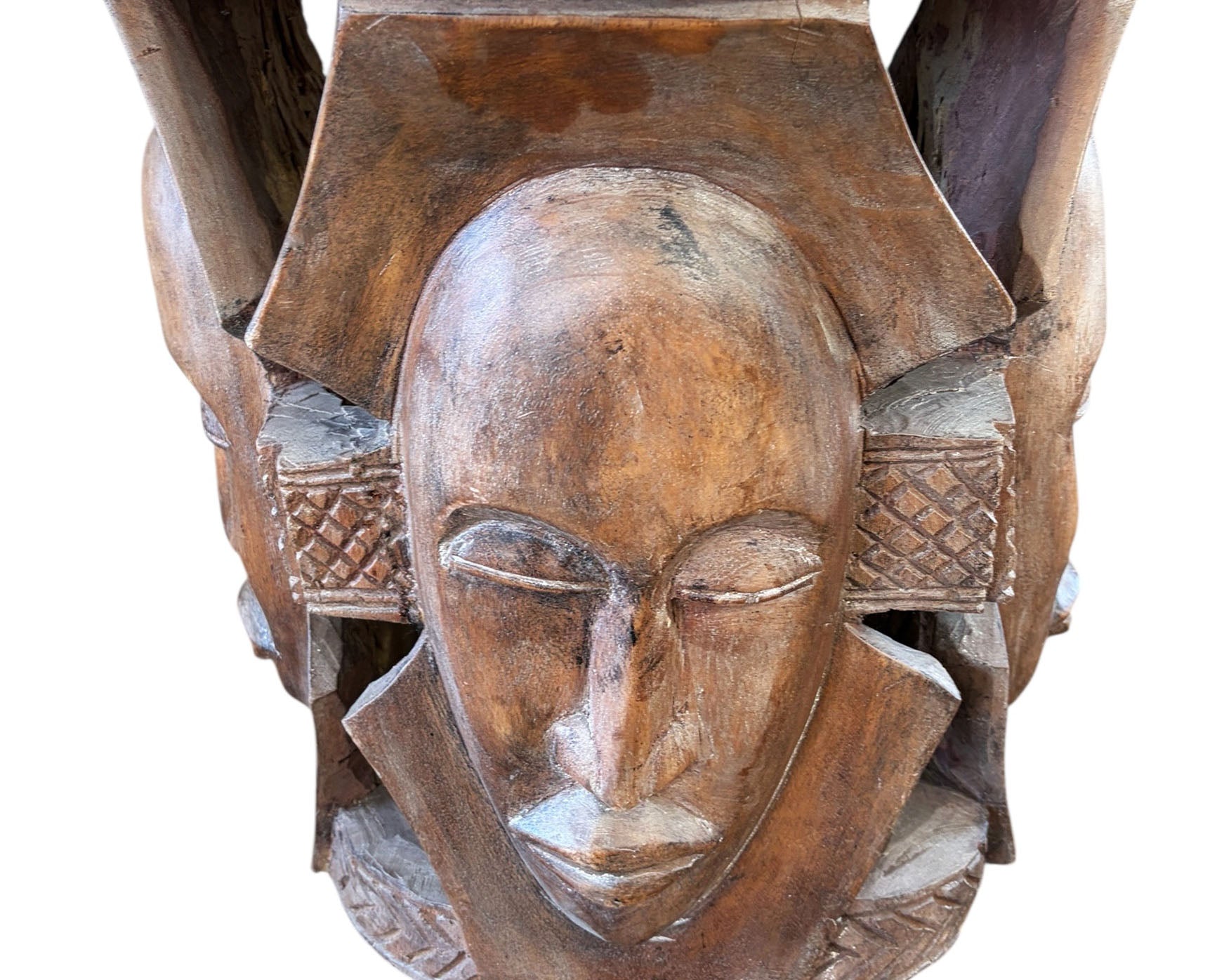 This exquisite piece is crafted from a single piece of dense wood. Whether used as a stool or table, its intricate faces, created by the highly skilled Baga people of Guinea-Bissau, add a touch of elegance and cultural significance to any space. Stools may be a small part of Baga art, but alongside their renowned masks and serpentine figures, they are a striking representation of African craftsmanship. Despite minor hairlines resulting from the passage of time and use , this item remains in overall excellent condition. Measuring 19" in height and 18" in diameter, it is a must-have addition to any distinguished collection.