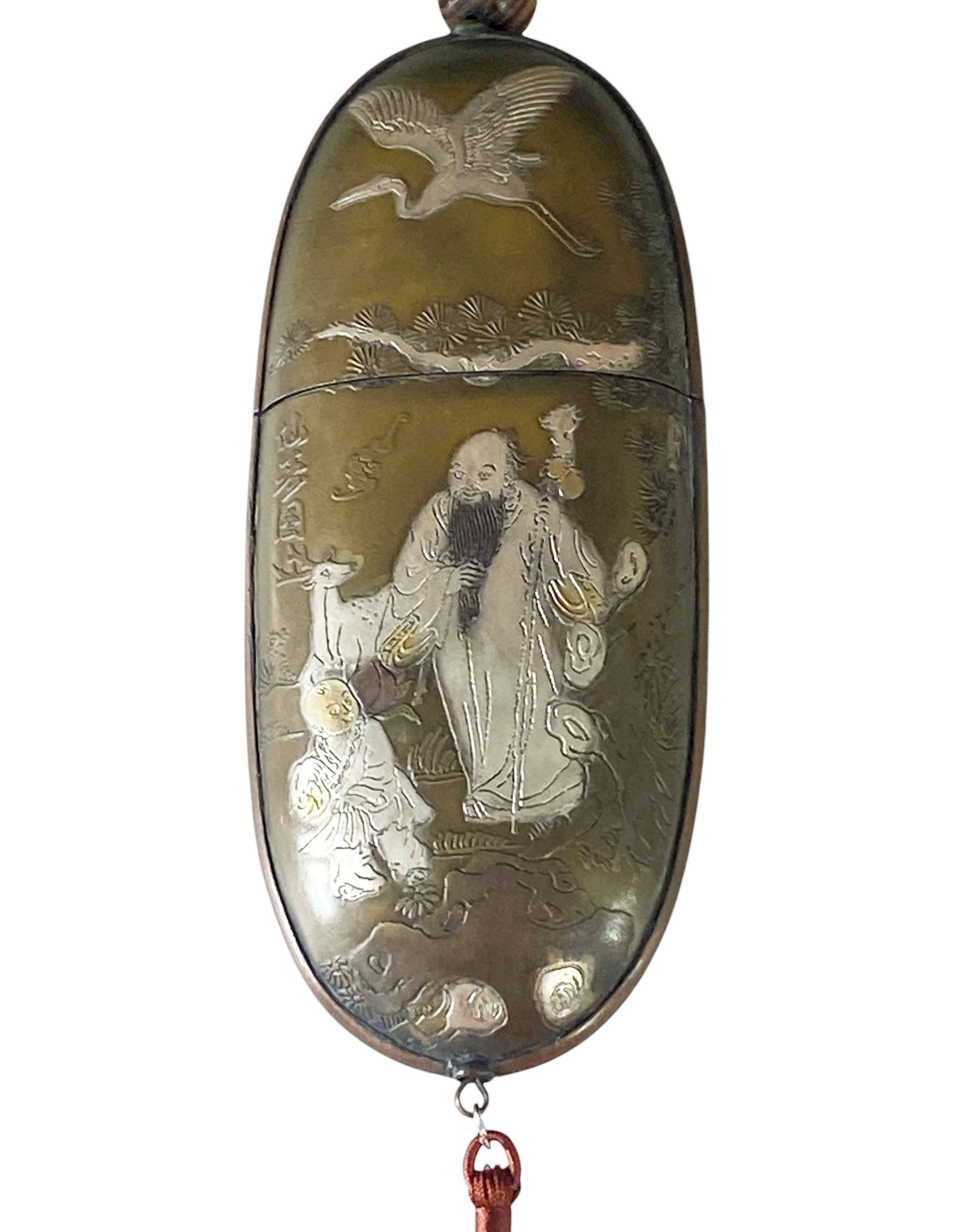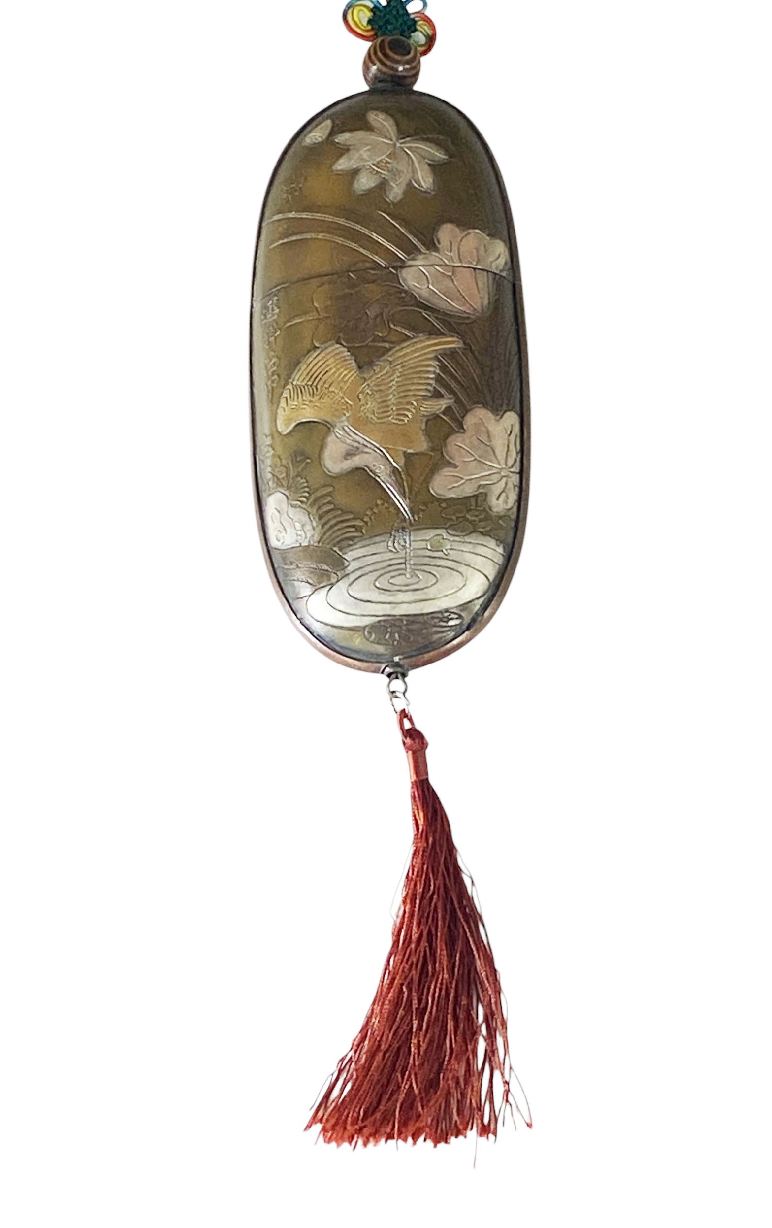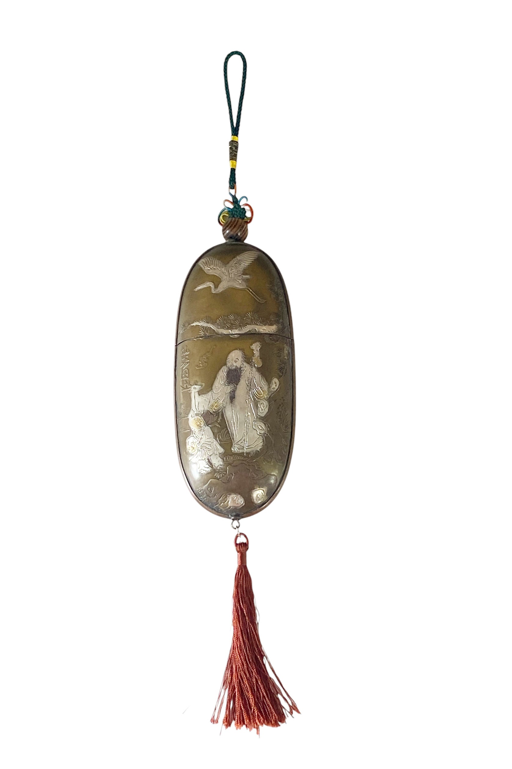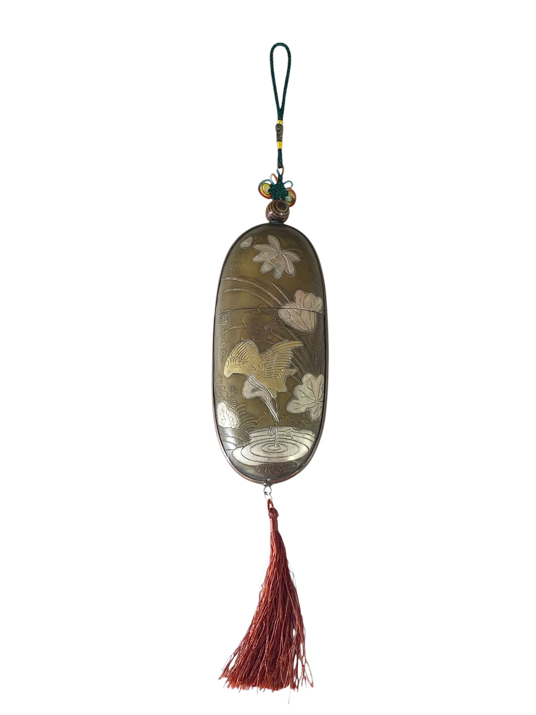 This remarkable vintage Chinese copper glasses case highlights exceptional craftsmanship. It features detailed silver and gold engravings—illustrating figures on one side and a crane with water lilies on the other—along with a silk red pompon and endless knot hanger, all in excellent condition. Chinese characters are inscribed on each side. Measuring 6 inches high for the case and 14.5 inches in total, with dimensions of 2.5 inches wide by 1 inch deep, this piece is ideal for collectors of Asian antiques .