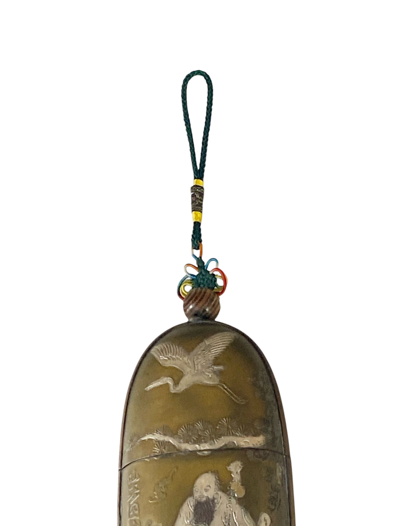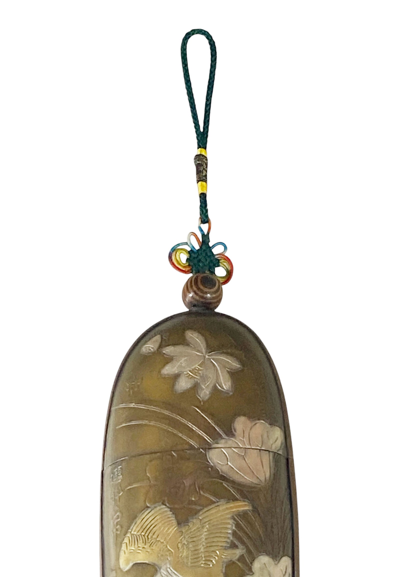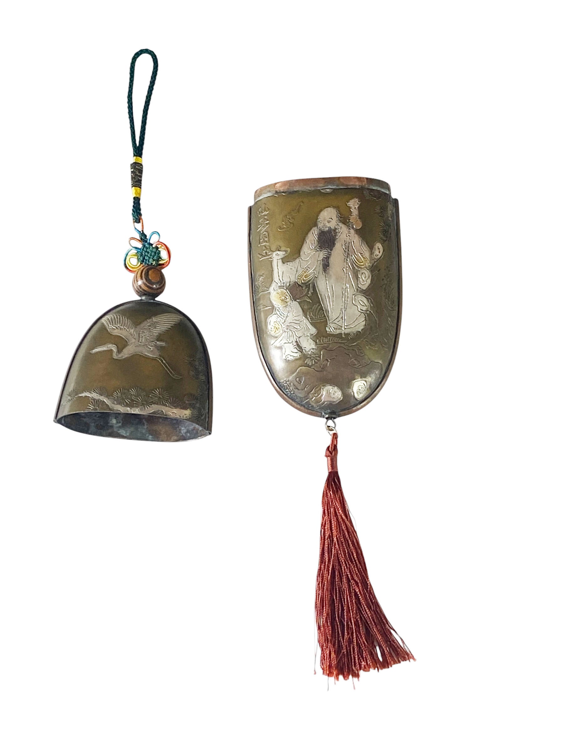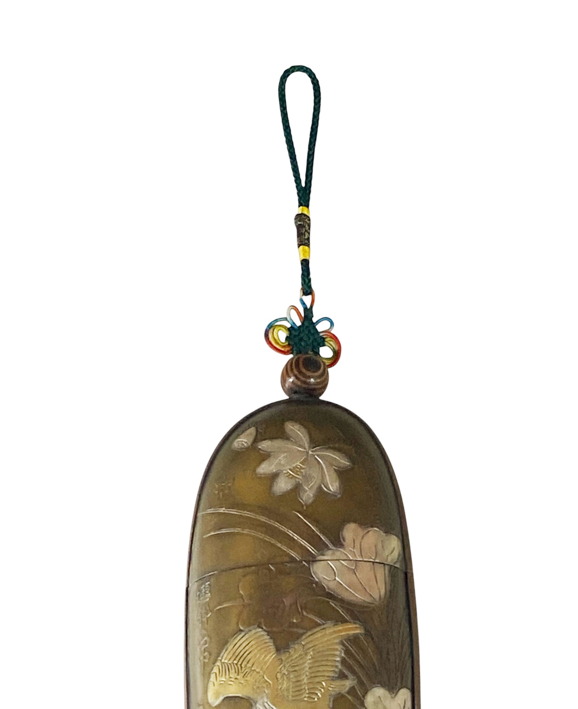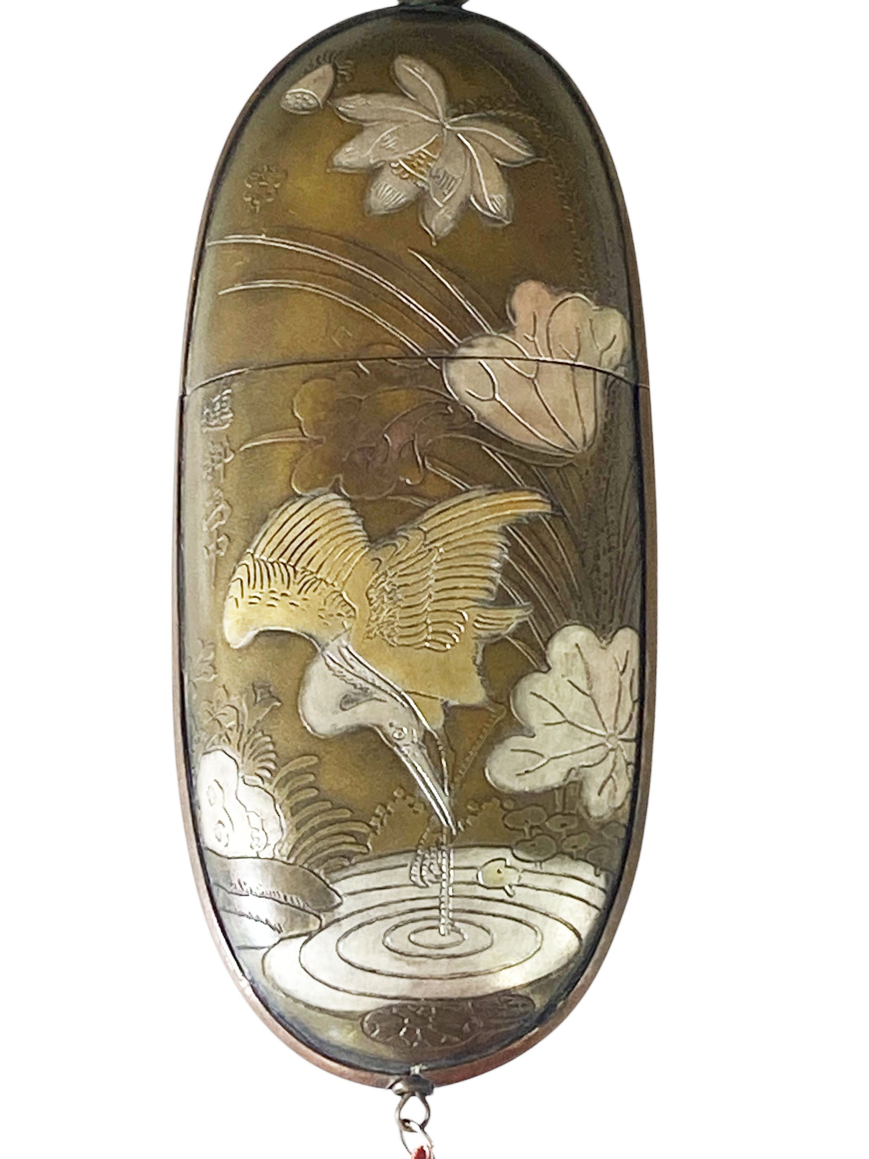 This remarkable vintage Chinese copper glasses case highlights exceptional craftsmanship. It features detailed silver and gold engravings—illustrating figures on one side and a crane with water lilies on the other—along with a silk red pompon and endless knot hanger, all in excellent condition. Chinese characters are inscribed on each side. Measuring 6 inches high for the case and 14.5 inches in total, with dimensions of 2.5 inches wide by 1 inch deep, this piece is ideal for collectors of Asian antiques .