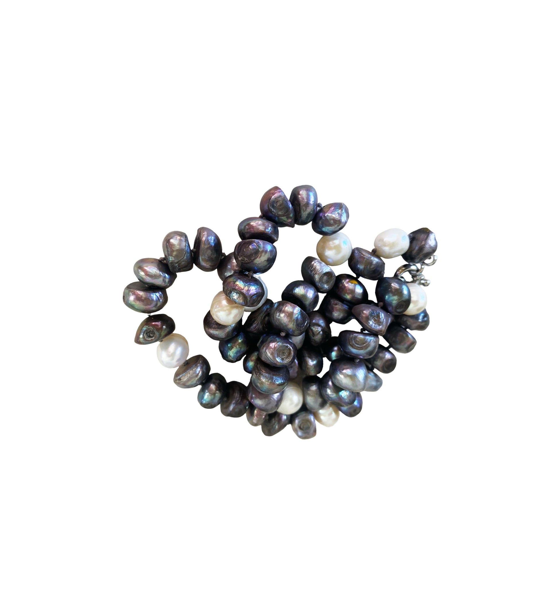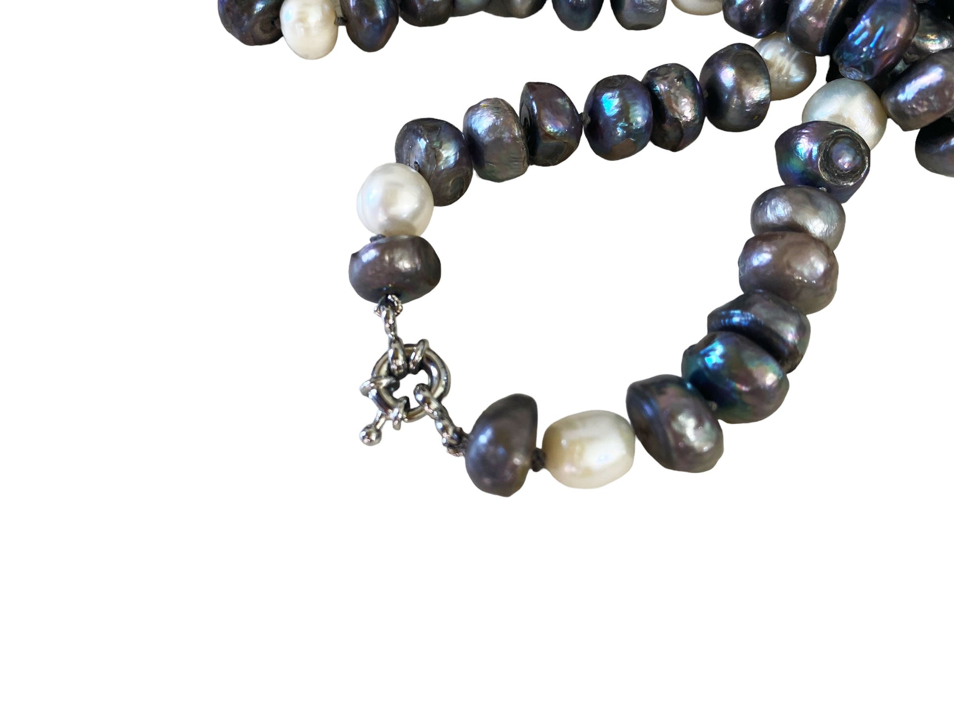 Superb multi-tones baroque of dark peacock blue, bluey grey and grey, and they shimmer beautifully in the light with irridescent tones of purples, peacock teals and blues! and white pearls Sizes ranging from 8mm to 11mm, these pearls are well-known for their whimsical shapes and wide variety of colors. The necklace measures 19.5" in length when open, and each pearl tends to be slightly larger and irregular in shape ,with a metallic clasp