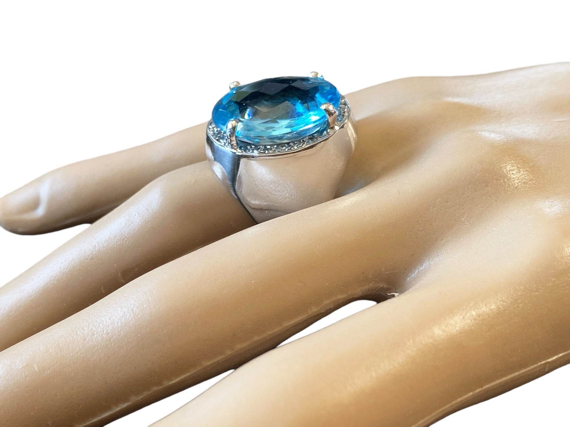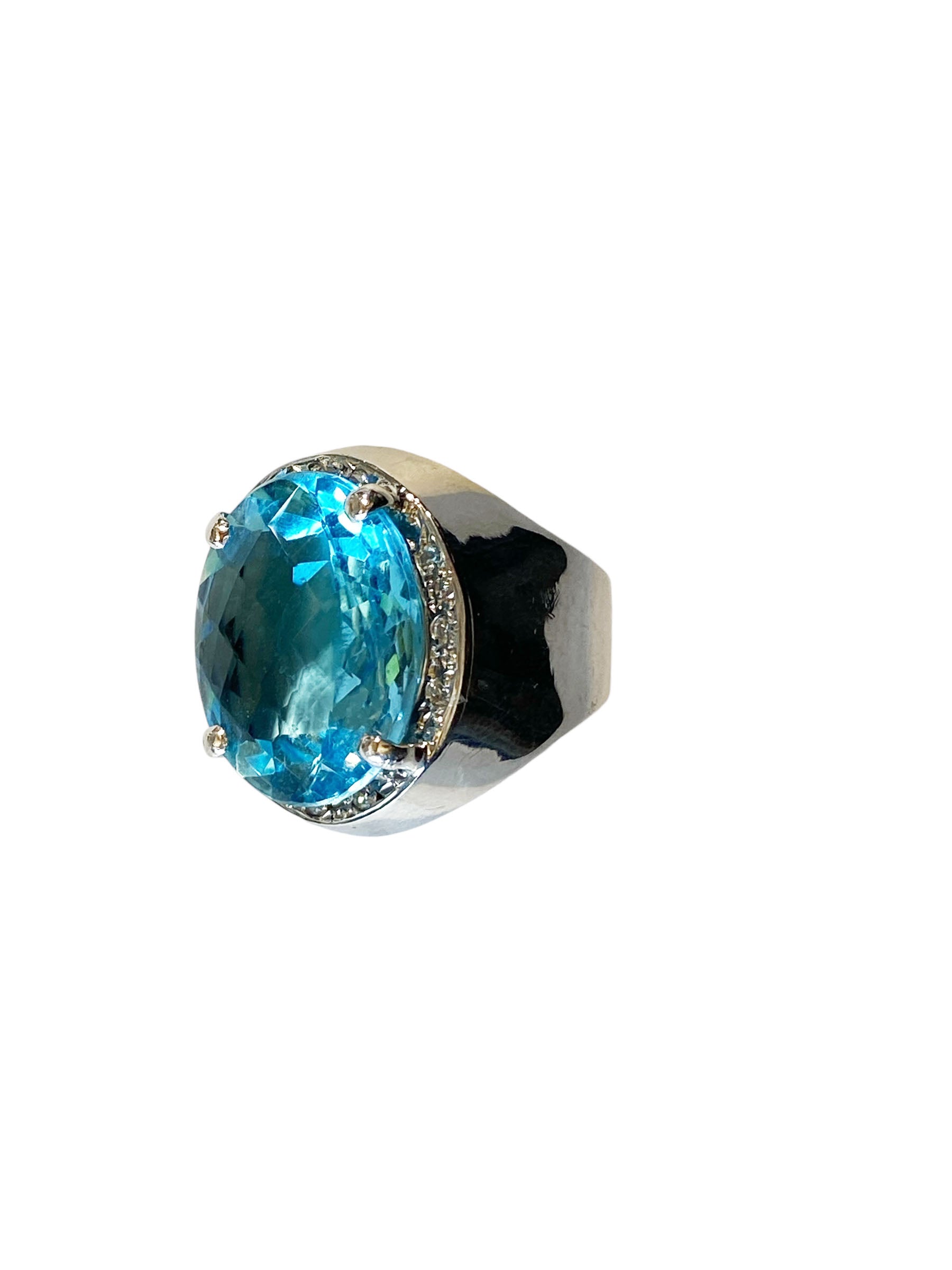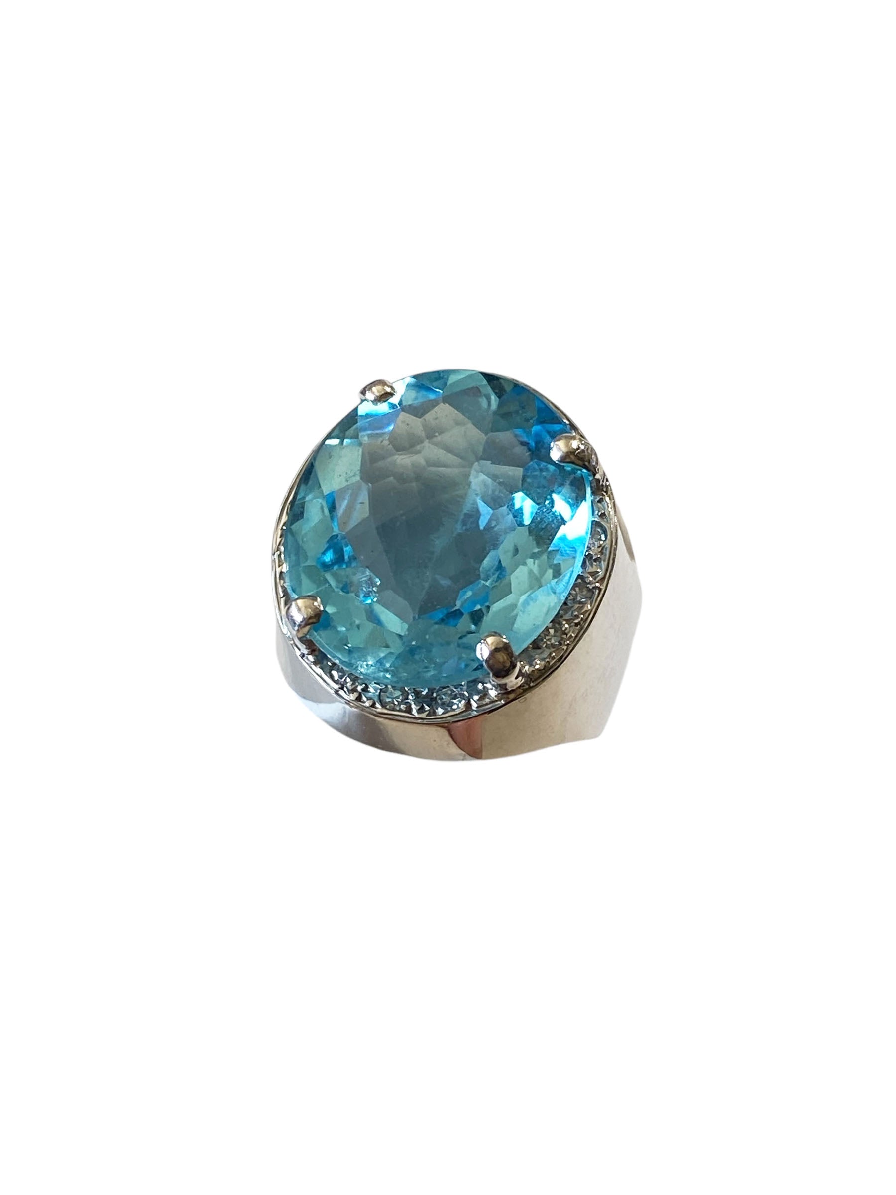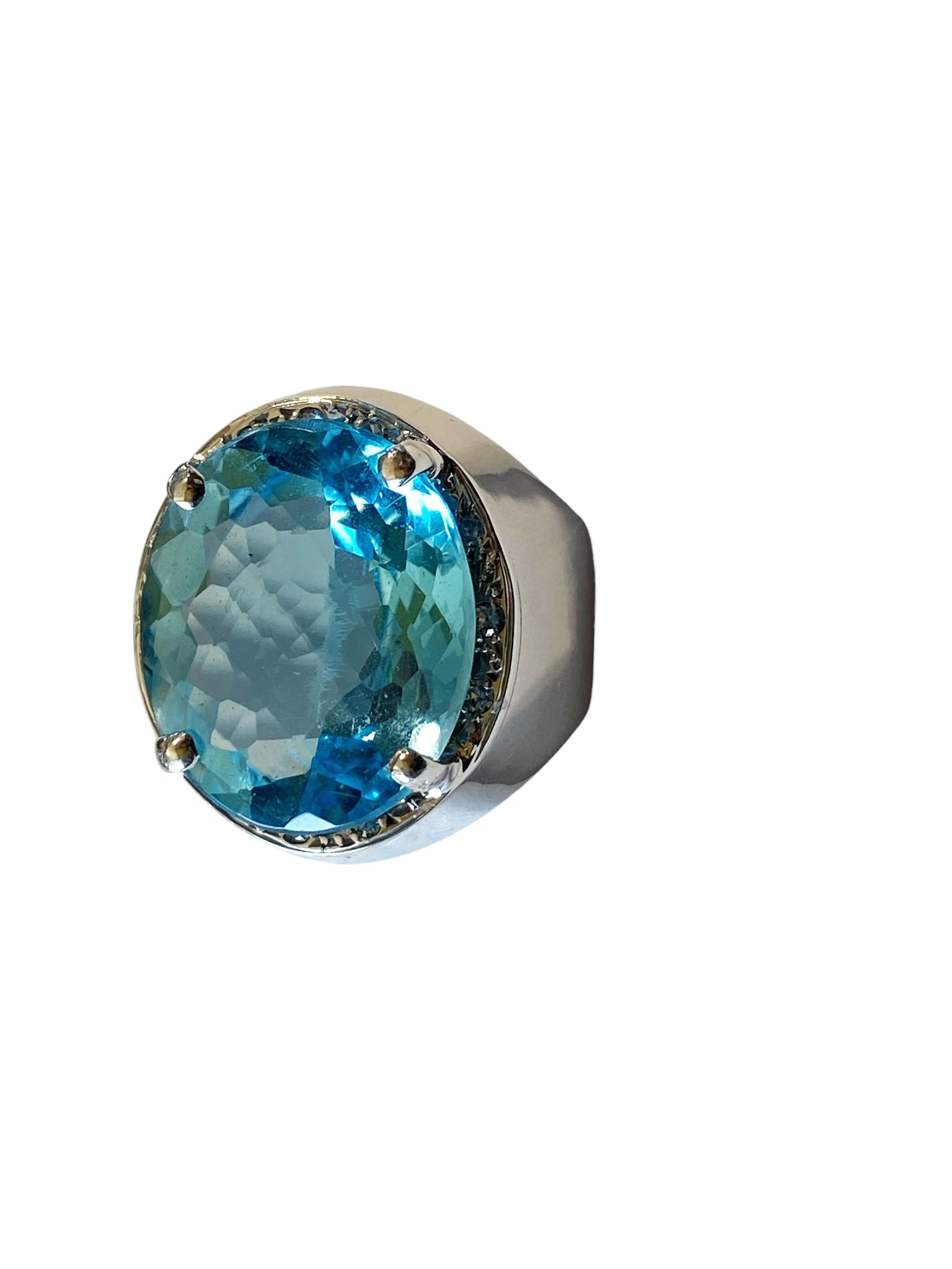 Superb and elegant ladies Blue Topaz and Diamond ring, with 18 k white gold mounting with 14.5 to 5.5 flared mm shanking center 4 prong set with oval checkerboard cut Swiss blue topaz with 18 k 19.5 by 17 by 8.1 mm accented with 12 bead set 1.4 mm o1 point single cut diamonds ,shank pave set with 36 full cut 1.7 mm 01 point diamonds H / SI ,gold weight 10.6 dot /16.48 grams finger size 9