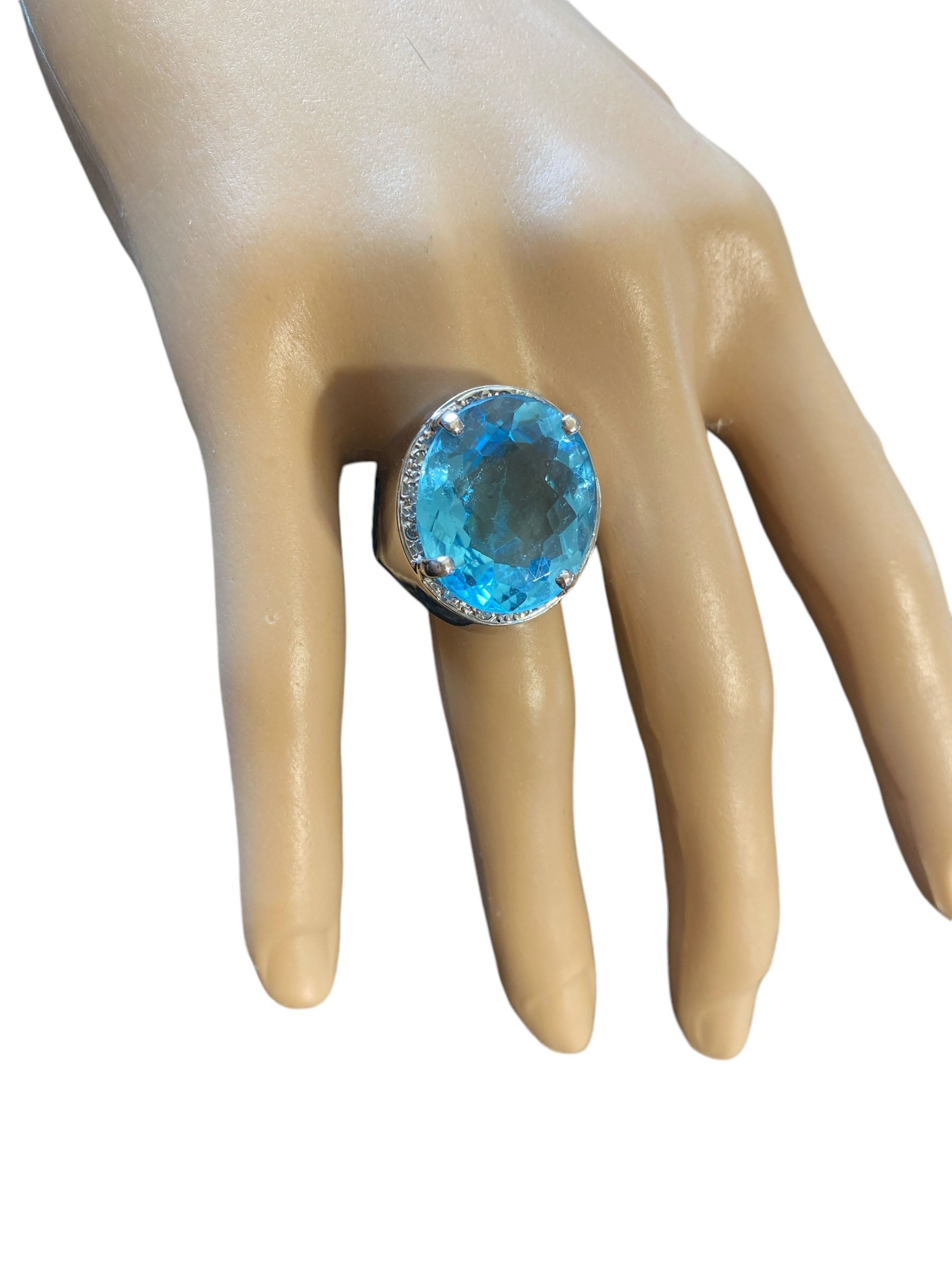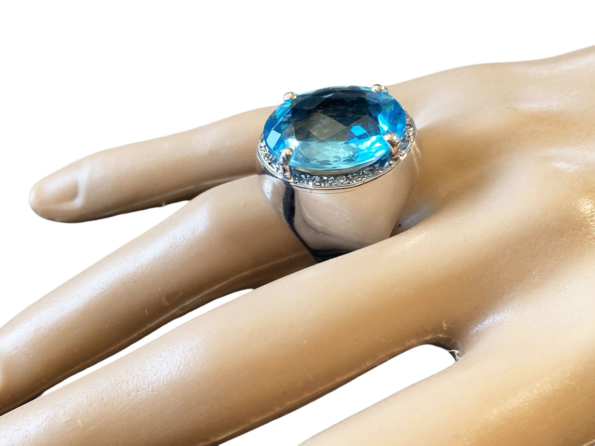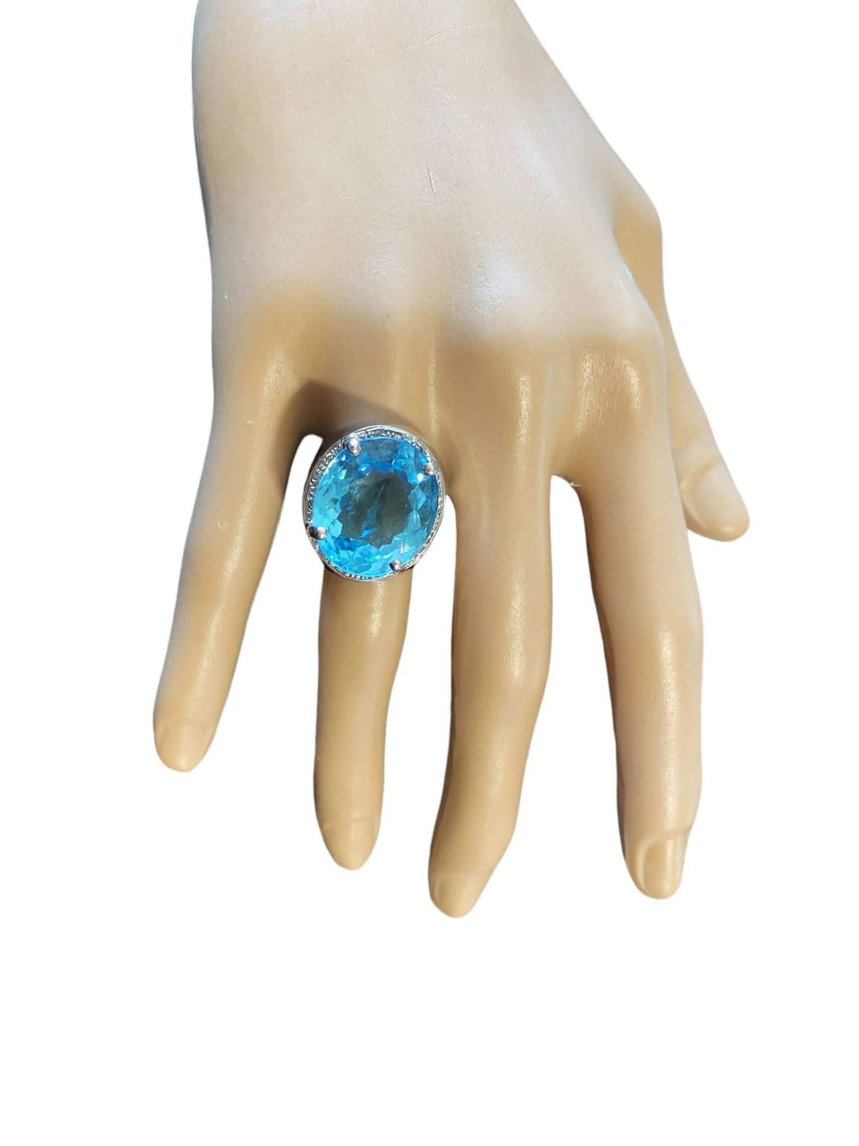 Superb and elegant ladies Blue Topaz and Diamond ring, with 18 k white gold mounting with 14.5 to 5.5 flared mm shanking center 4 prong set with oval checkerboard cut Swiss blue topaz with 18 k 19.5 by 17 by 8.1 mm accented with 12 bead set 1.4 mm o1 point single cut diamonds ,shank pave set with 36 full cut 1.7 mm 01 point diamonds H / SI ,gold weight 10.6 dot /16.48 grams finger size 9