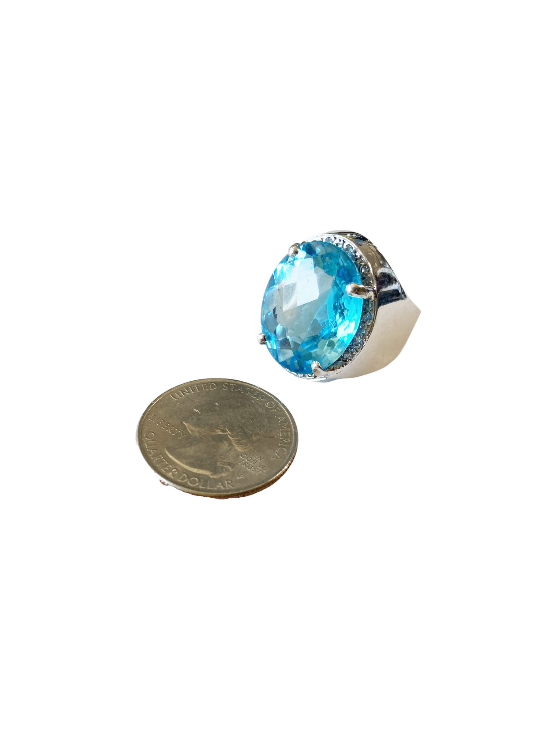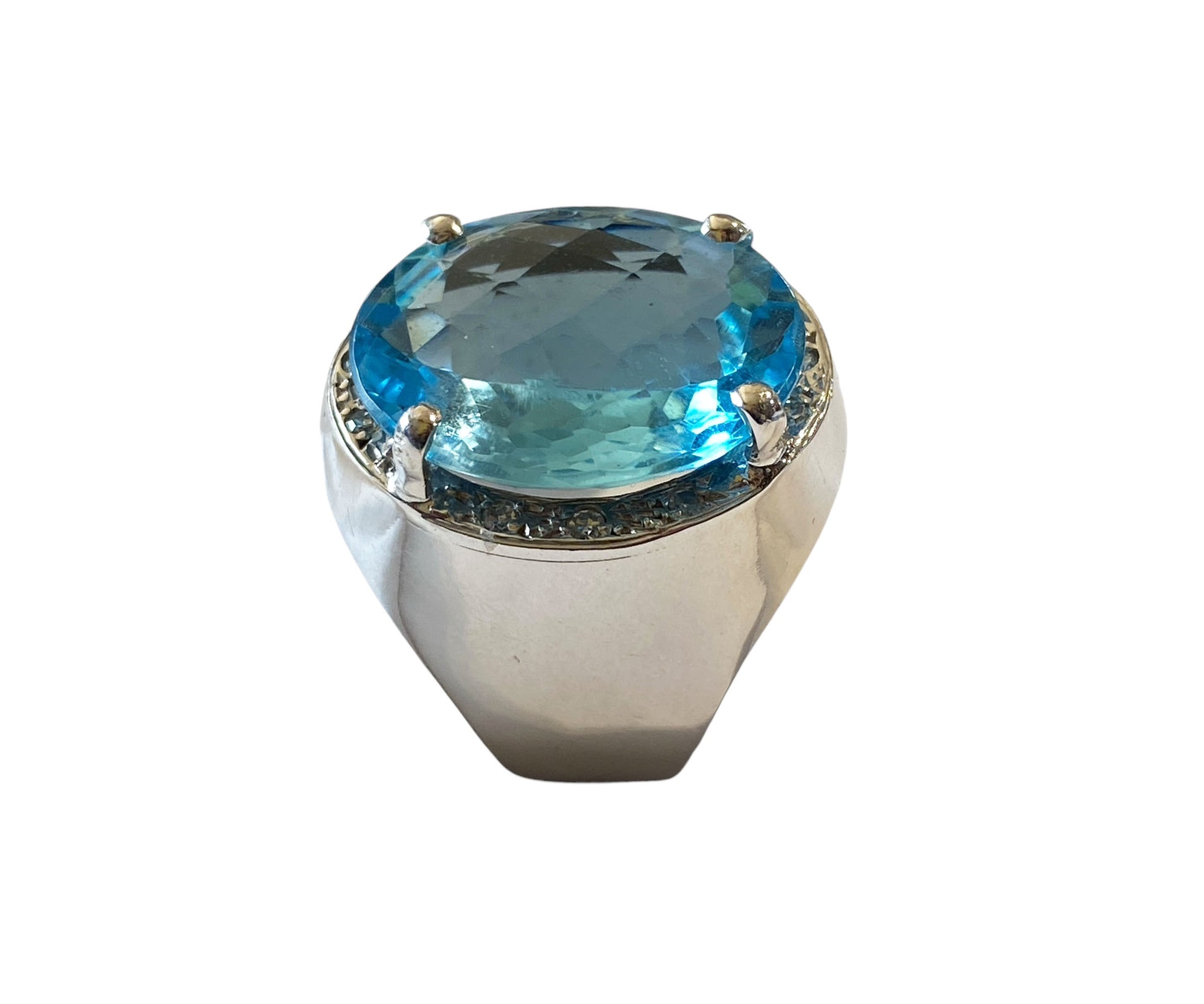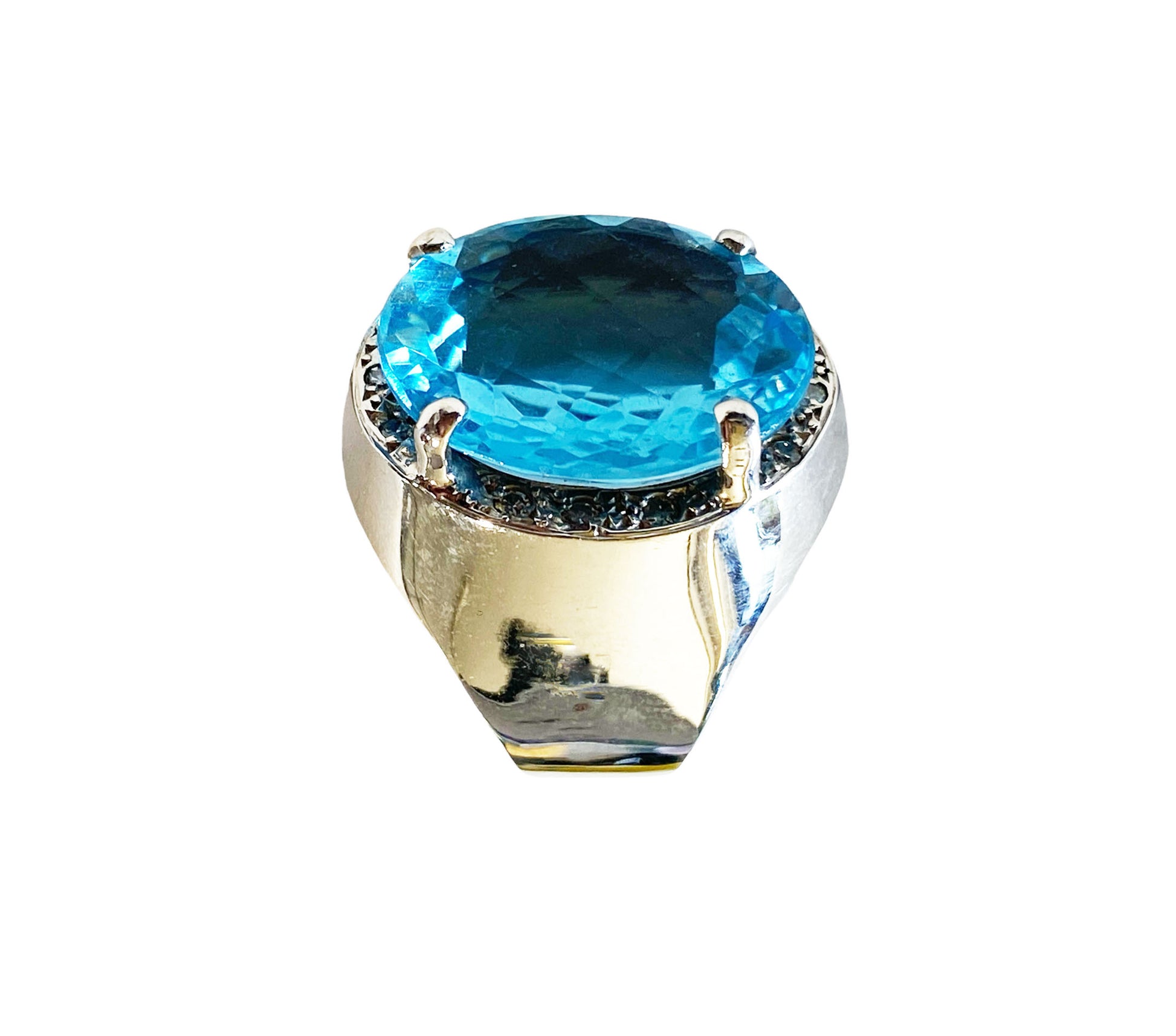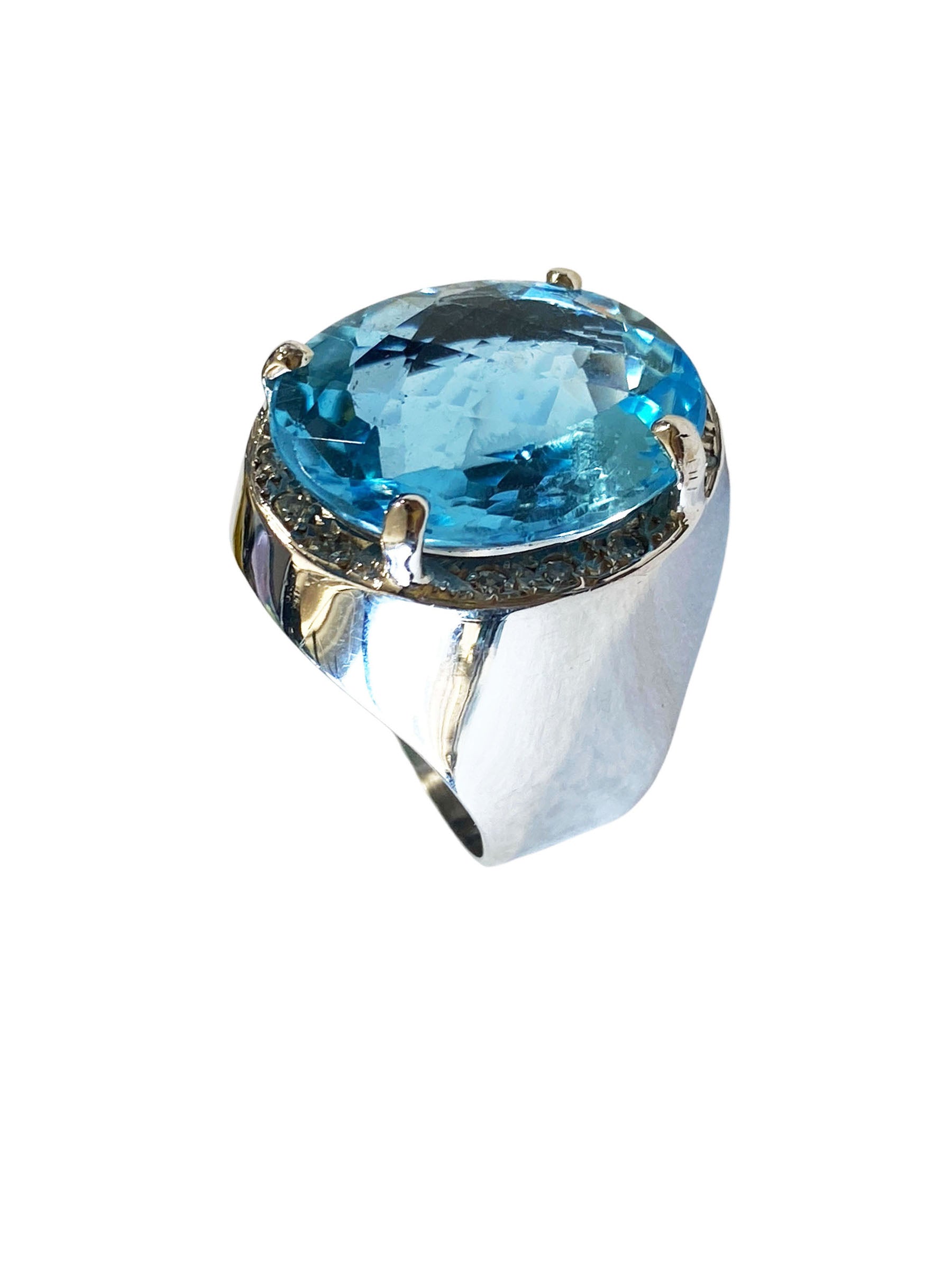 Superb and elegant ladies Blue Topaz and Diamond ring, with 18 k white gold mounting with 14.5 to 5.5 flared mm shanking center 4 prong set with oval checkerboard cut Swiss blue topaz with 18 k 19.5 by 17 by 8.1 mm accented with 12 bead set 1.4 mm o1 point single cut diamonds ,shank pave set with 36 full cut 1.7 mm 01 point diamonds H / SI ,gold weight 10.6 dot /16.48 grams finger size 9